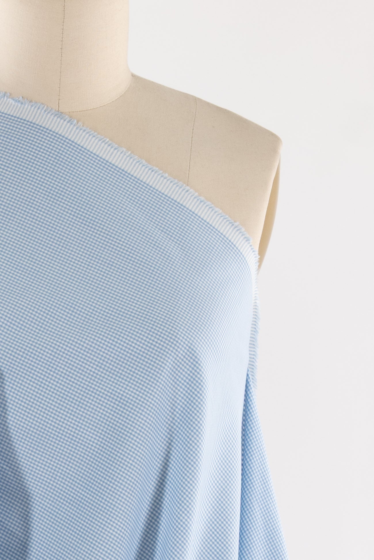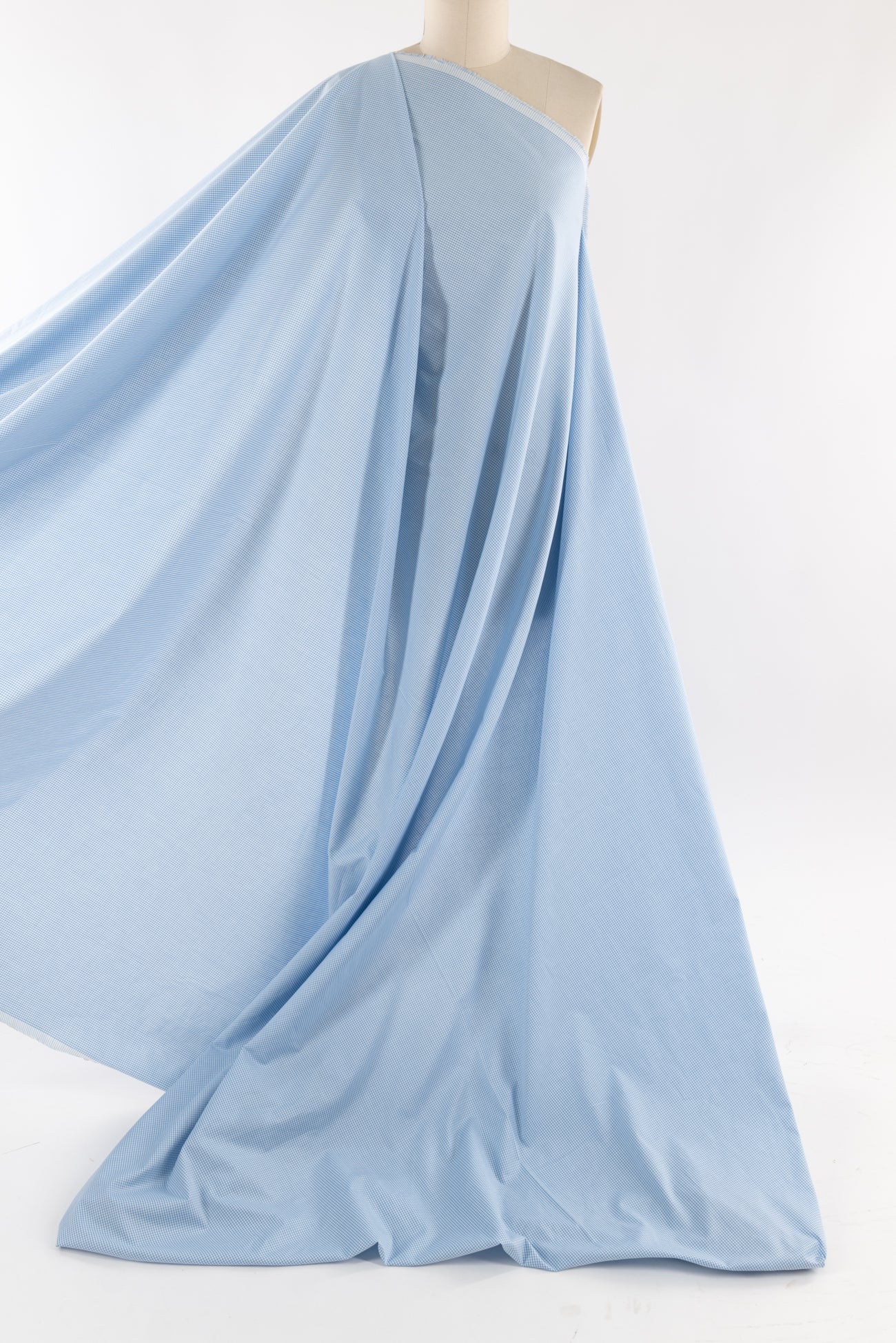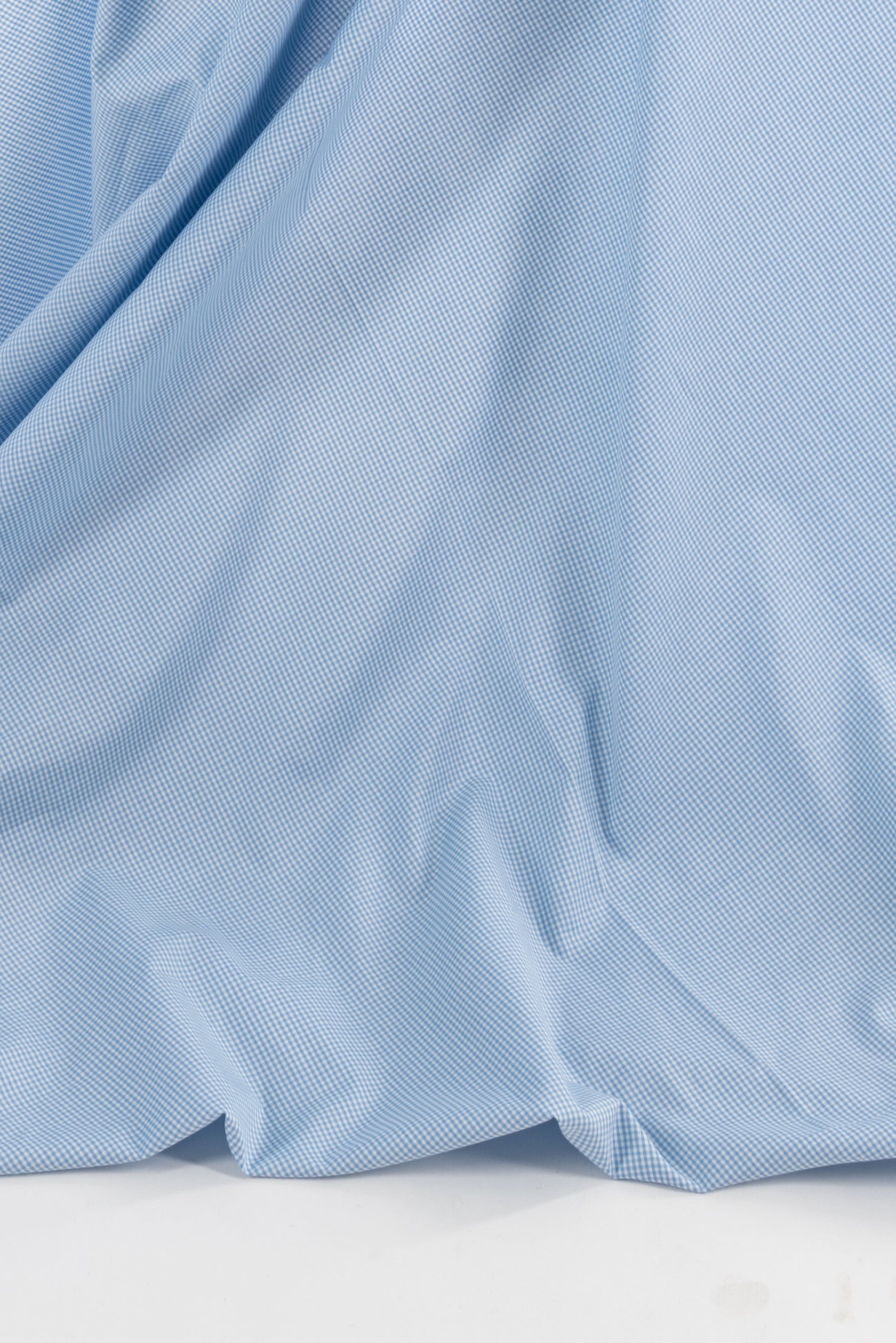 Tiny pale blue and white gingham checks on an impeccable quality cotton woven, deadstock from a NYC designer. Fine grained shirting weight, with an appealing smooth hand and a soft drape. Right for a dress, shirt, tunic, skirt, soft pants, caftan, kimono, children's, or menswear.