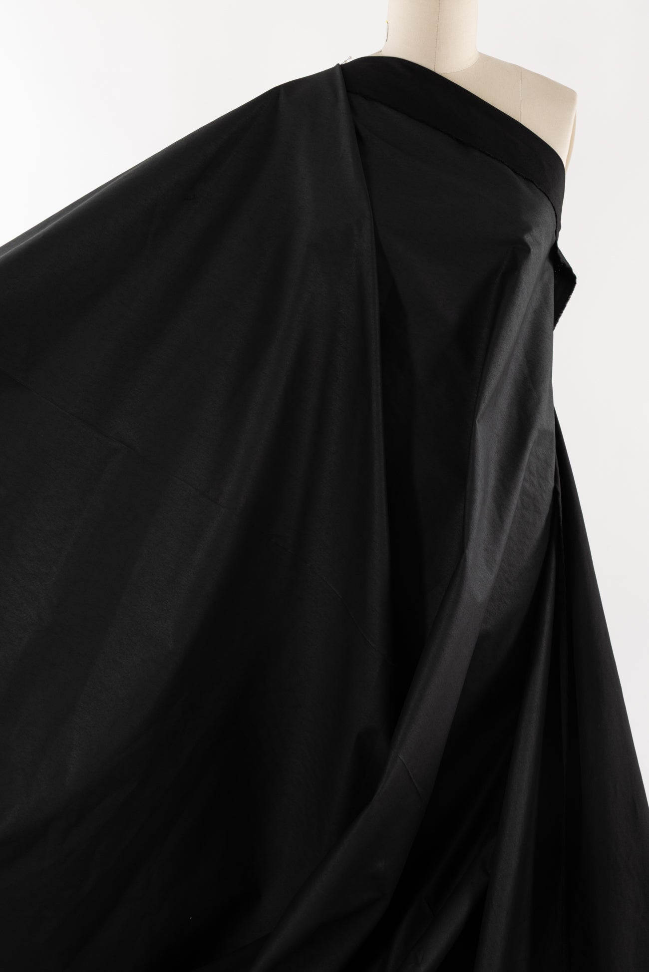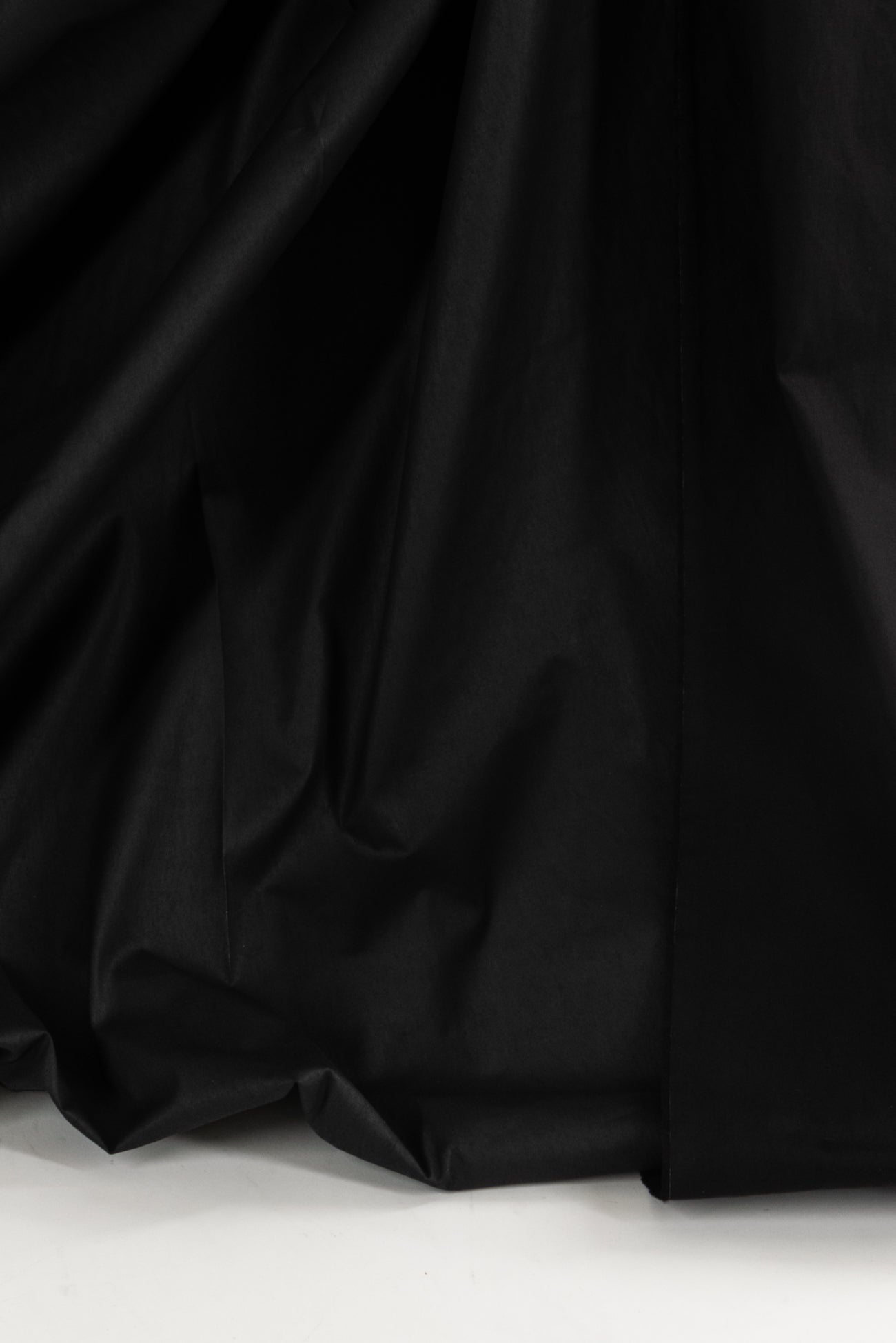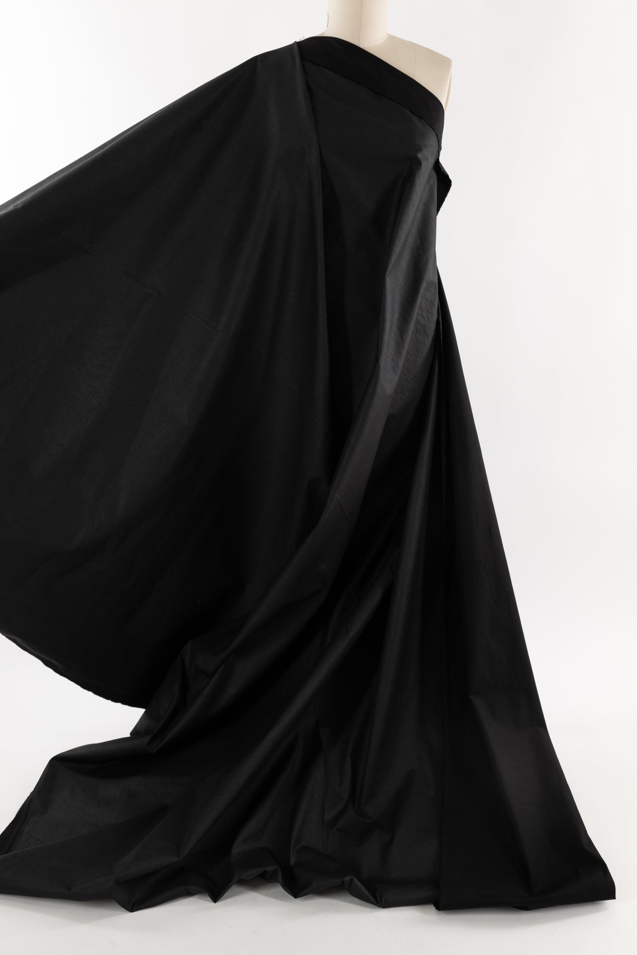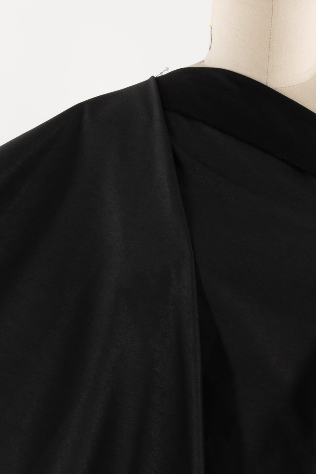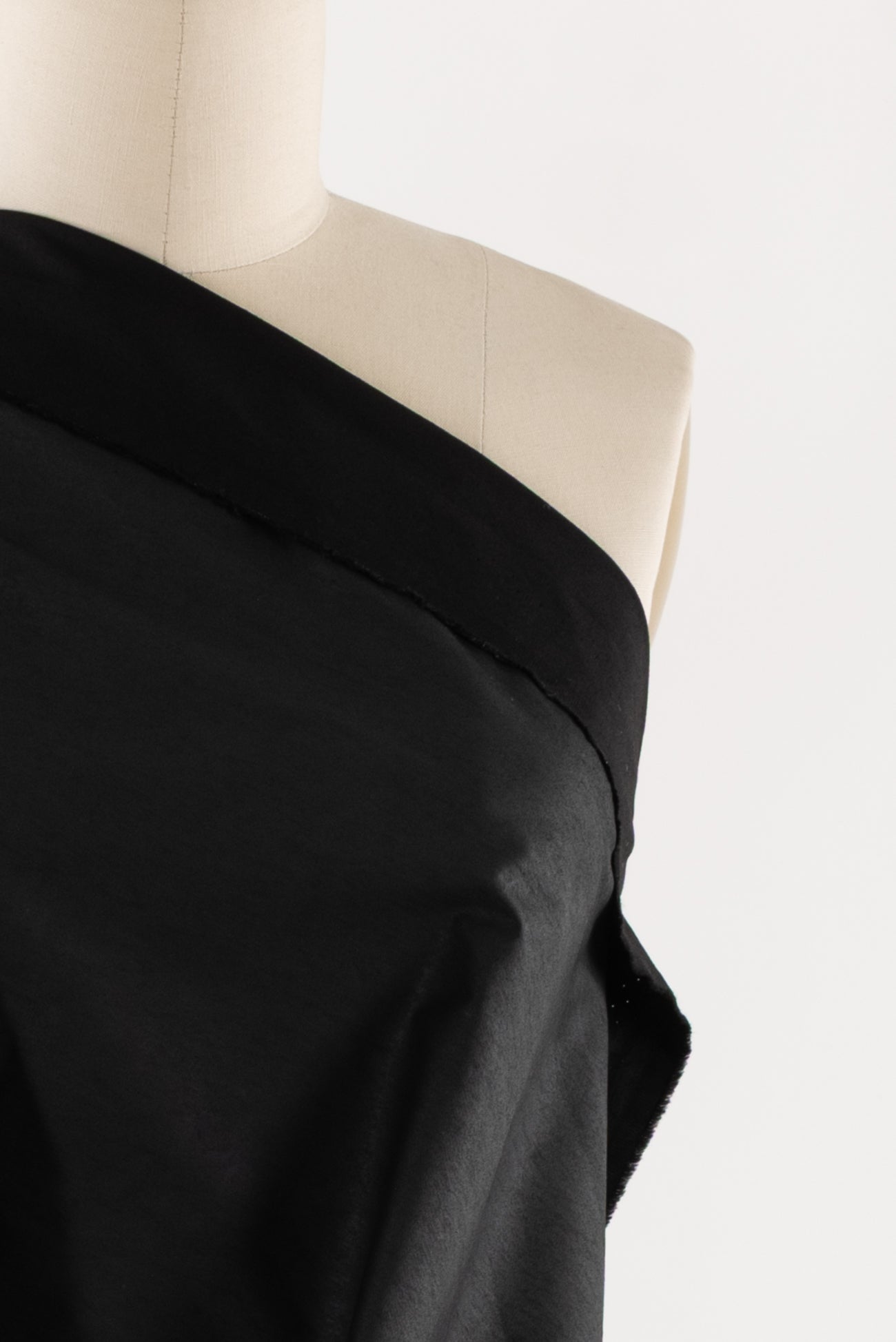 Black-on-black double-sided denim; rich black is overprinted in matte black, deadstock from an LA designer. Mid/light-weight, reversible; the overprinting gives the effect of matte leather, adds just a touch of weight. Use either or both sides, with an appealing, smooth hand and lightly crisp supple drape. No stretch and very nice quality. Right for a jacket, coat, vest, structured pants, jeans, dress or skirt.