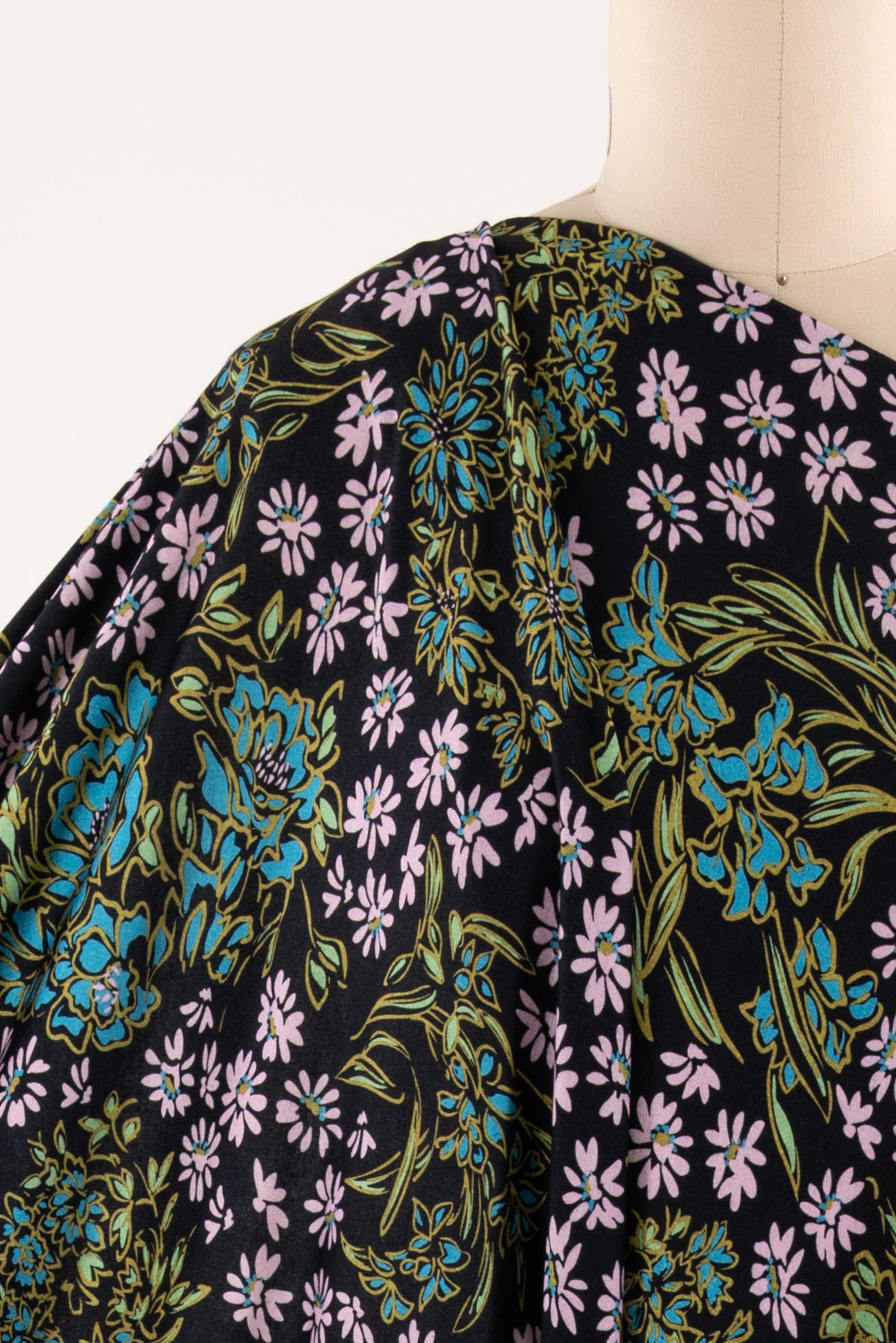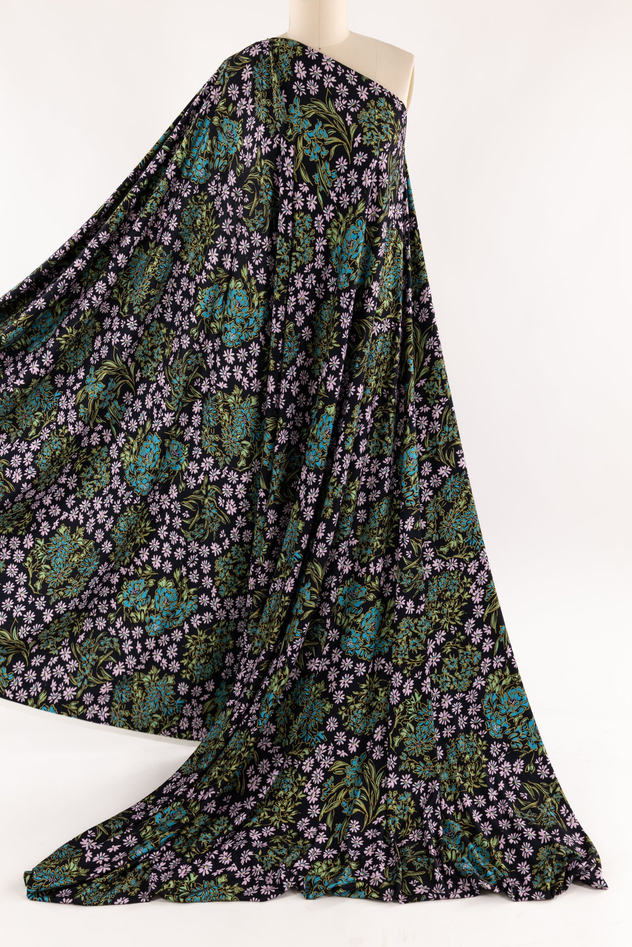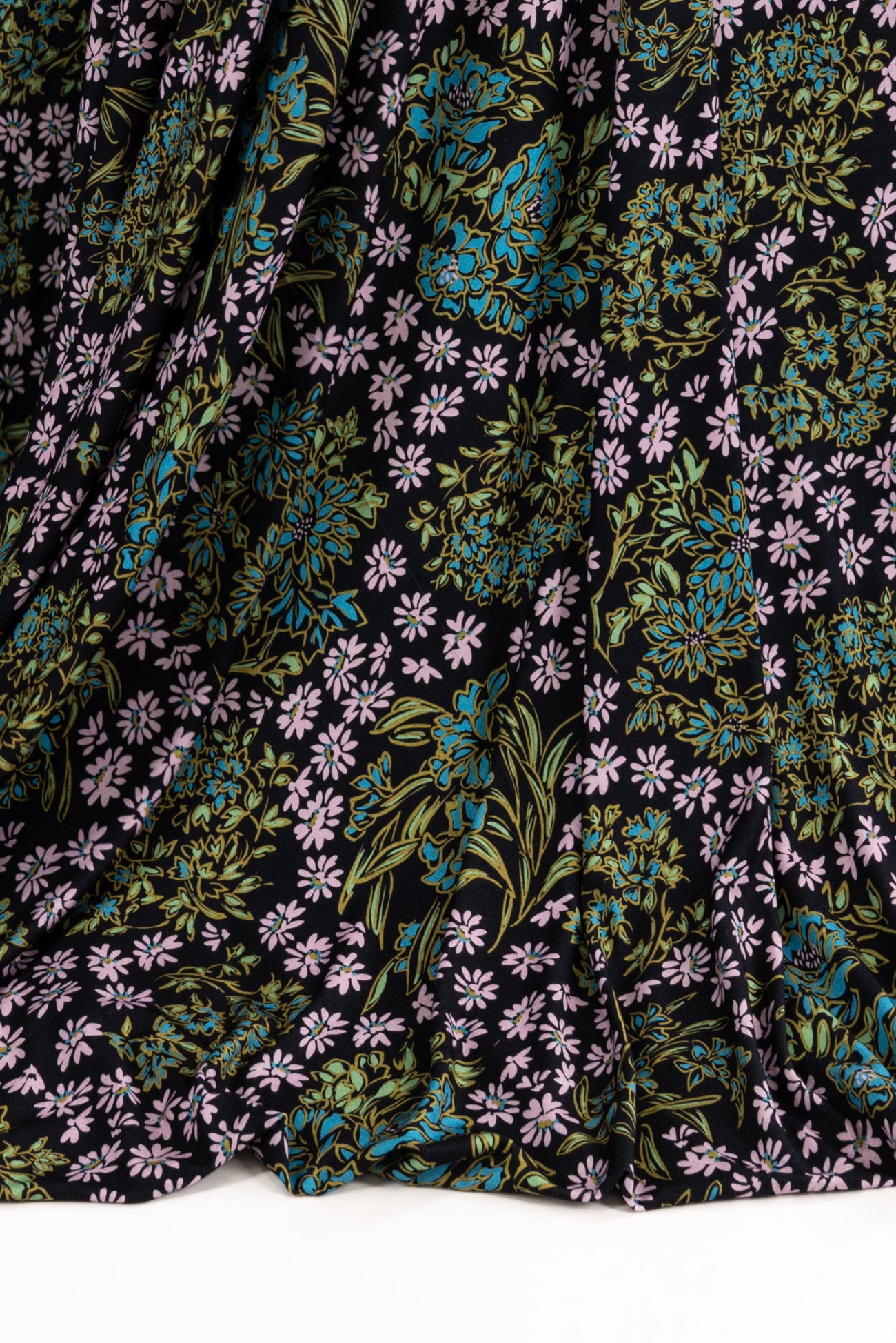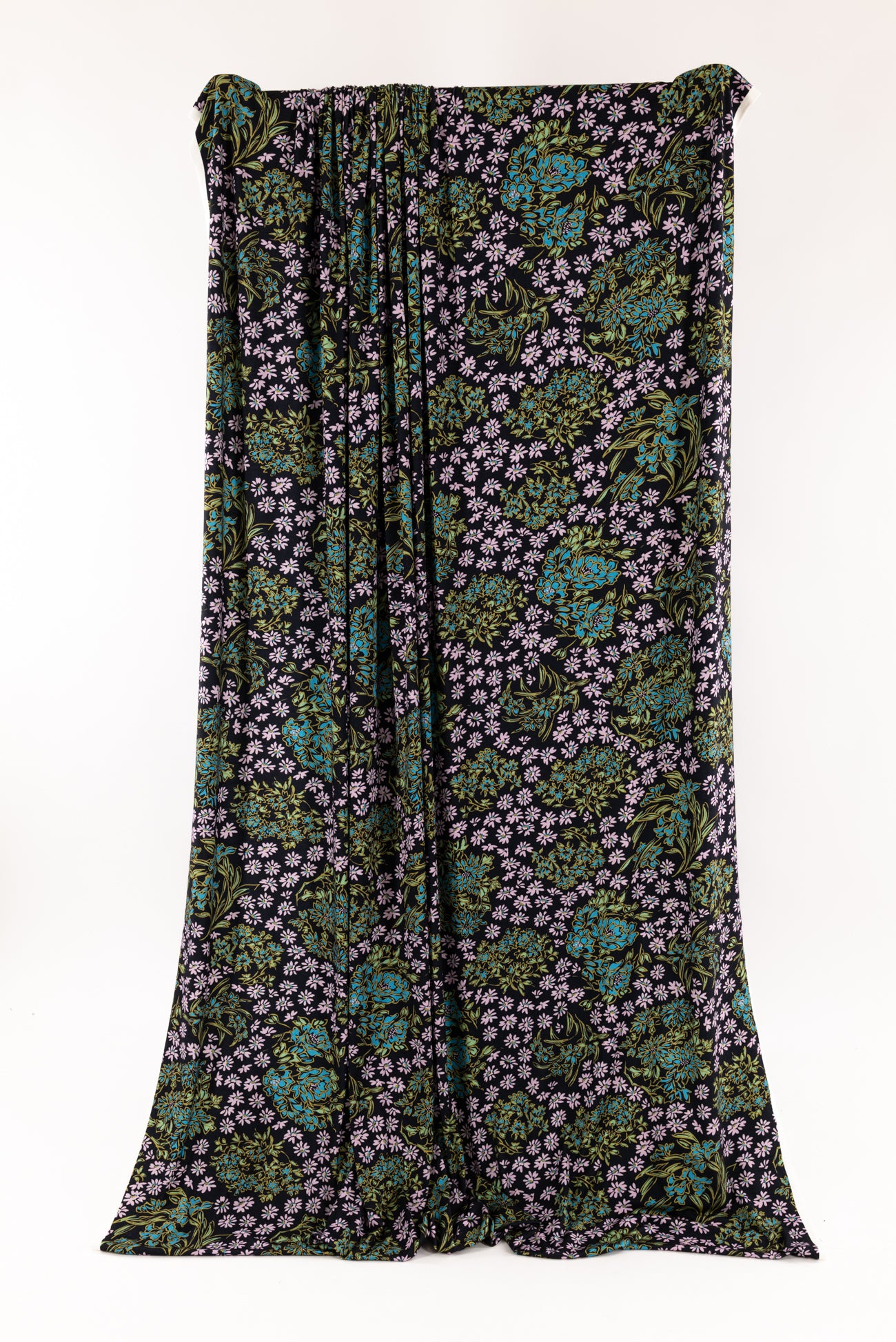Modern multicolored floral on a black background, deadstock from LA designer, Novella Royale (who recently closed their 16 year business). Beautiful quality and weight rayon/spandex jersey - has just a touch more weight than most, opaque, with a soft, smooth, matte hand, 4 way stretch, minimal rolling at the cut edge. Right for a dress, skirt, tunic, t-shirt, soft pants, leggings, caftan, kimono, jumpsuit. One way design, 22" repeat.