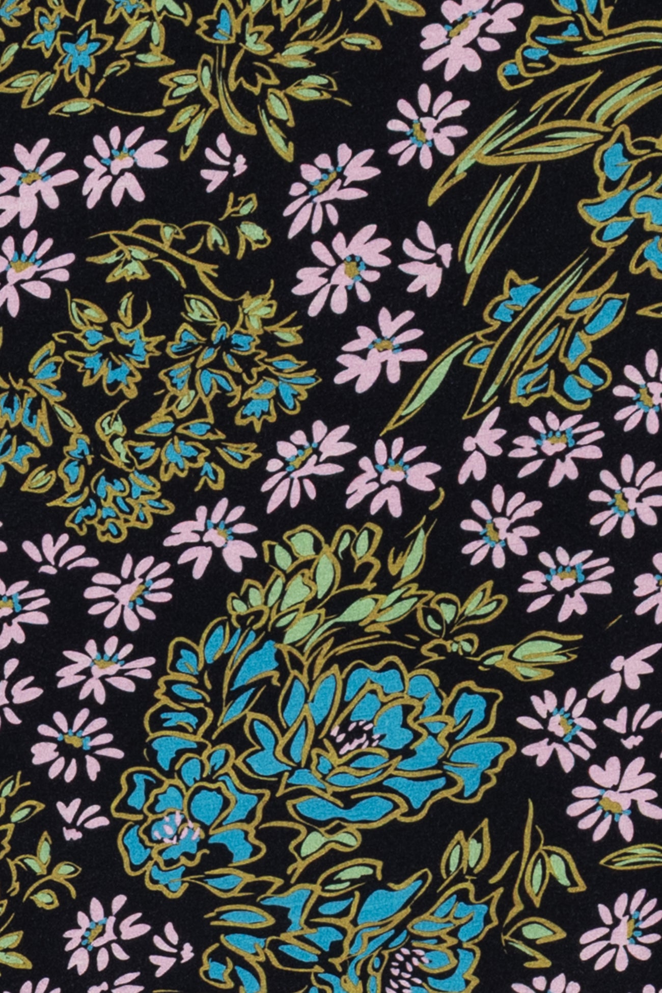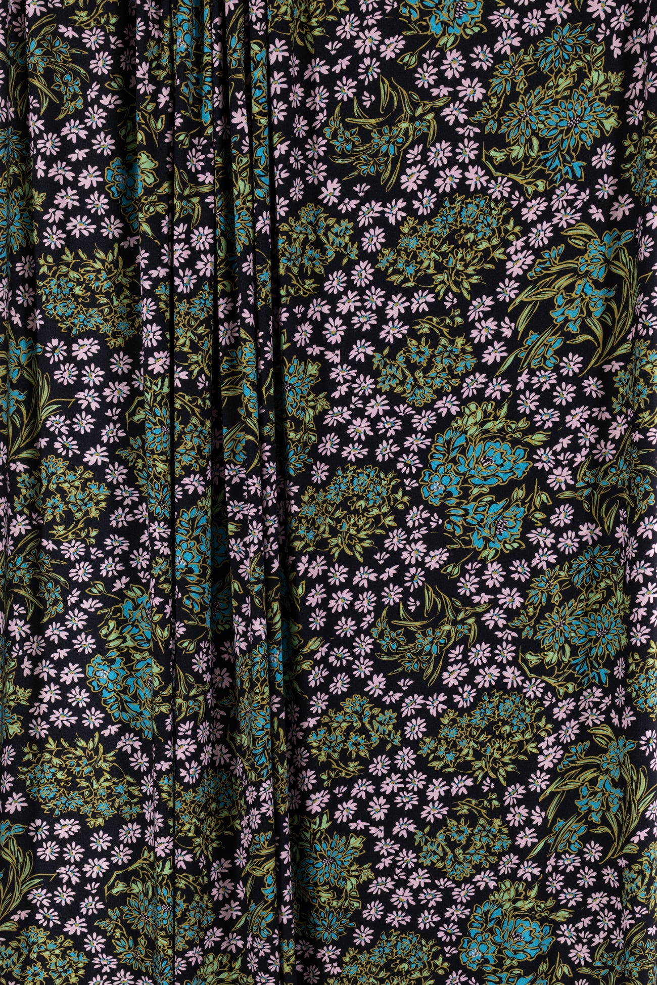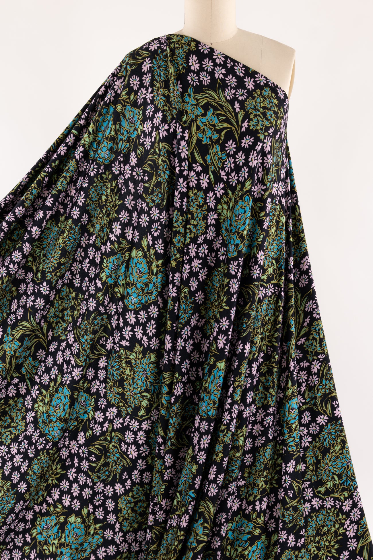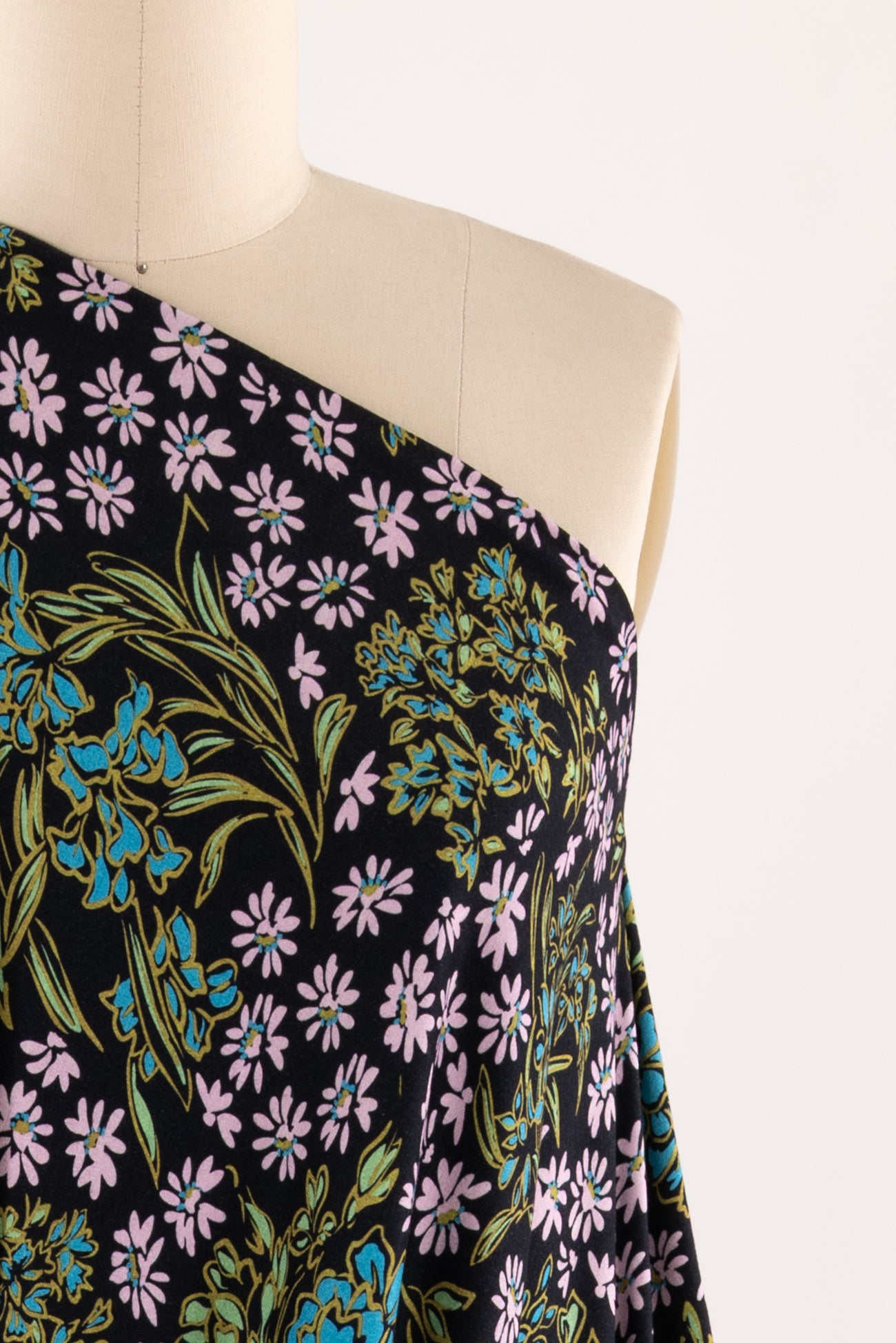 Modern multicolored floral on a black background, deadstock from LA designer, Novella Royale (who recently closed their 16 year business). Beautiful quality and weight rayon/spandex jersey - has just a touch more weight than most, opaque, with a soft, smooth, matte hand, 4 way stretch, minimal rolling at the cut edge. Right for a dress, skirt, tunic, t-shirt, soft pants, leggings, caftan, kimono, jumpsuit. One way design, 22" repeat.