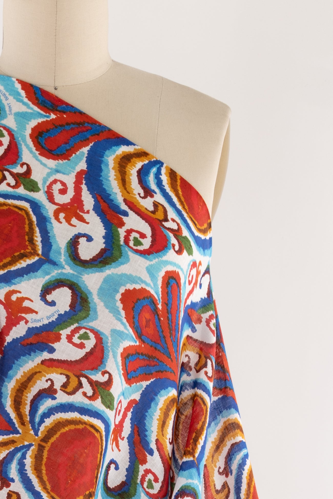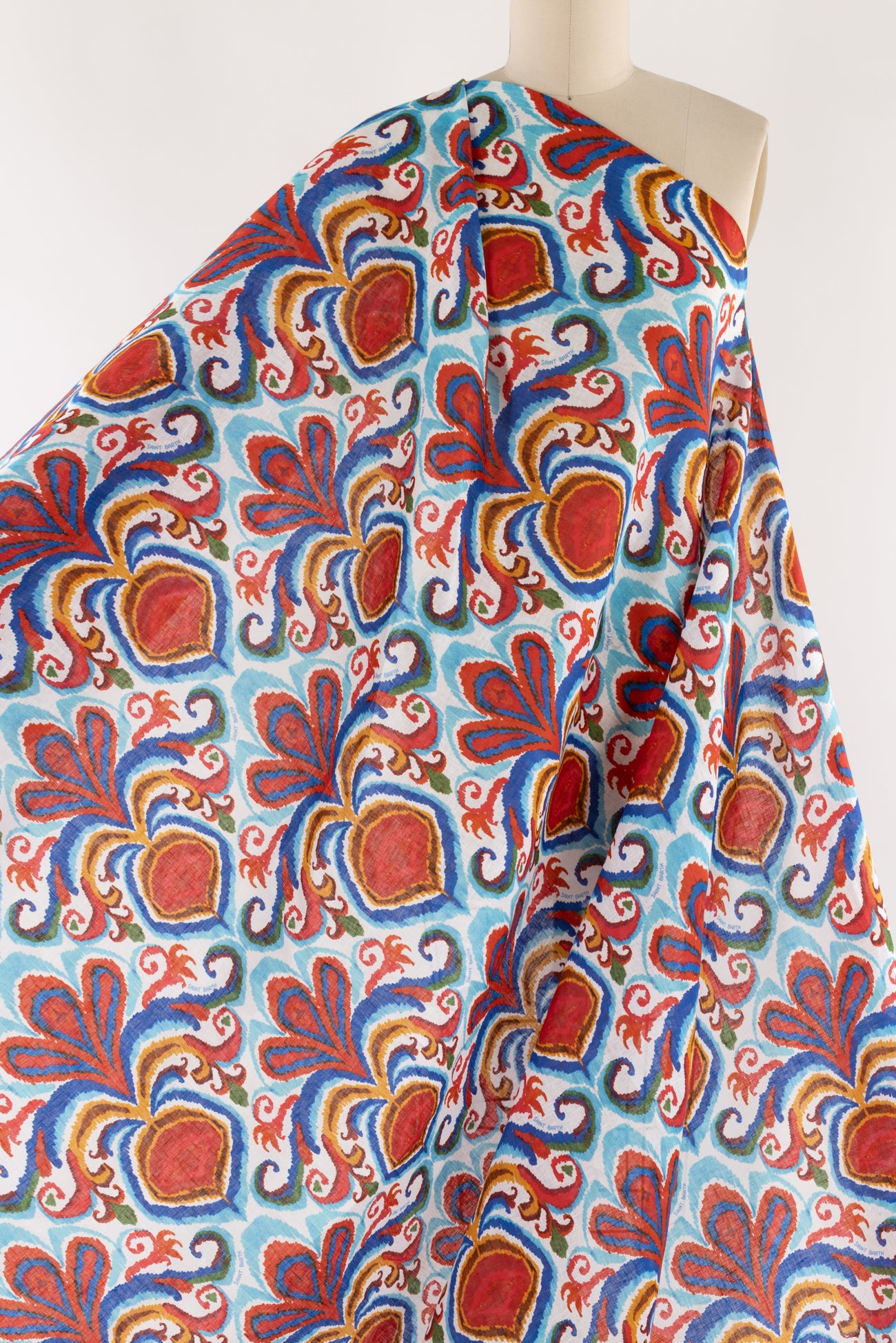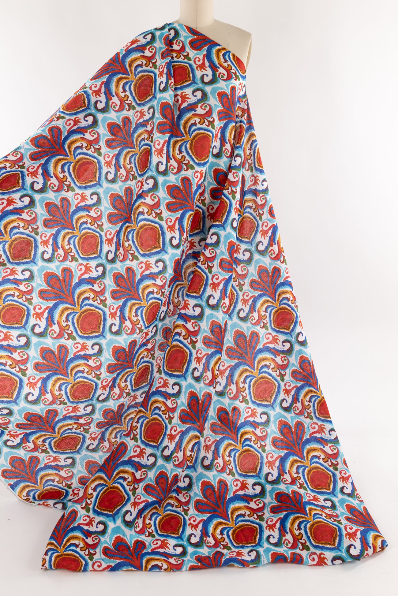 Striking stylized botanical in shades of blue and red on a fine white linen woven, beautiful deadstock from boho chic brand MC2 Saint Barth, milled in Italy. Lightweight, with a smooth linen hand, a 13" repeat, and soft airy drape. Right for a shirt, blouse, dress, tunic, skirt, soft pant, caftan, or kimono.