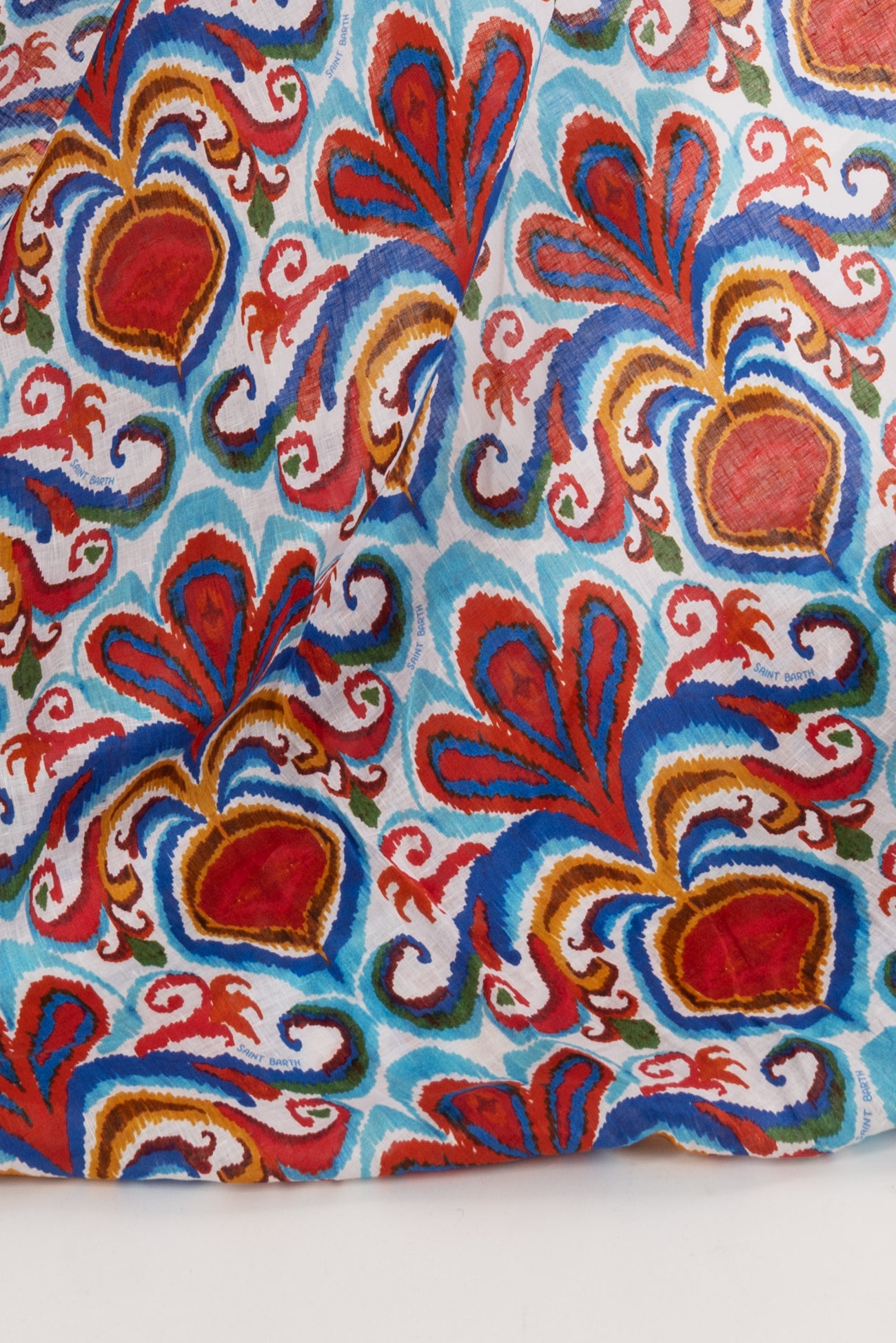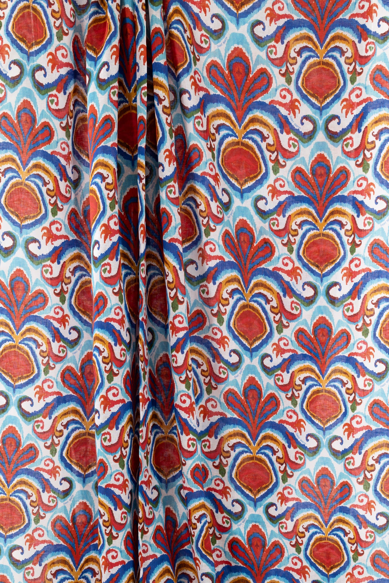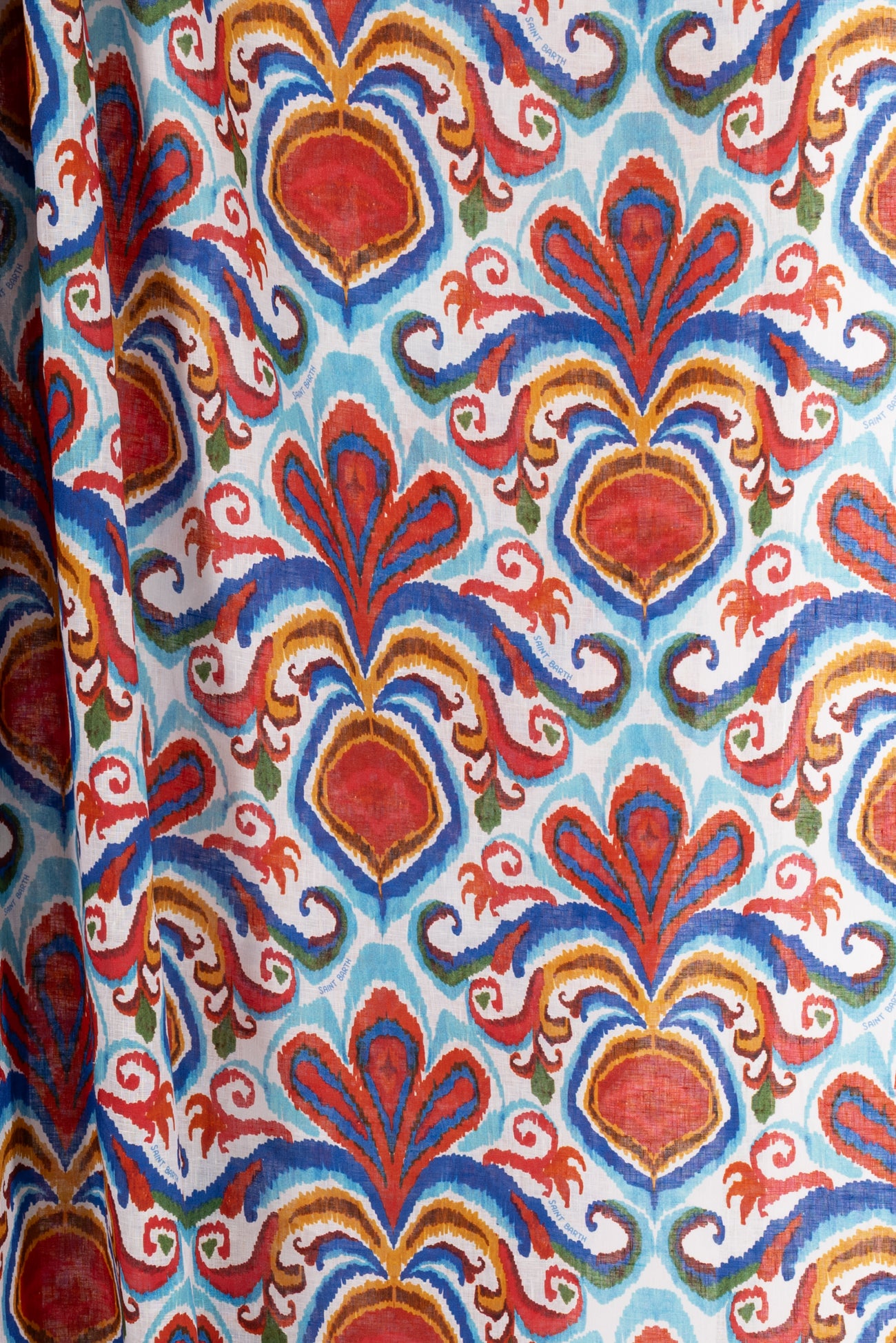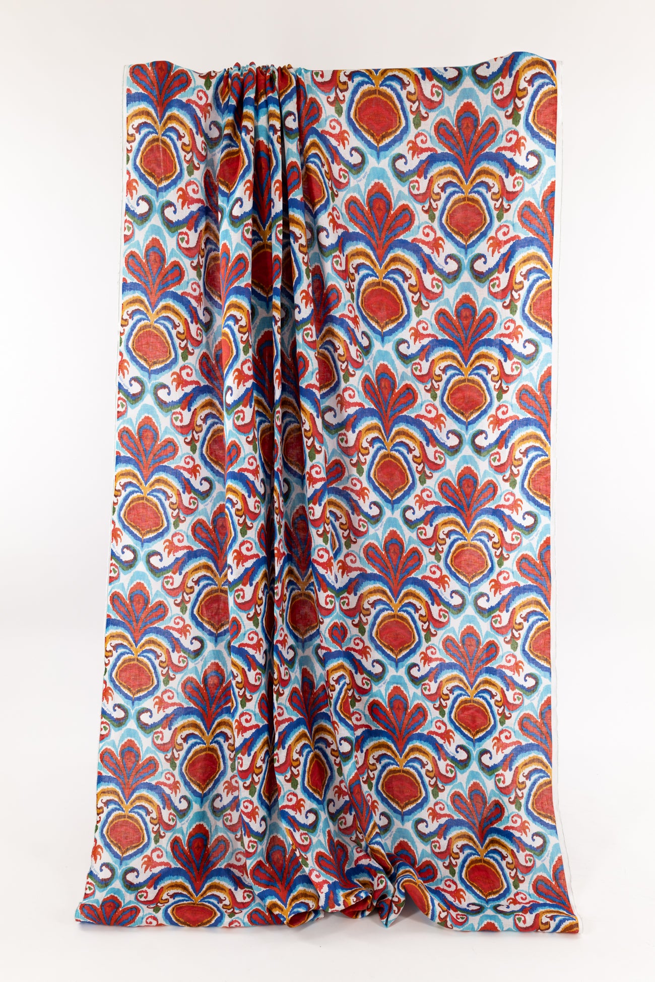 Striking stylized botanical in shades of blue and red on a fine white linen woven, beautiful deadstock from boho chic brand MC2 Saint Barth, milled in Italy. Lightweight, with a smooth linen hand, a 13" repeat, and soft airy drape. Right for a shirt, blouse, dress, tunic, skirt, soft pant, caftan, or kimono.