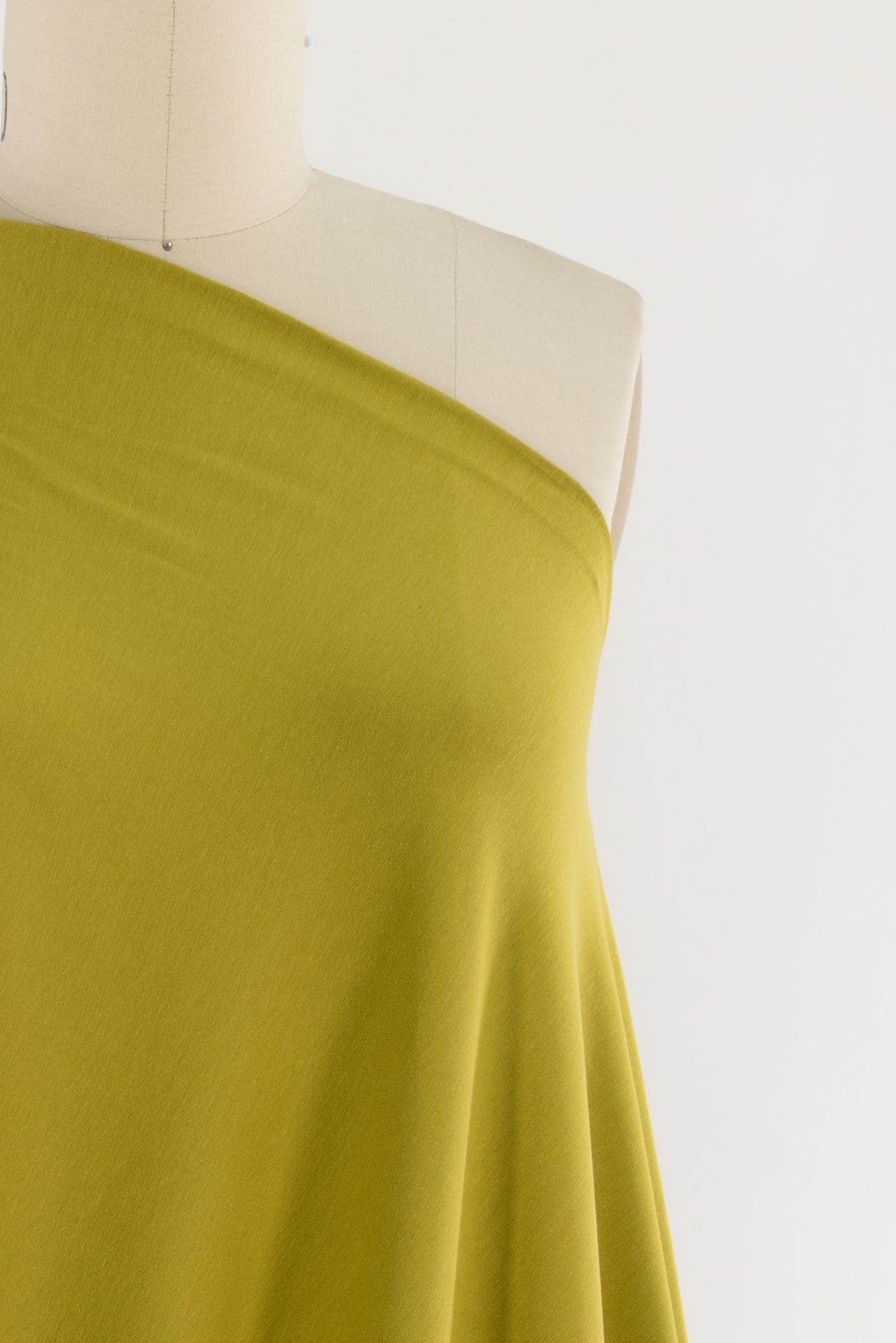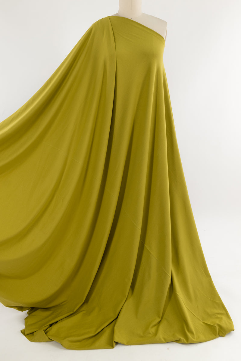 Lovely lichen green on an impeccable European quality cotton/spandex jersey knit, produced in Denmark. Light/mid-weight, opaque, and will skim the body in a flattering way. It has a soft, smooth texture, fluid drape, 4-way stretch, and some rolling at the cut edge. Right for a variety of garments: t-shirt, tunic, dress, soft pants, leggings, cardigan, skirt, or lounge-wear, as well as children's and men's clothing. Oeko-Tex® certified.