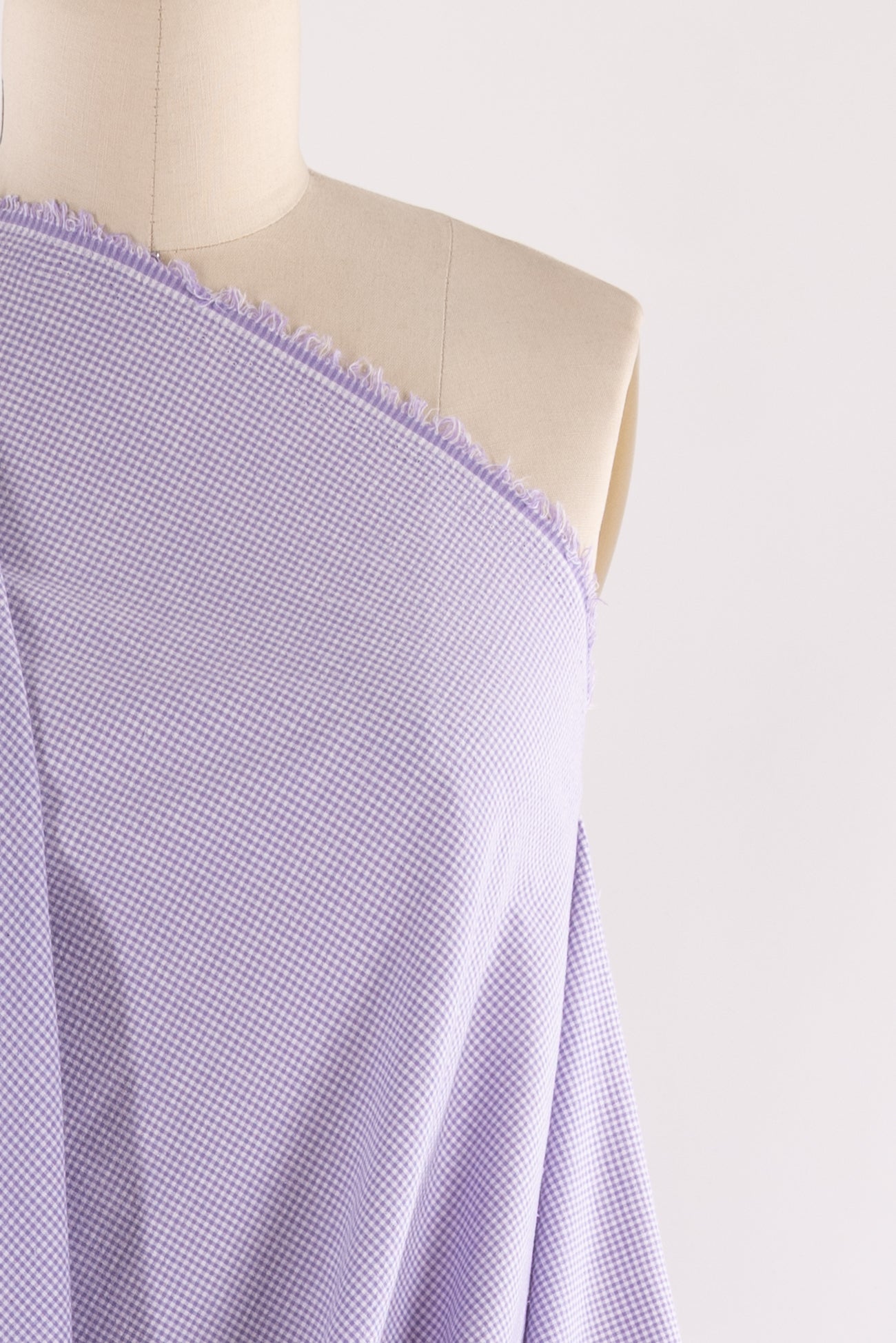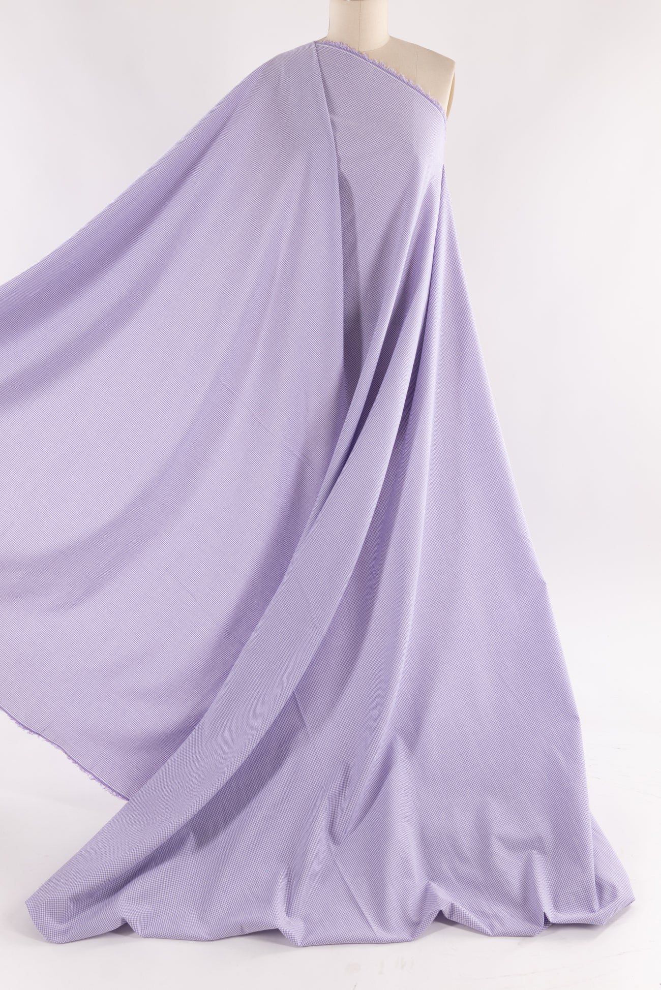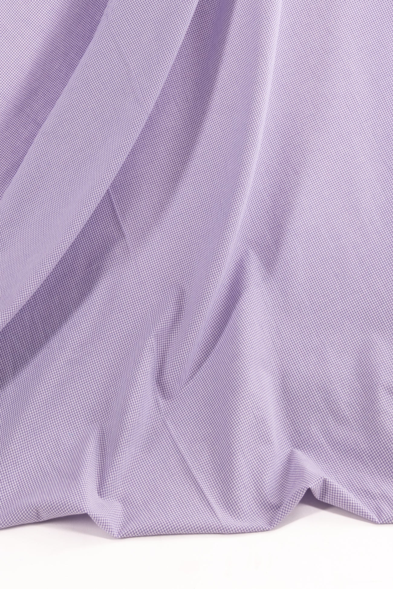 Tiny lilac and white yarn-dyed gingham checks on an impeccable quality cotton woven, deadstock from a NYC designer. Fine shirting weight, with an appealing lightly textured seersucker like hand and a soft drape. Right for a dress, shirt, tunic, skirt, soft pants, caftan, kimono, children's, or menswear.