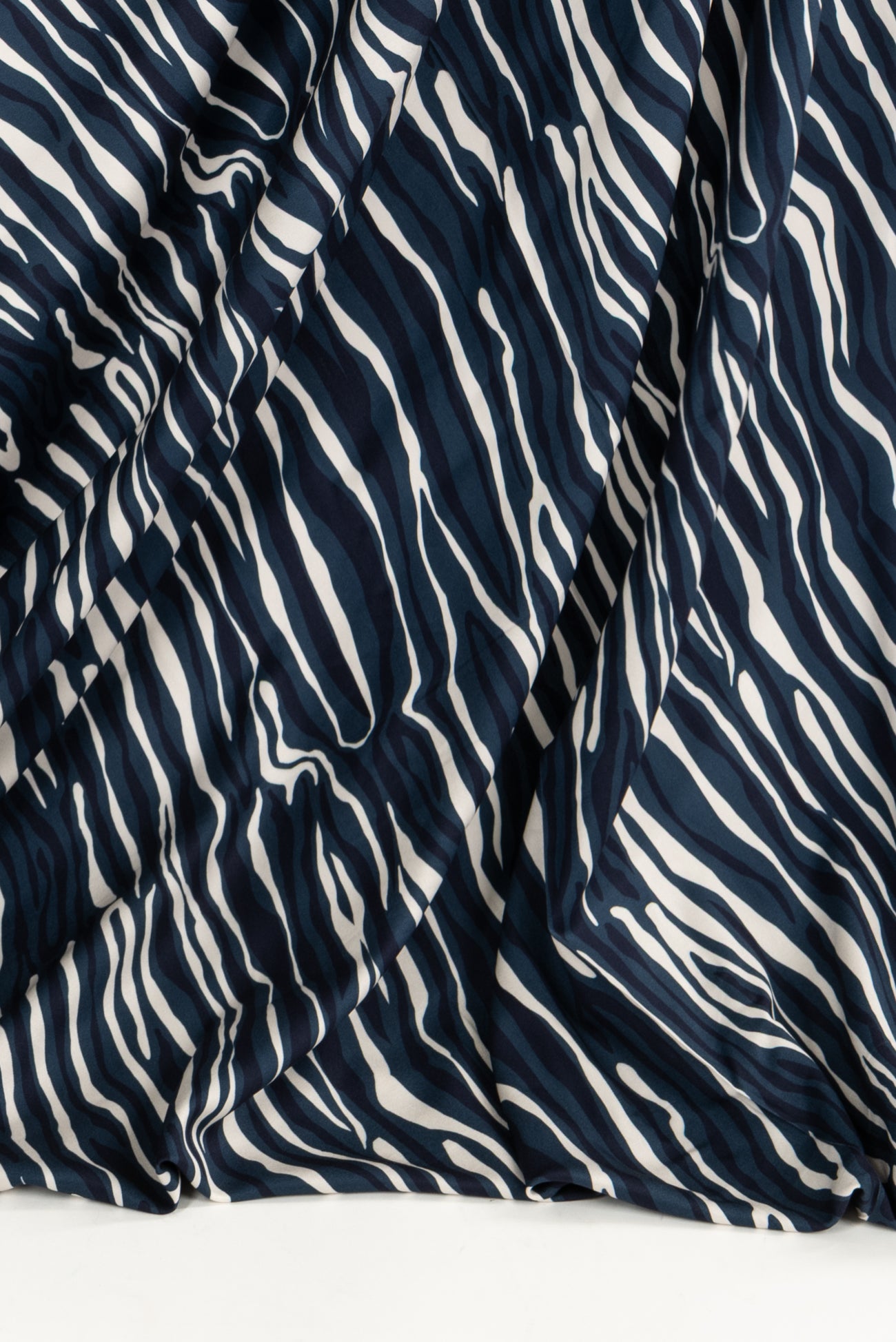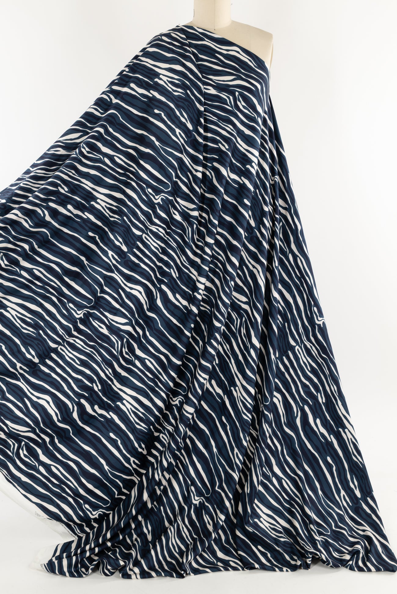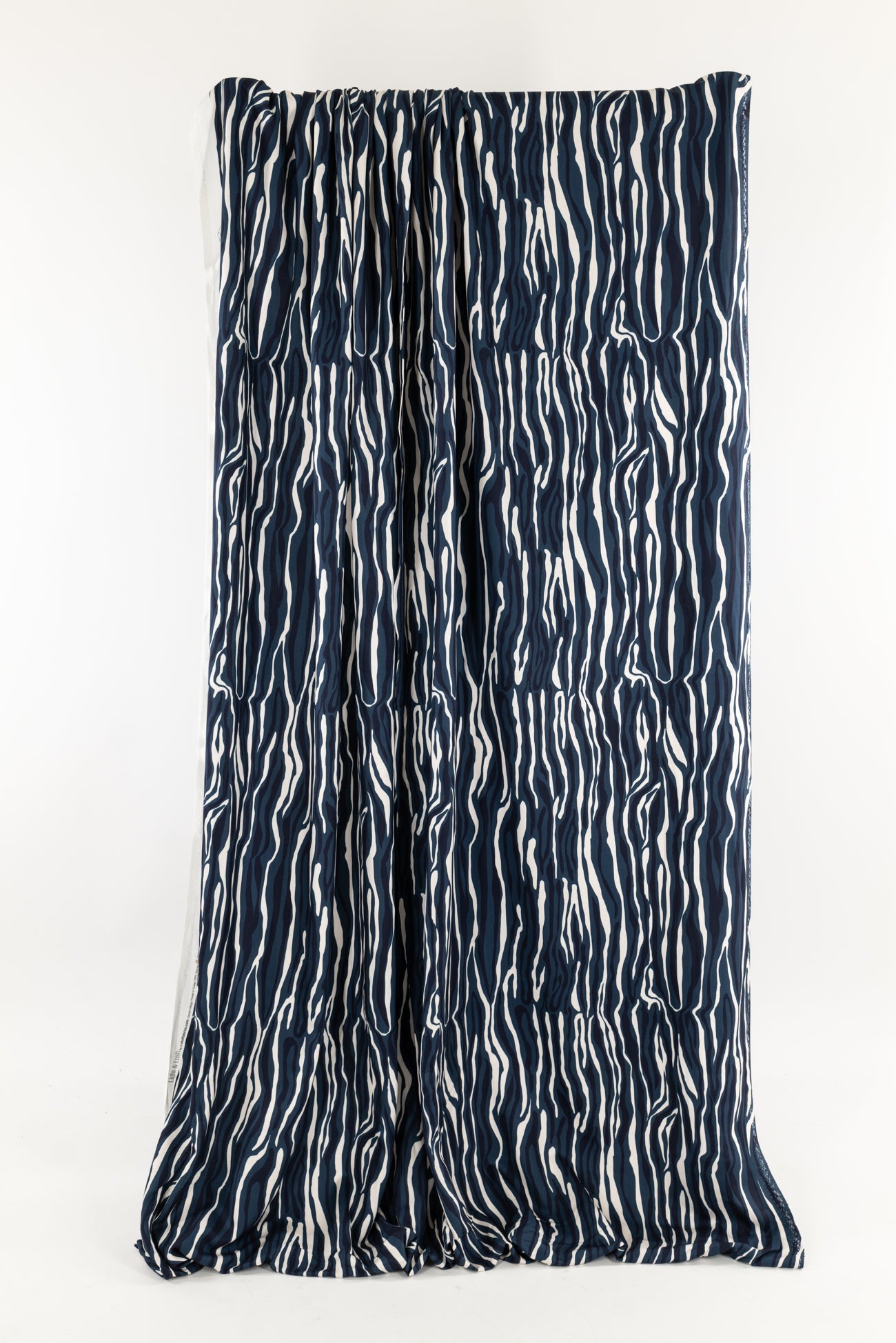 Chic curvilinear stripy graphic in blue, navy and white, in a gorgeous digital print on an impeccable European quality viscose woven, produced in Denmark. Light/mid-weight, opaque, and will skim the body in a flattering way. It has a soft smooth hand, 18¼" repeat. and fluid drape. Right for a dress, shirt, soft pants, blouse, tunic, skirt, caftan, loungewear, men's or children's. Oeko-Tex® certified.