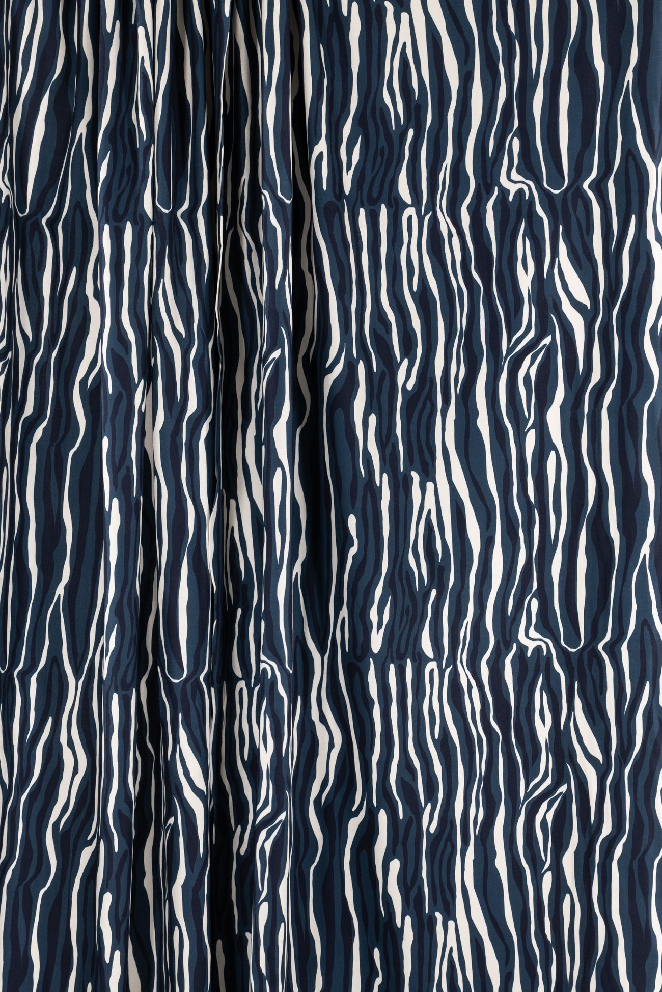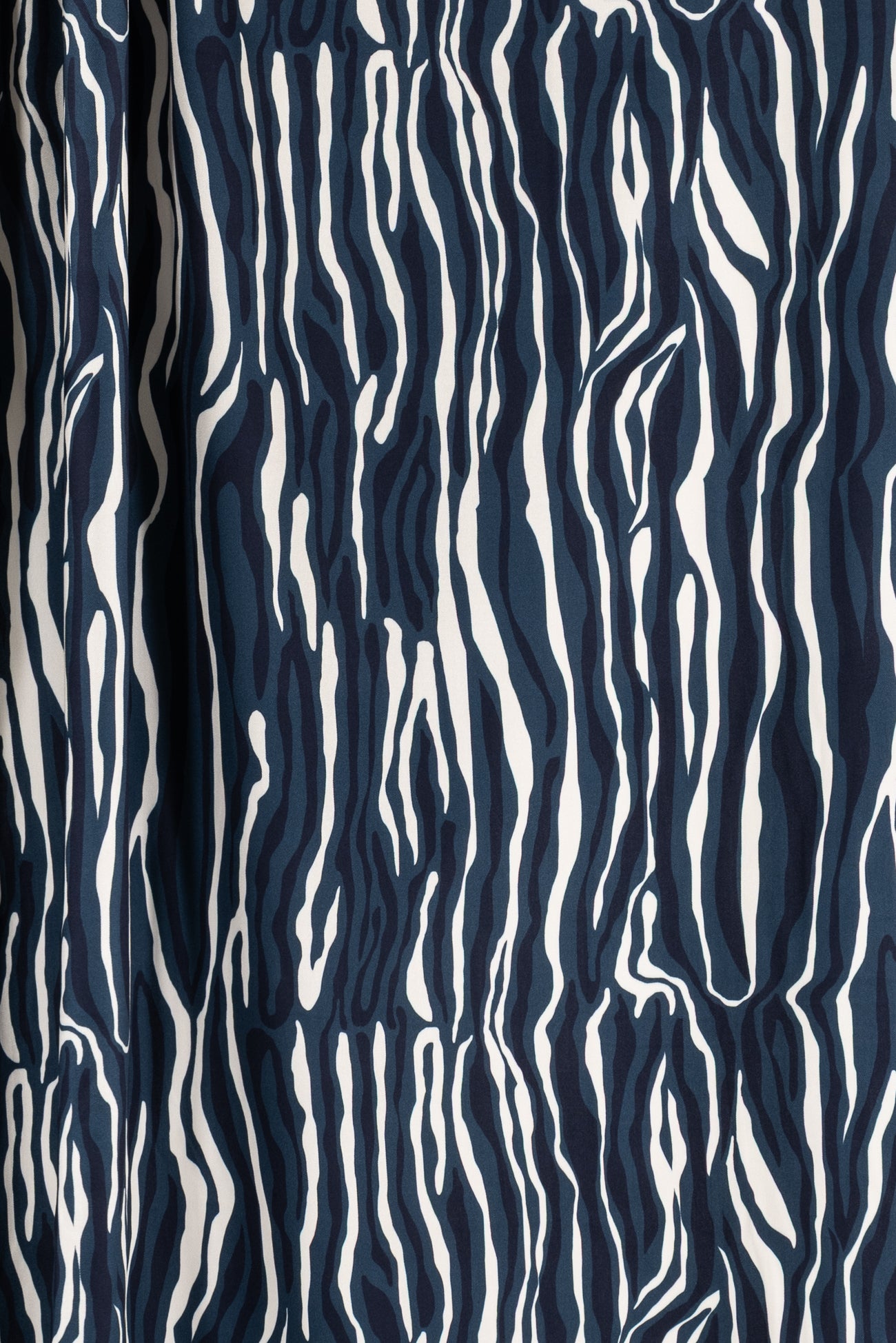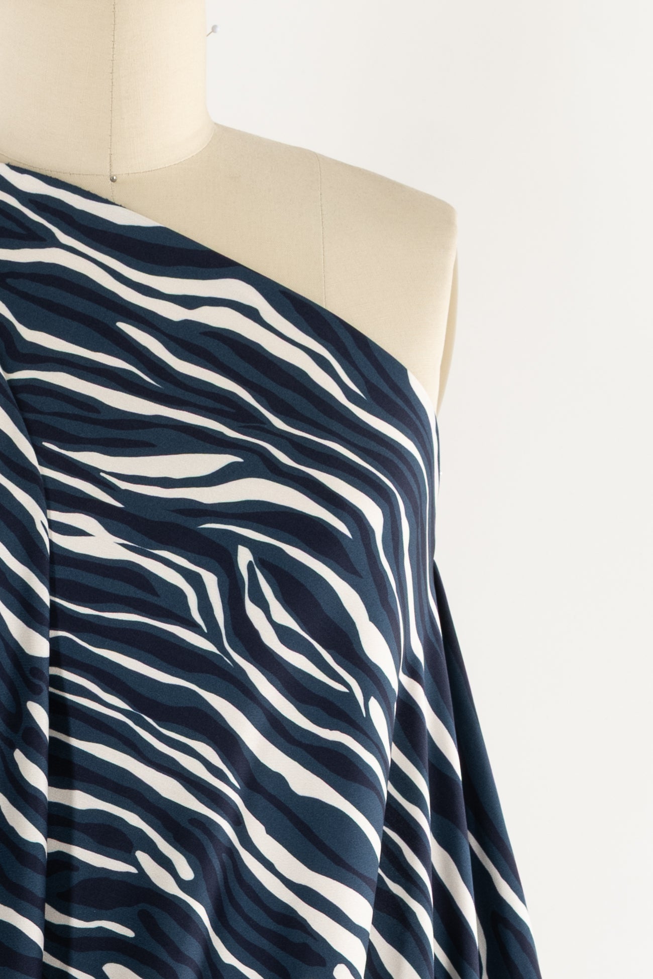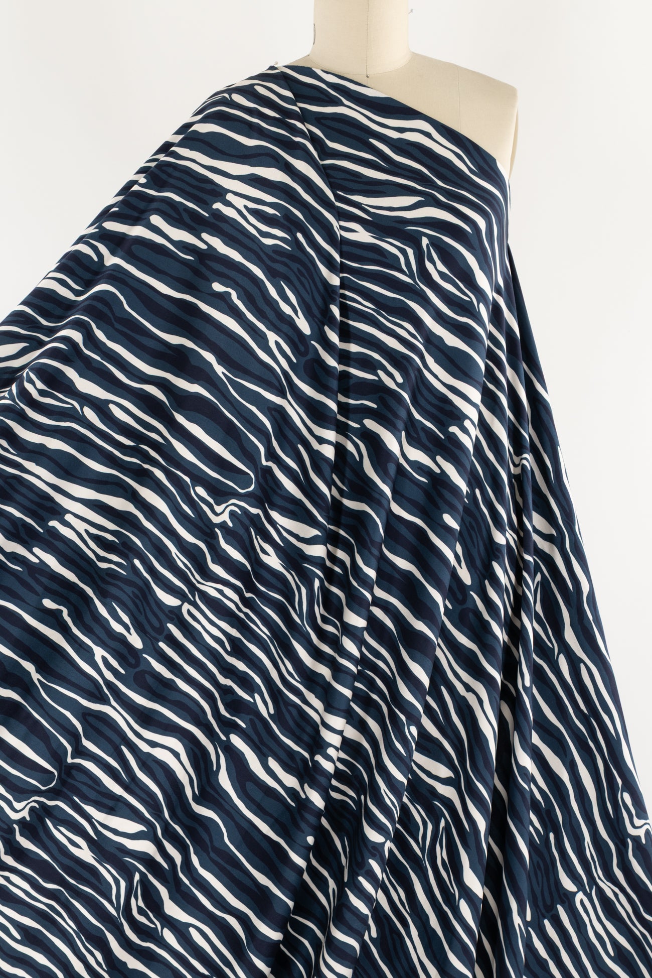 Chic curvilinear stripy graphic in blue, navy and white, in a gorgeous digital print on an impeccable European quality viscose woven, produced in Denmark. Light/mid-weight, opaque, and will skim the body in a flattering way. It has a soft smooth hand, 18¼" repeat. and fluid drape. Right for a dress, shirt, soft pants, blouse, tunic, skirt, caftan, loungewear, men's or children's. Oeko-Tex® certified.