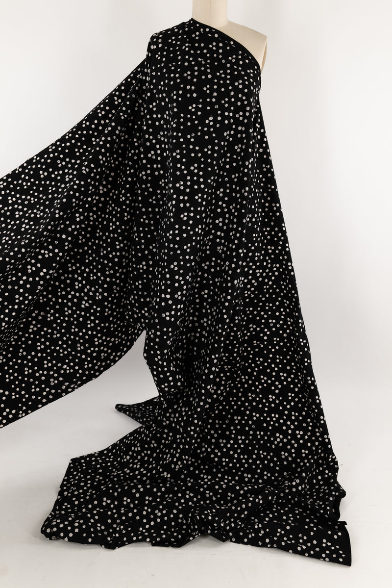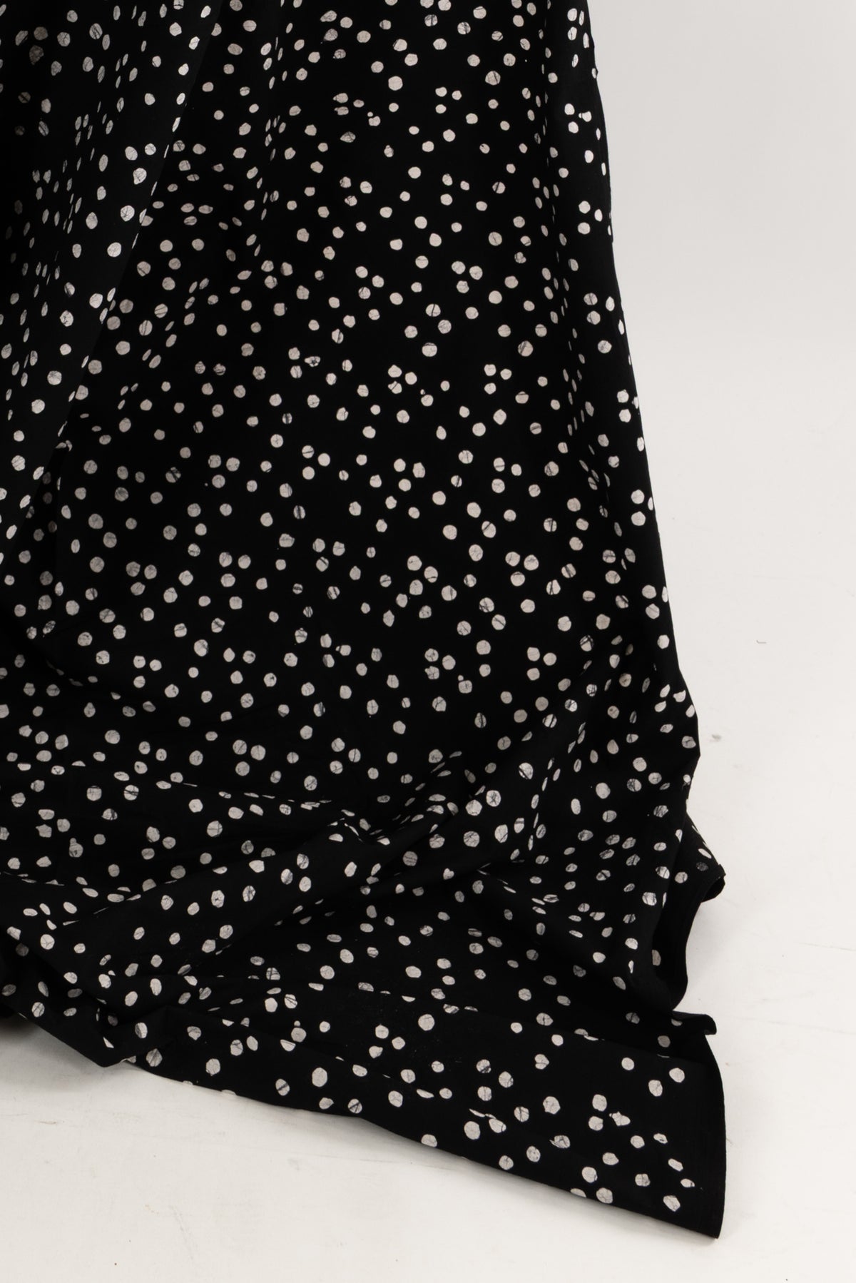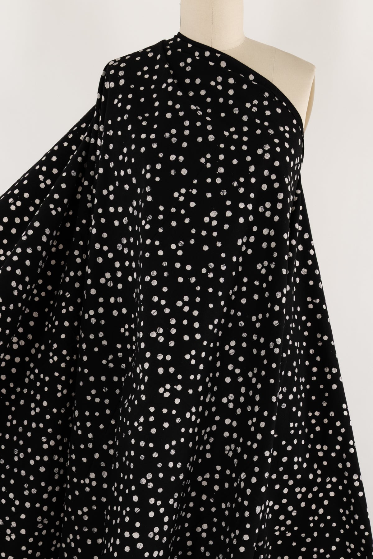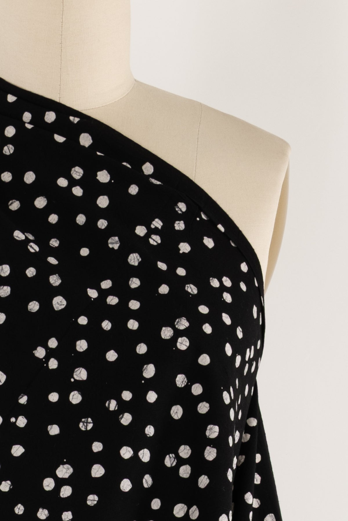 Beautiful quality hand-batiked cotton in black with all over smallish gray/white dots. Lightly textured, opaque, with an appealing cool dry hand and lightly crisp drape. The light/mid-weight is right for a shirt, tunic, blouse, dress, skirt, soft pants, jumpsuit, kimono, caftan, light jacket, vest, men's, or children's. Also great for quilting, home dec, and crafting.
