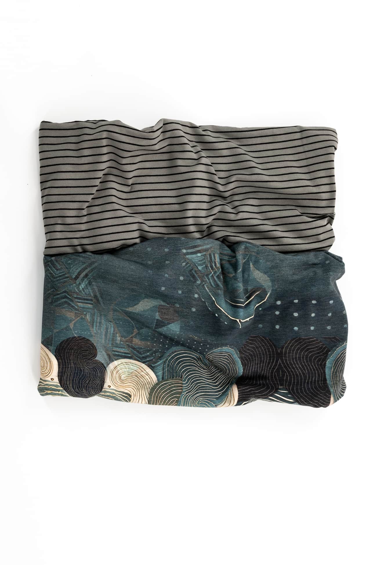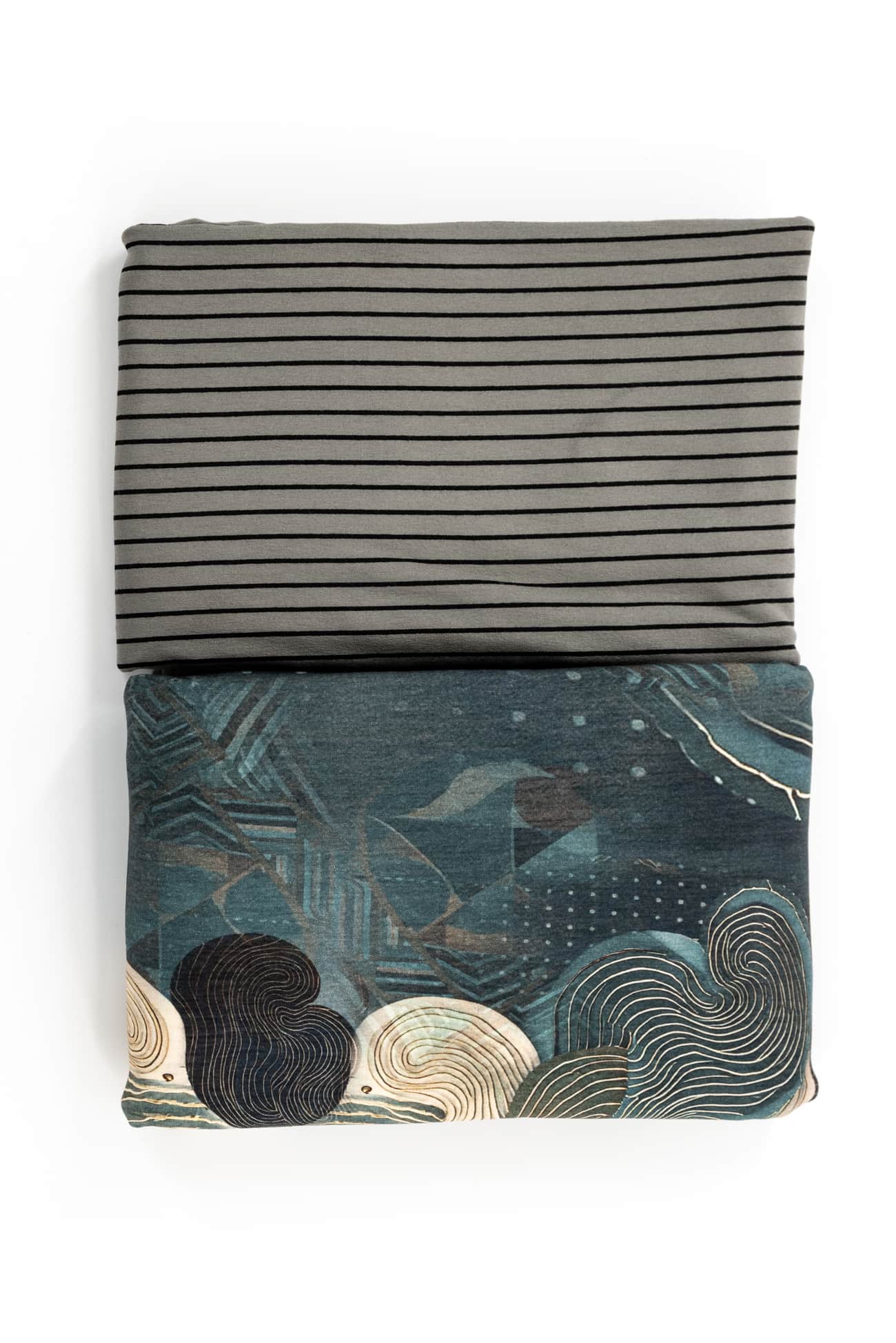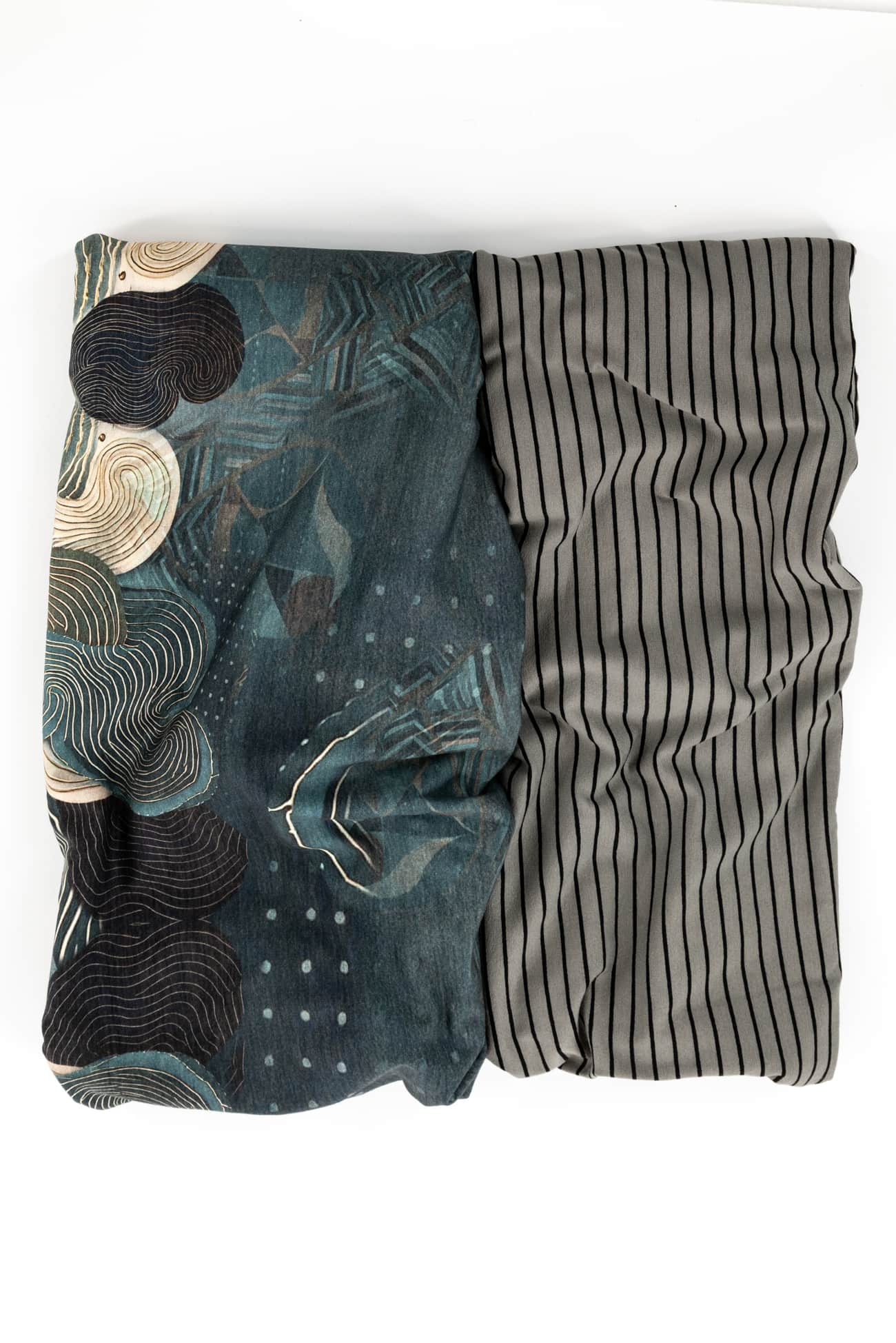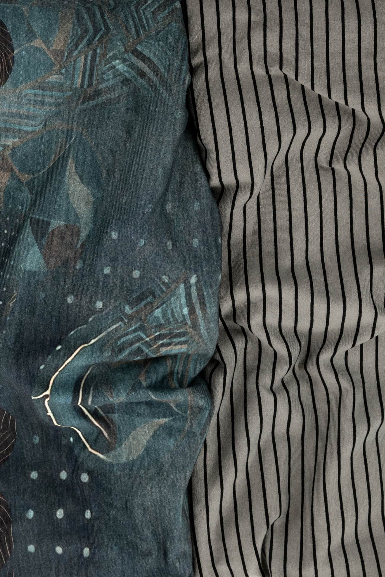 The MARAIS combo combines two harmonious knits in soft teal/green tones; an abstract geometric European digital cotton/spandex knit that combines well with a celadon green and black rayon/spandex stripe made in the USA. The two fabrics harmonize and blend beautifully together. Buttery soft with a liquid drape, four-way stretch and just a touch of rolling at the cut edge. The light/mid-weight is right for a top, t-shirt, tunic, cardi, hoodie, dress or skirt.