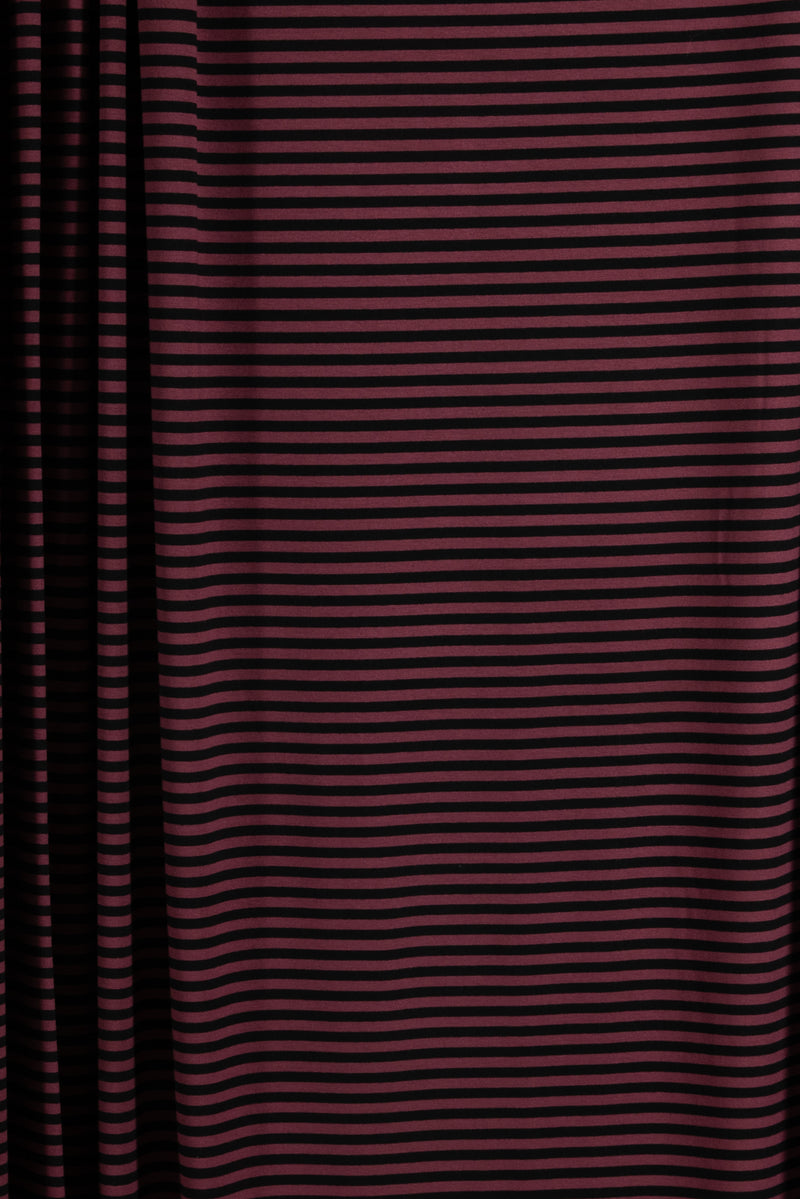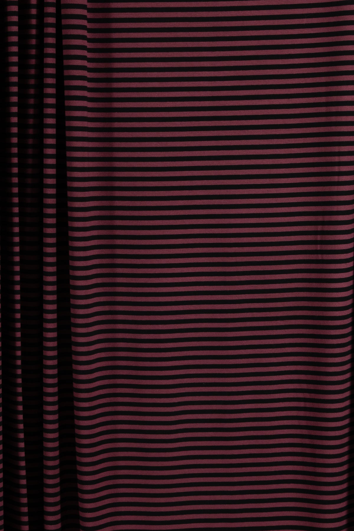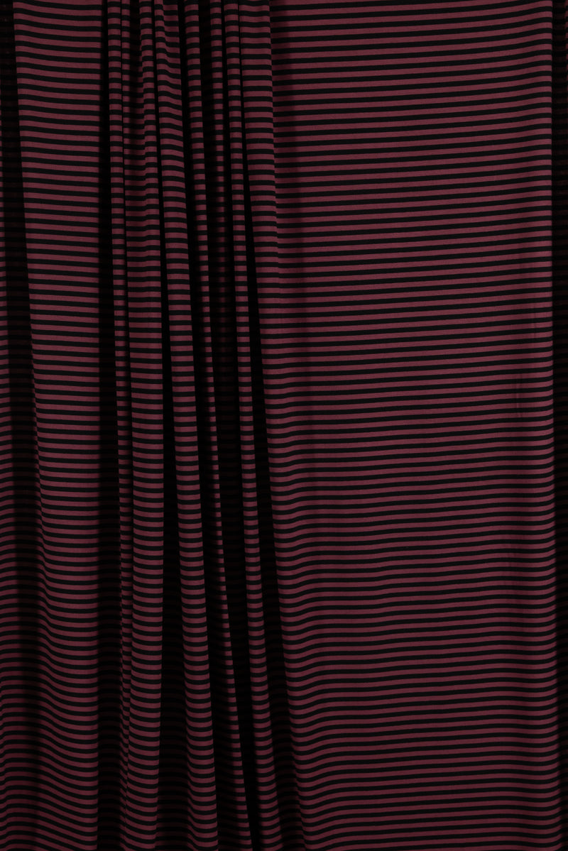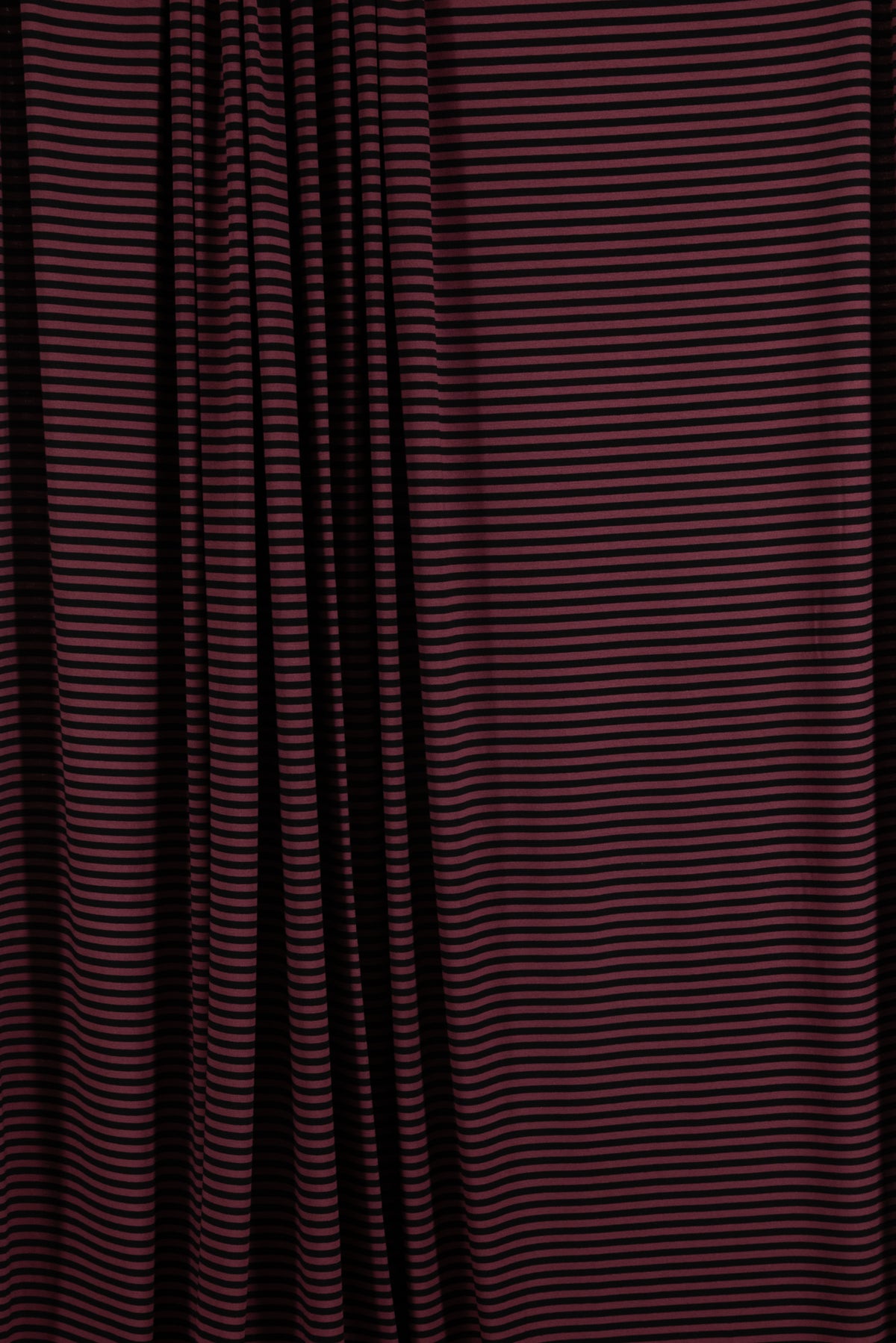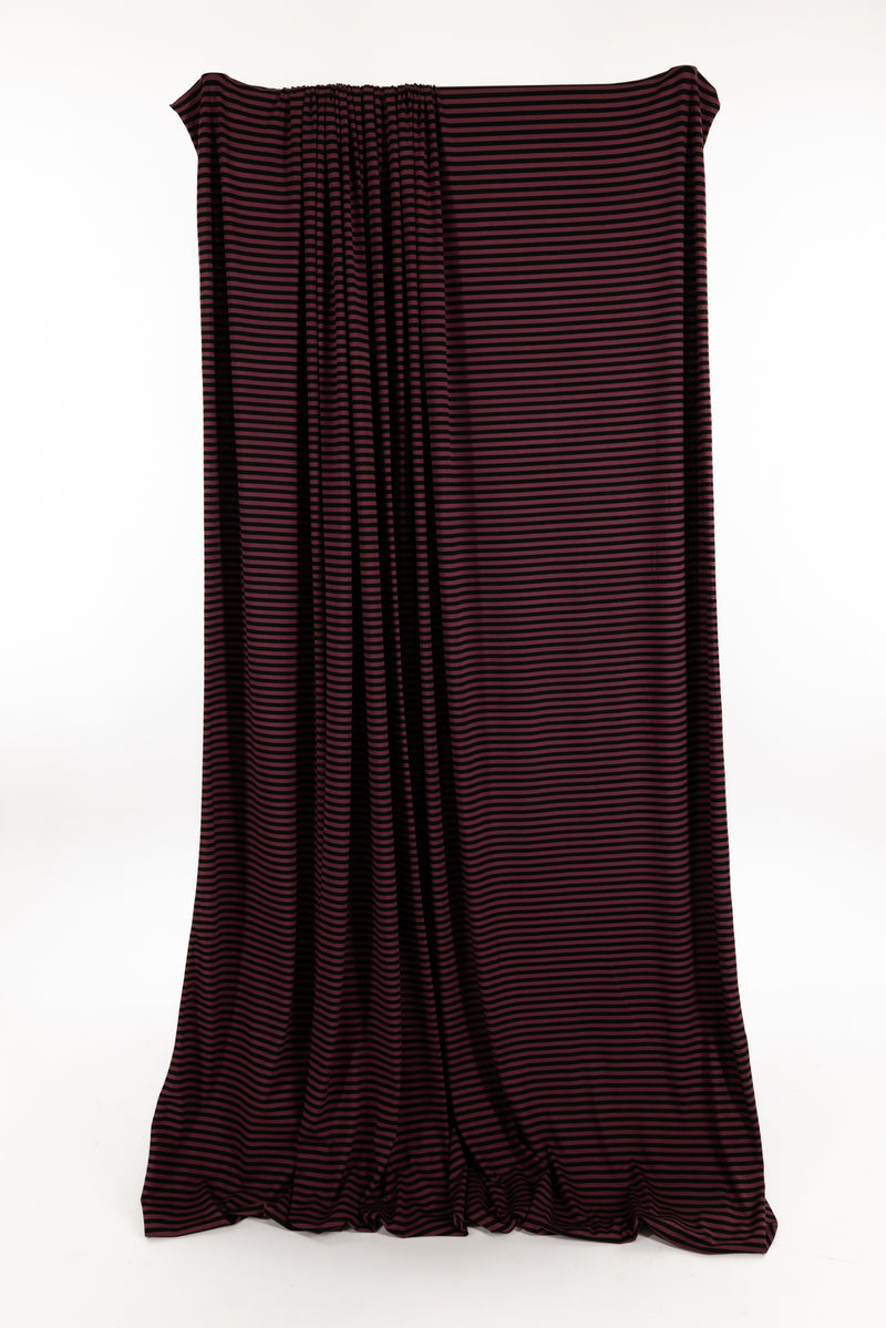 Splendid stripes in plum and black in a gorgeous knit. Manufactured in the USA, this is a perfect light/mid-weight jersey with enough substance and stability to skim the body in the most flattering way. Opaque, with 4-way stretch, 3/16" stripes and some rolling at the cut edge. A beautiful knit with a soft hand and drape and a smooth matte finish. Just right for t-shirts, tunics, dresses, soft pants, leggings, a cardi, skirt, men's, or children's. Also great for trims, bindings, and contrast pieces.