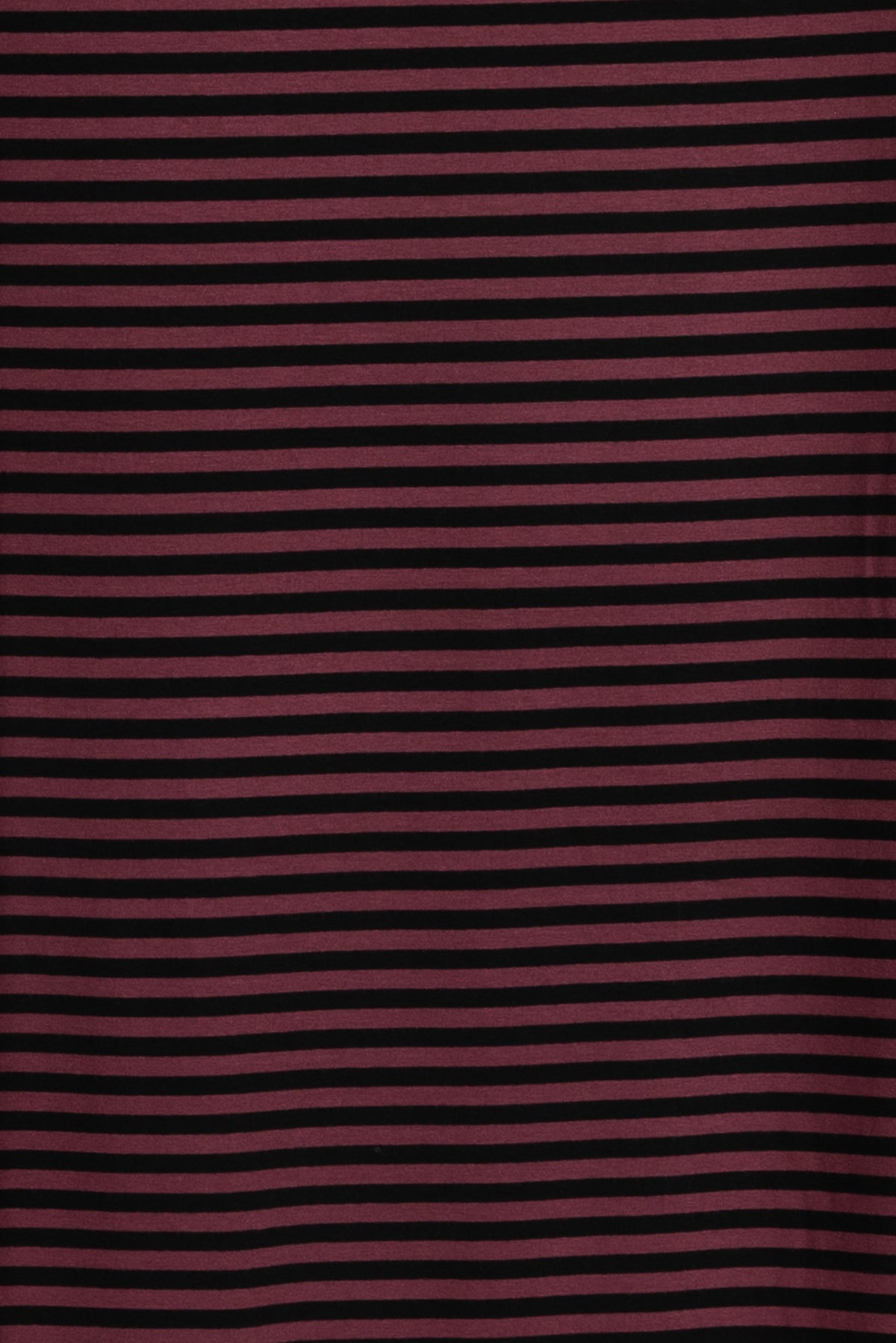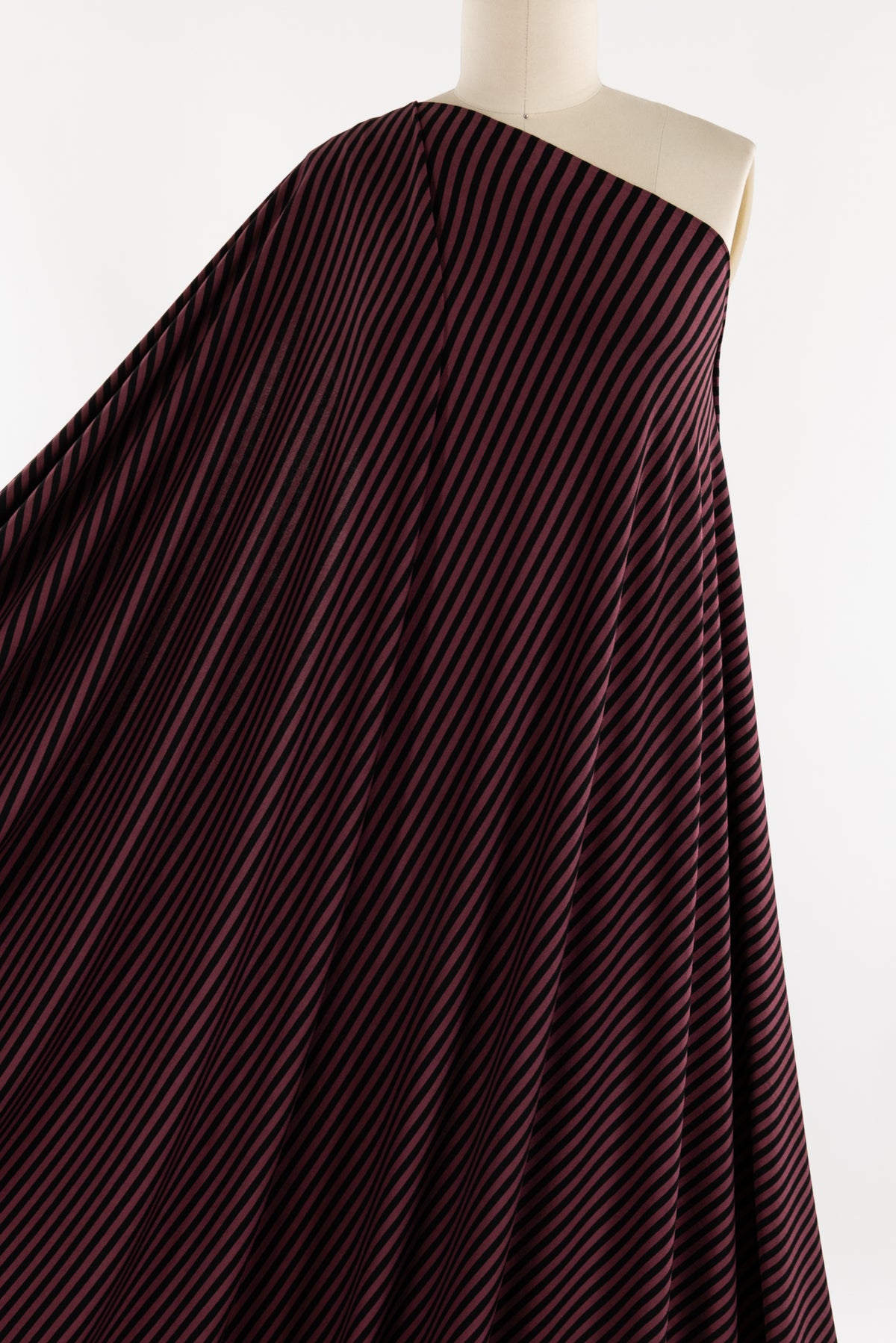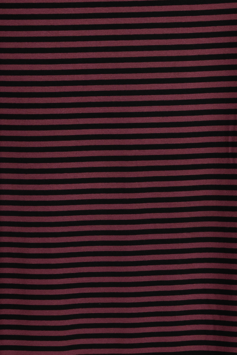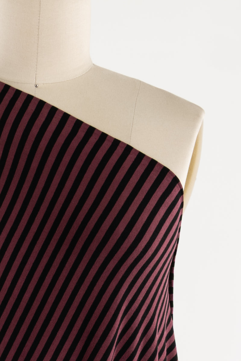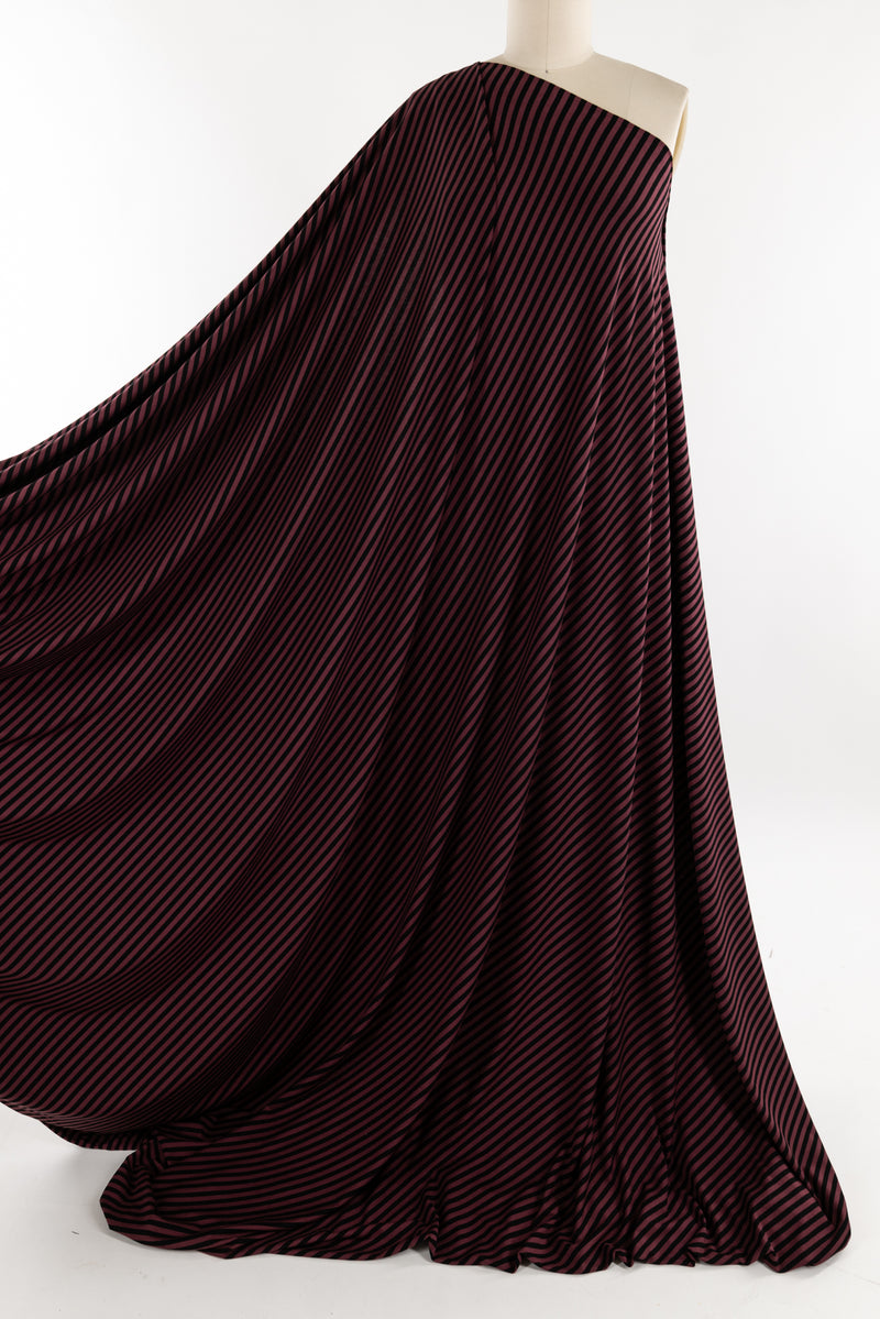Splendid stripes in plum and black in a gorgeous knit. Manufactured in the USA, this is a perfect light/mid-weight jersey with enough substance and stability to skim the body in the most flattering way. Opaque, with 4-way stretch, 3/16" stripes and some rolling at the cut edge. A beautiful knit with a soft hand and drape and a smooth matte finish. Just right for t-shirts, tunics, dresses, soft pants, leggings, a cardi, skirt, men's, or children's. Also great for trims, bindings, and contrast pieces.