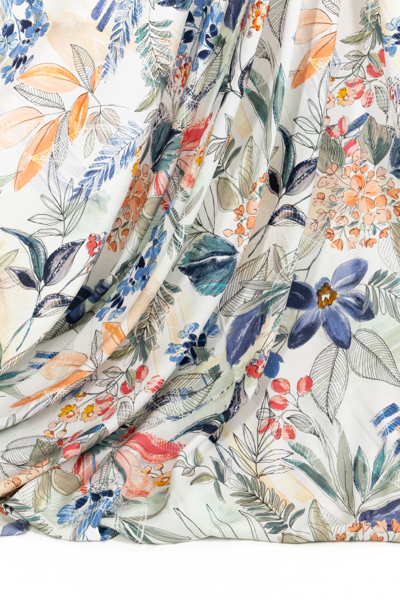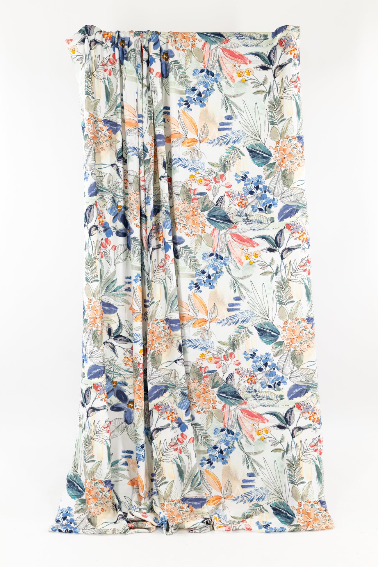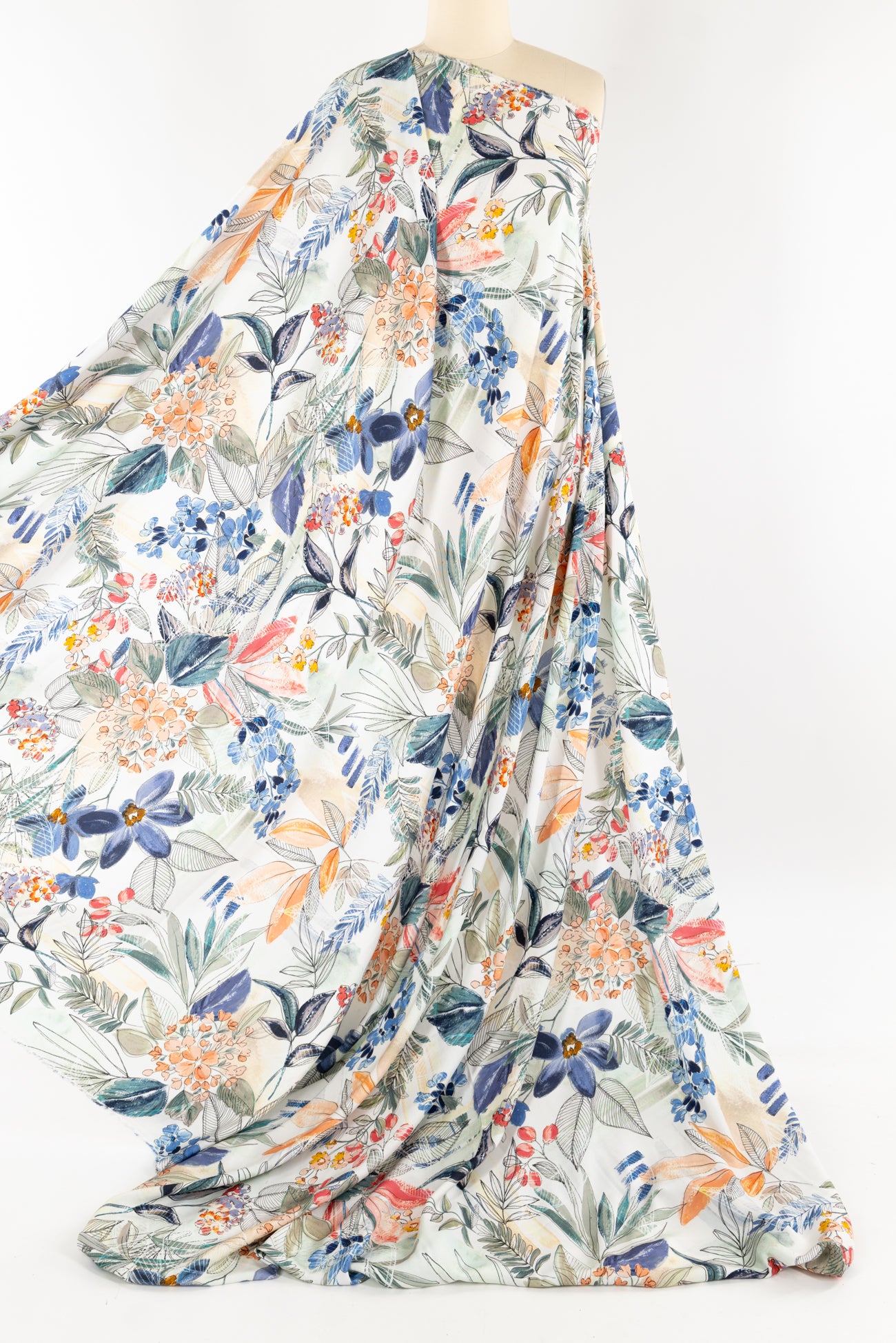 Lighthearted floral in pinks and blues with black accents, digitally printed on a supple fine grained rayon twill. Lightweight, opaque, with a smooth, cool, dry hand, 24" repeat and fluid liquid drape. Right for a dress, blouse, tunic, skirt, soft pant, jumpsuit, caftan, kimono or children's. Oeko-Tex® certified.