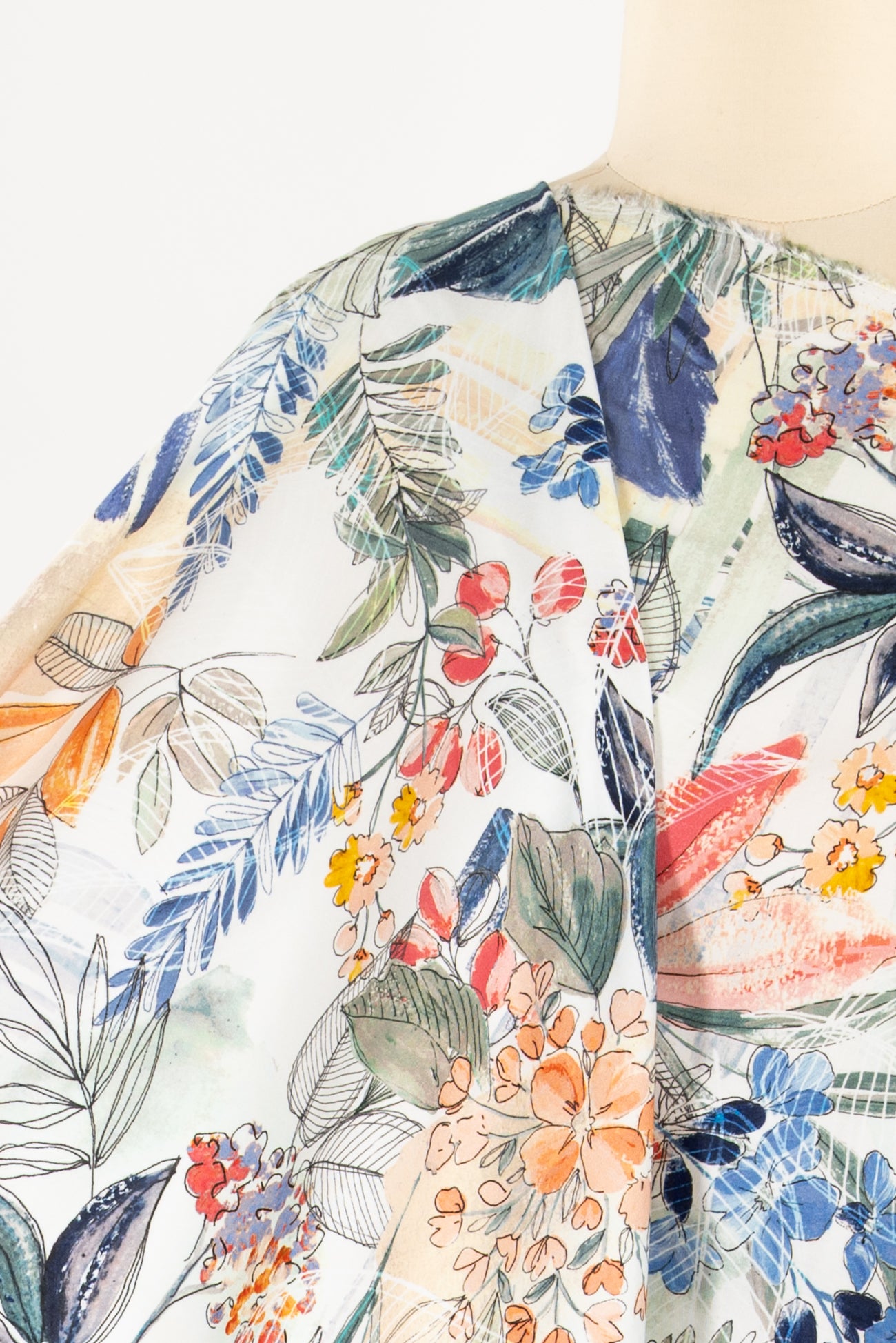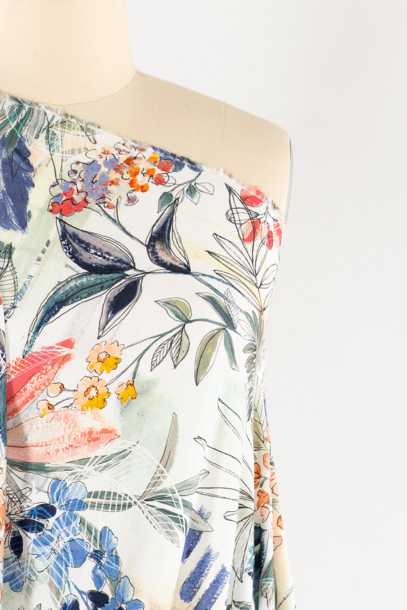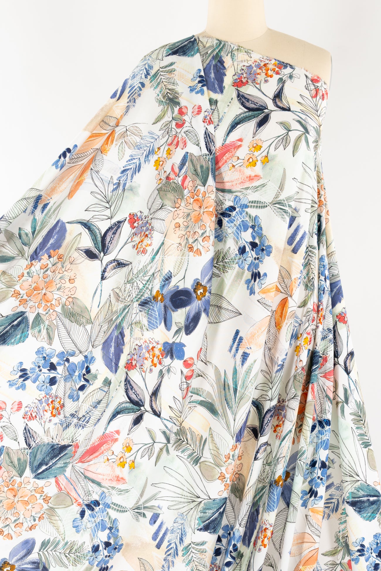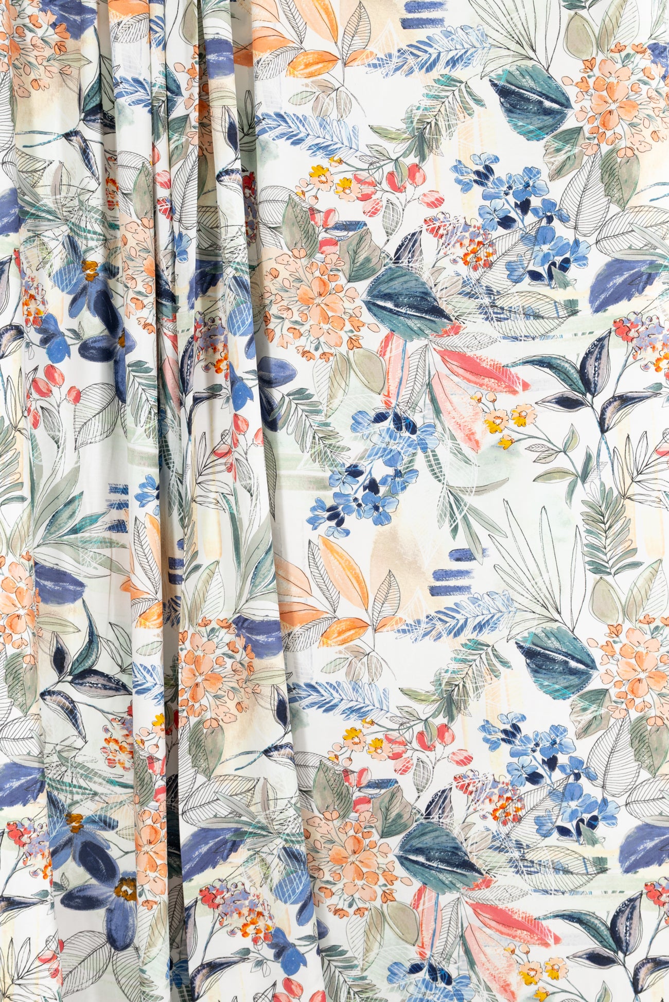 Lighthearted floral in pinks and blues with black accents, digitally printed on a supple fine grained rayon twill. Lightweight, opaque, with a smooth, cool, dry hand, 24" repeat and fluid liquid drape. Right for a dress, blouse, tunic, skirt, soft pant, jumpsuit, caftan, kimono or children's. Oeko-Tex® certified.