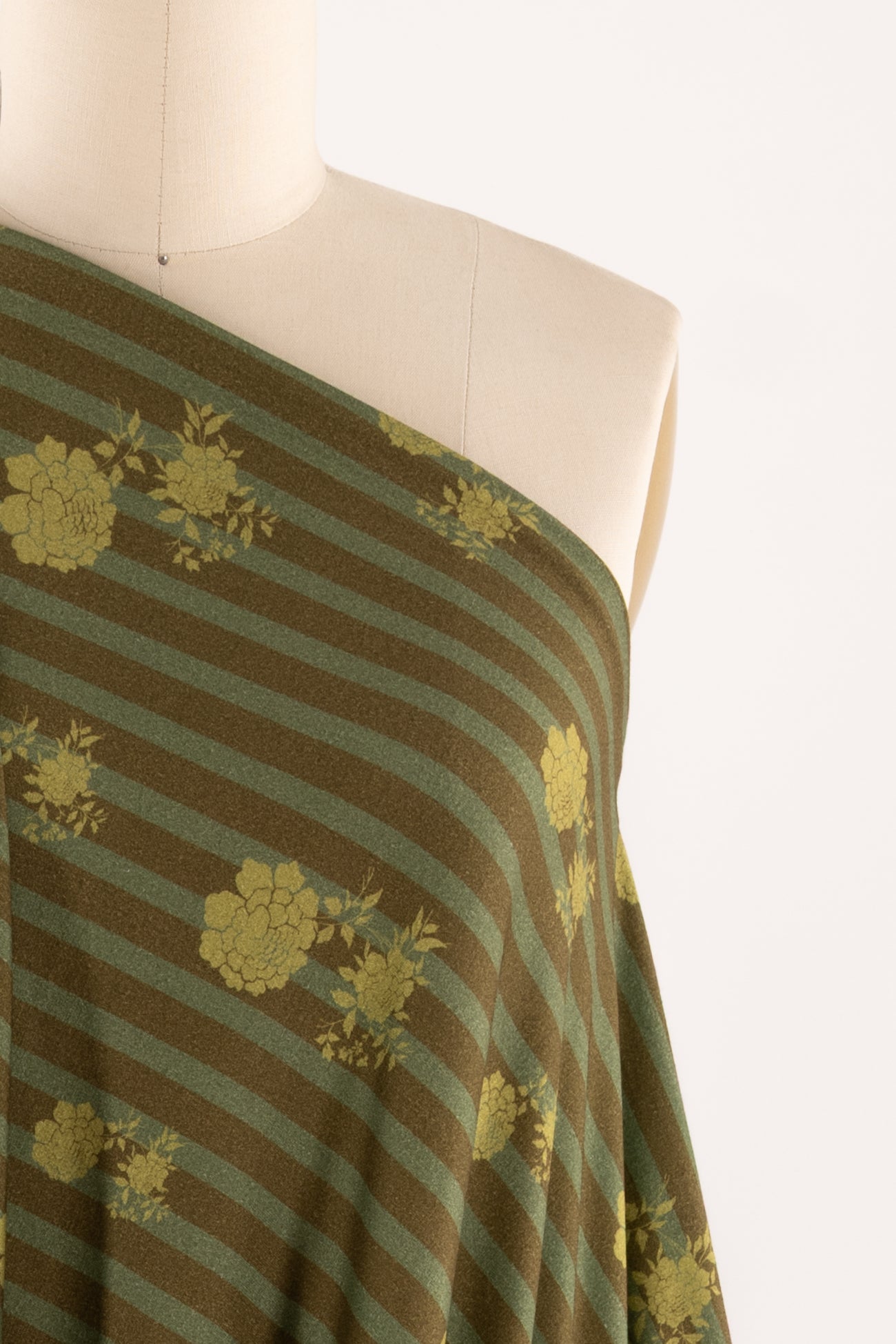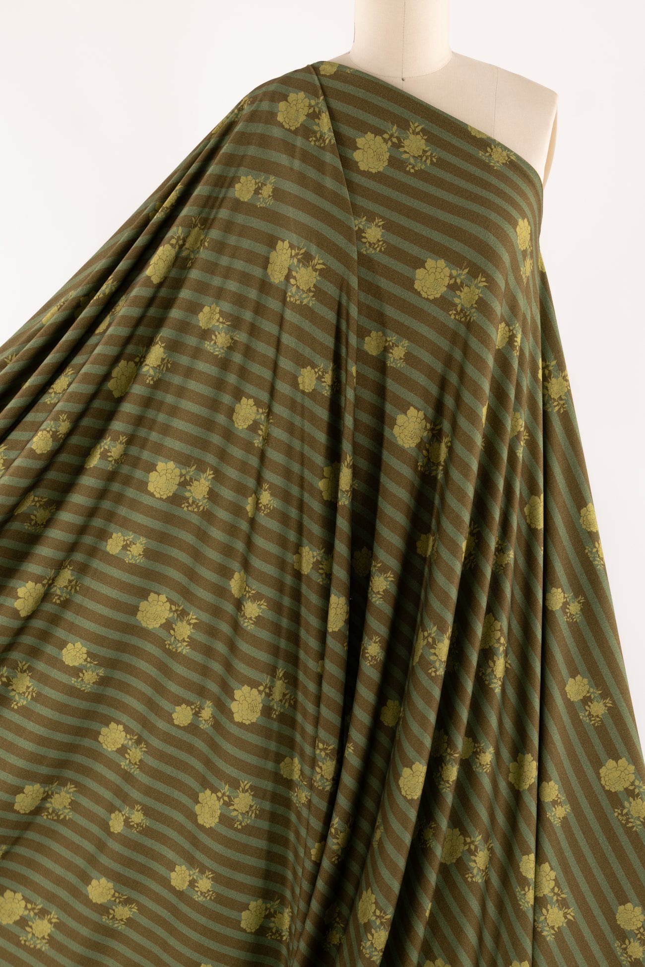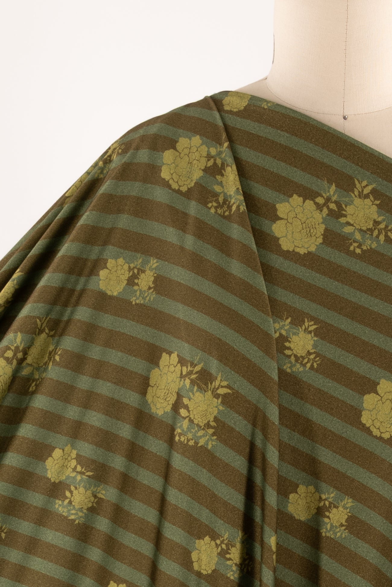 Modern floral/stripes print in warm green-on-green tones, deadstock from LA designer, Novella Royale (who just closed their 16 year business). Beautiful quality and weight rayon/spandex jersey - has just a touch more weight than most, opaque, with a soft, smooth, matte hand, 4 way stretch, minimal rolling at the cut edge. Right for a dress, skirt, tunic, t-shirt, soft pants, leggings, caftan, kimono, jumpsuit. One way design, 14" repeat.