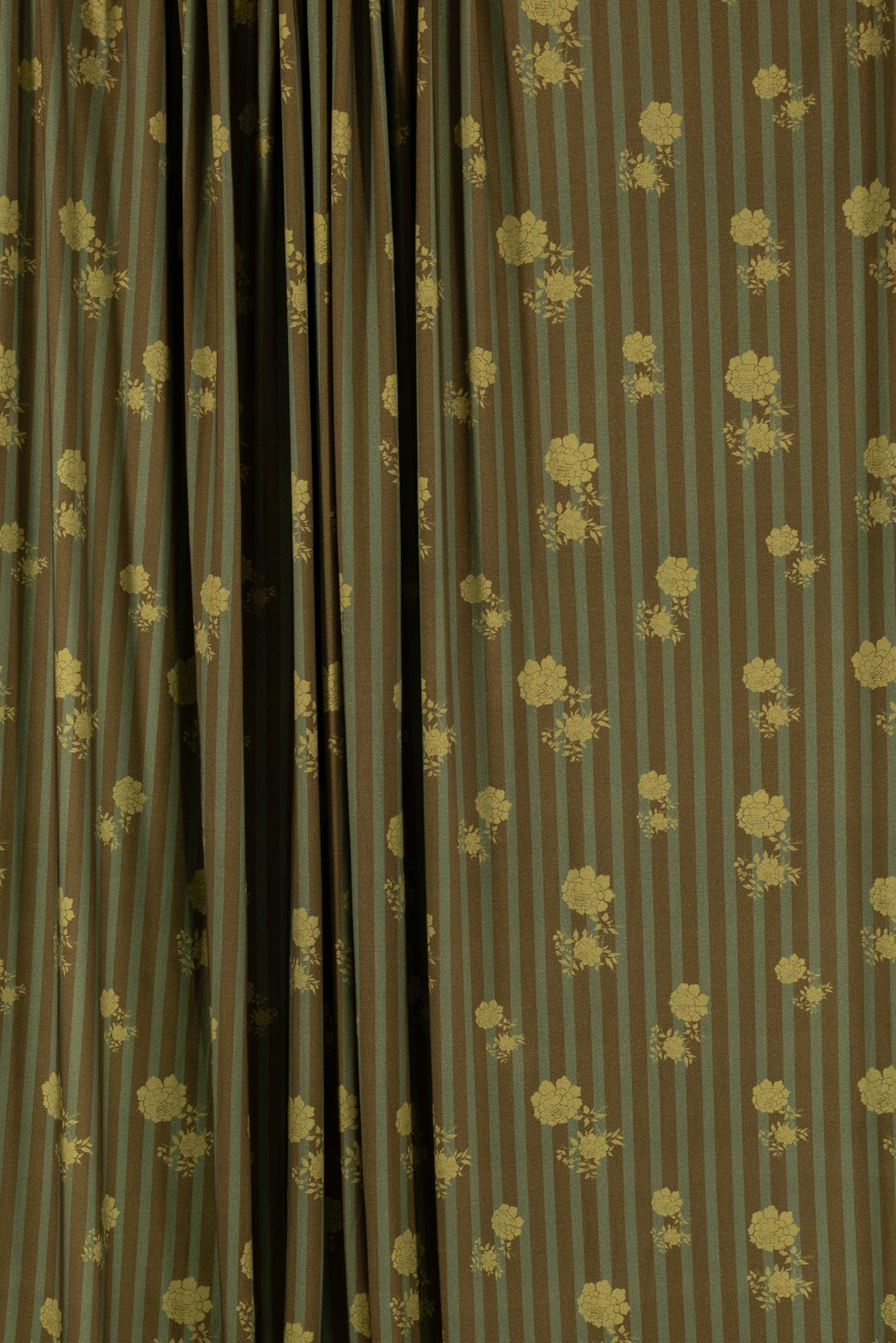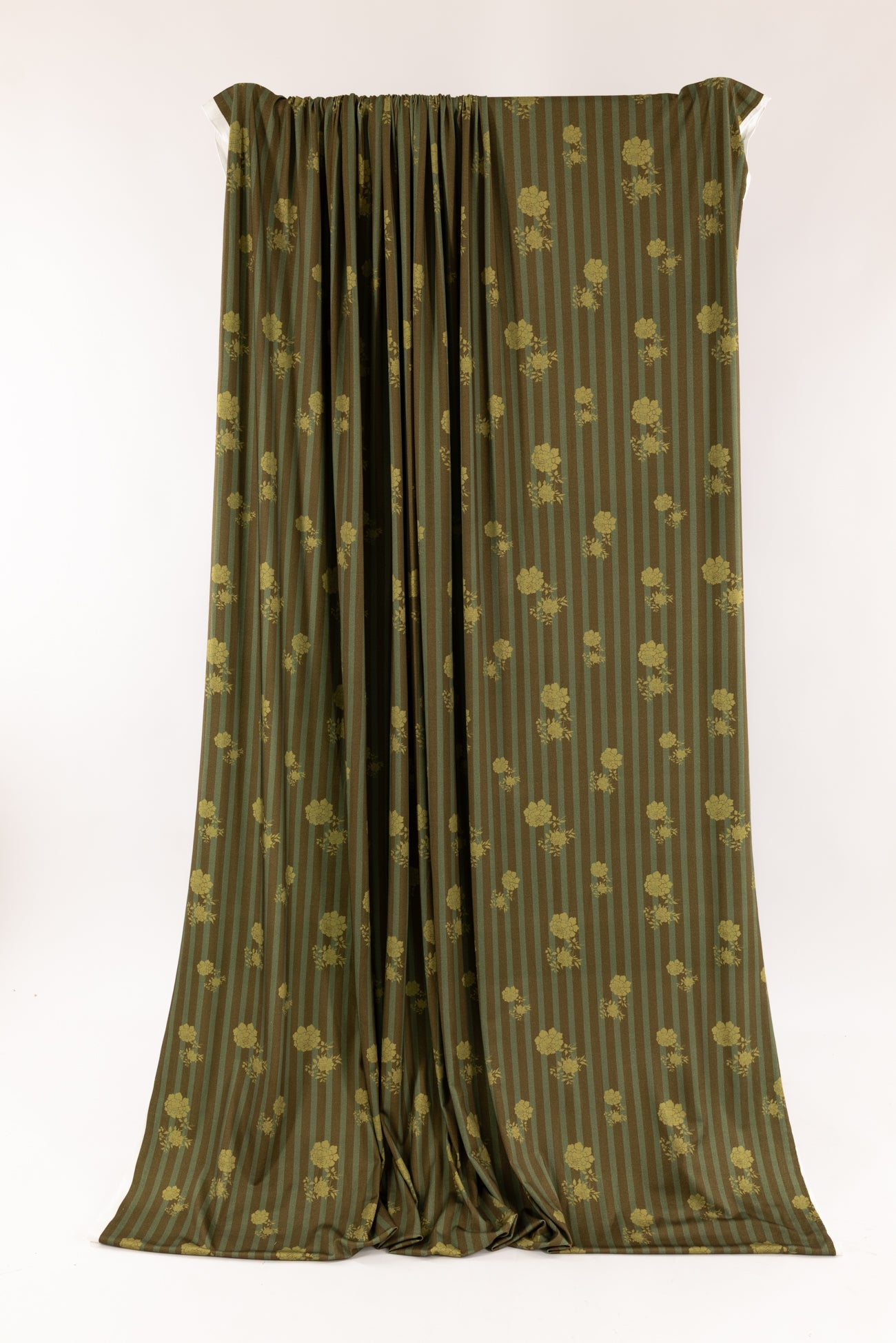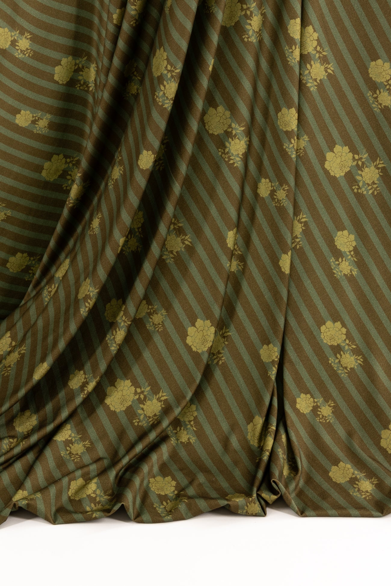Modern floral/stripes print in warm green-on-green tones, deadstock from LA designer, Novella Royale (who just closed their 16 year business). Beautiful quality and weight rayon/spandex jersey - has just a touch more weight than most, opaque, with a soft, smooth, matte hand, 4 way stretch, minimal rolling at the cut edge. Right for a dress, skirt, tunic, t-shirt, soft pants, leggings, caftan, kimono, jumpsuit. One way design, 14" repeat.