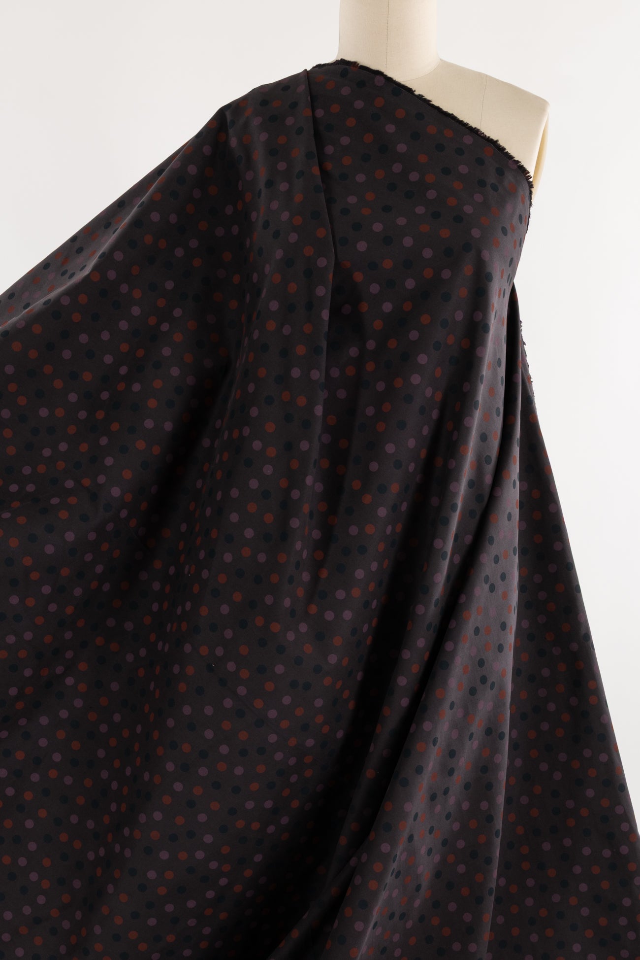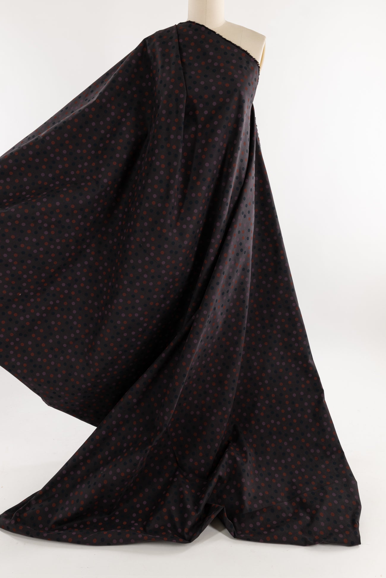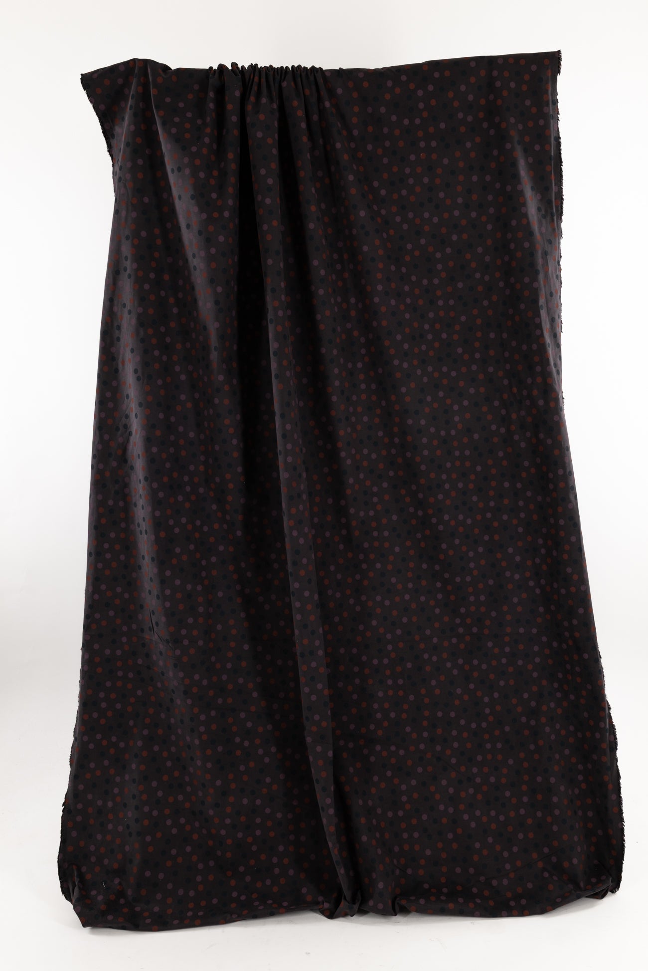 Muted and sophisticated dark toned overall dots in rust, mauve, and black on an aubergine background in stretch cotton sateen, deadstock from an LA designer. Mid/light weight with a smooth hand, crosswise stretch, and supple drape. Right for pants, jacket, dress, skirt, duster coat, or vest. Shown here in V9287 paired with Gwyne Japanese cotton.