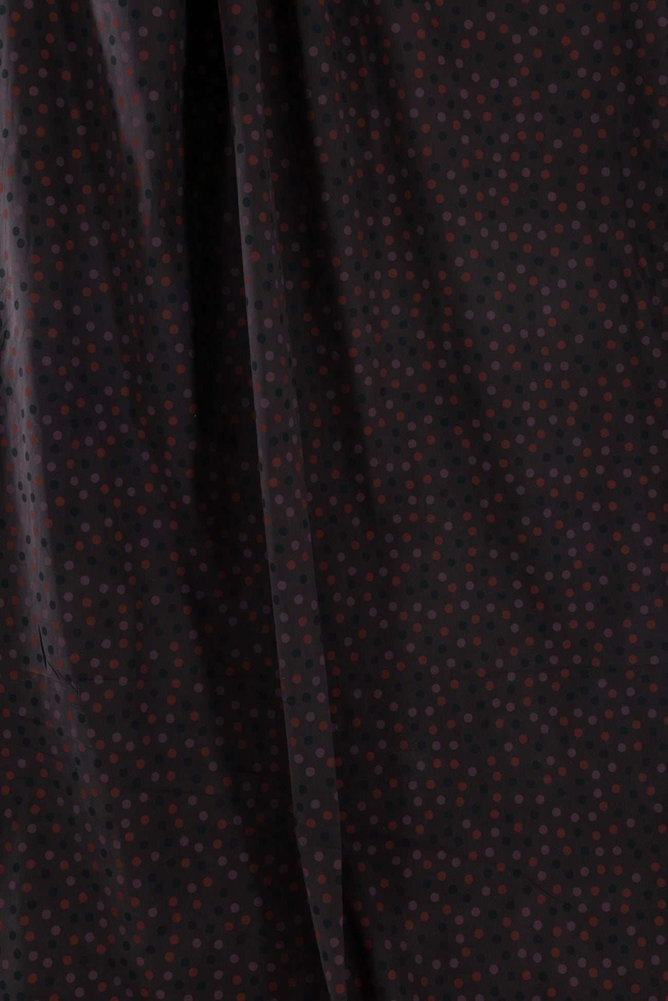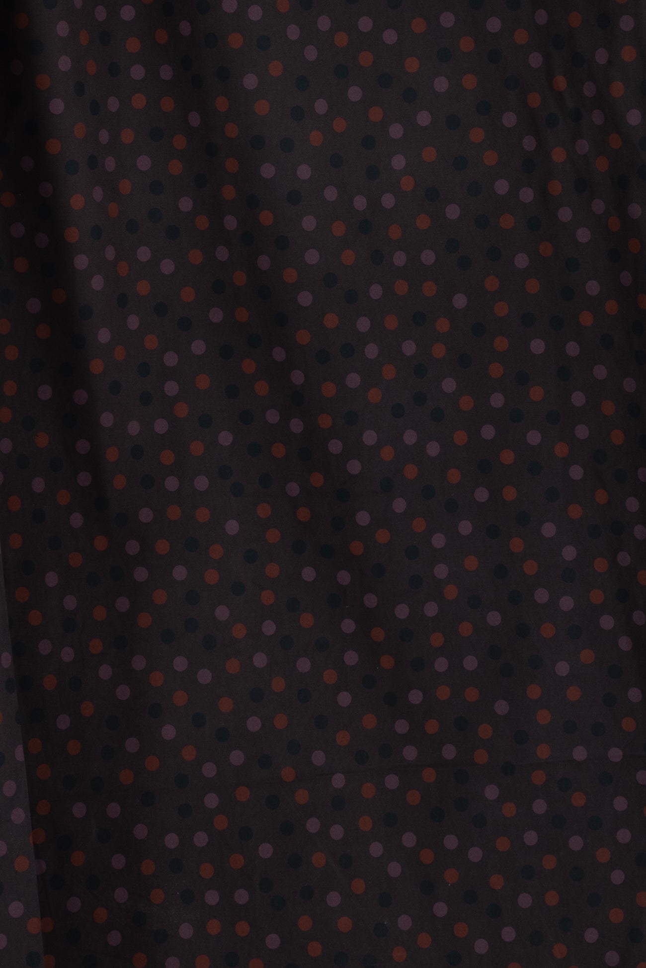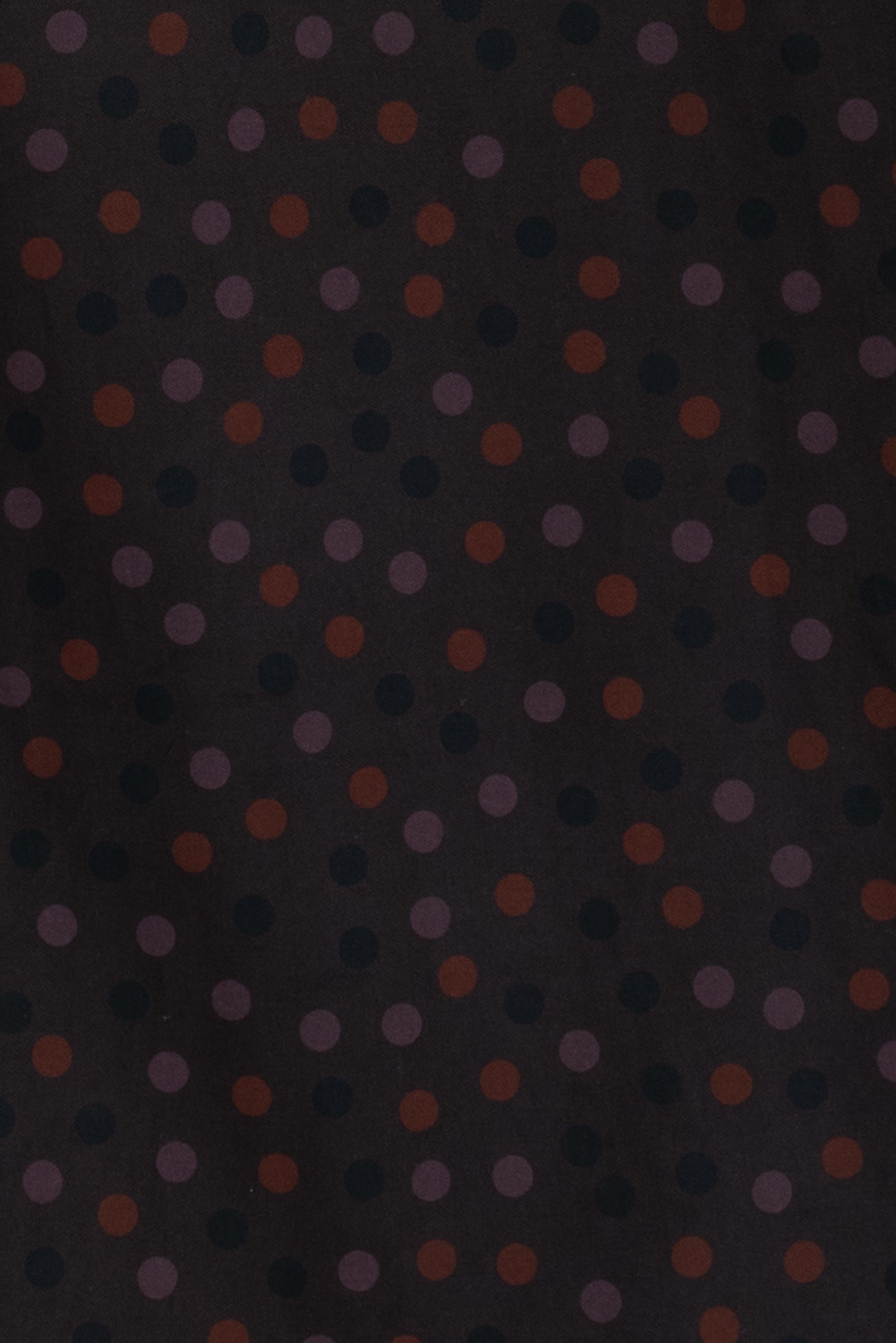 Muted and sophisticated dark toned overall dots in rust, mauve, and black on an aubergine background in stretch cotton sateen, deadstock from an LA designer. Mid/light weight with a smooth hand, crosswise stretch, and supple drape. Right for pants, jacket, dress, skirt, duster coat, or vest. Shown here in V9287 paired with Gwyne Japanese cotton.