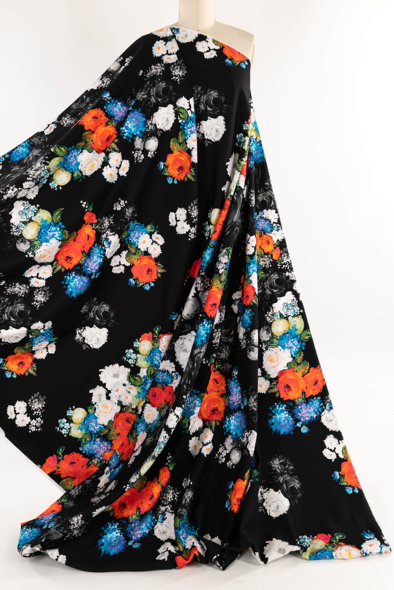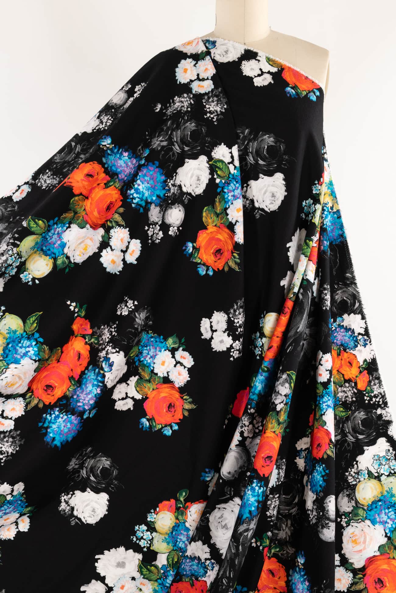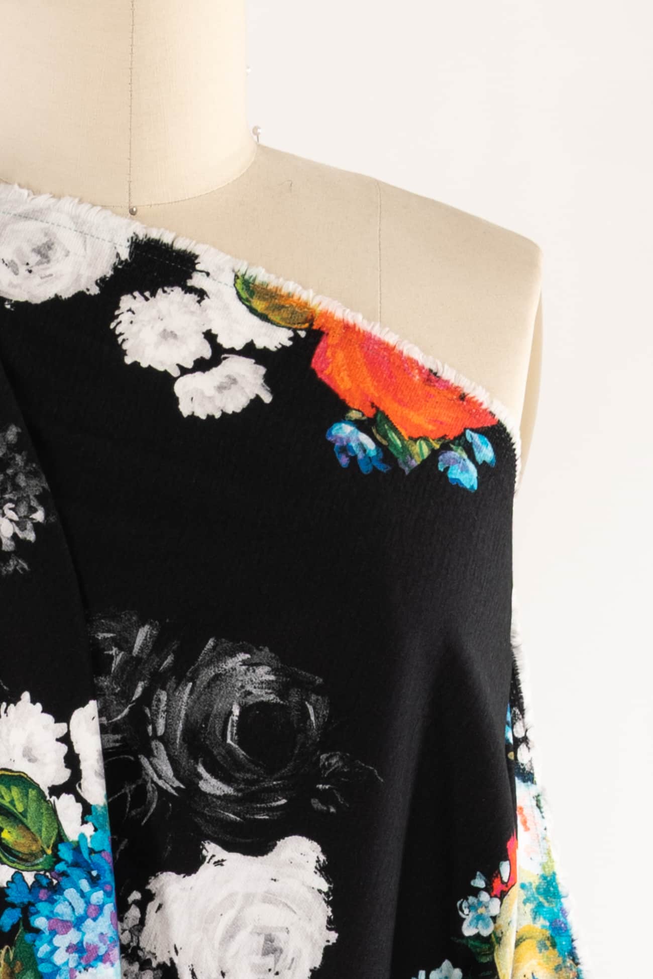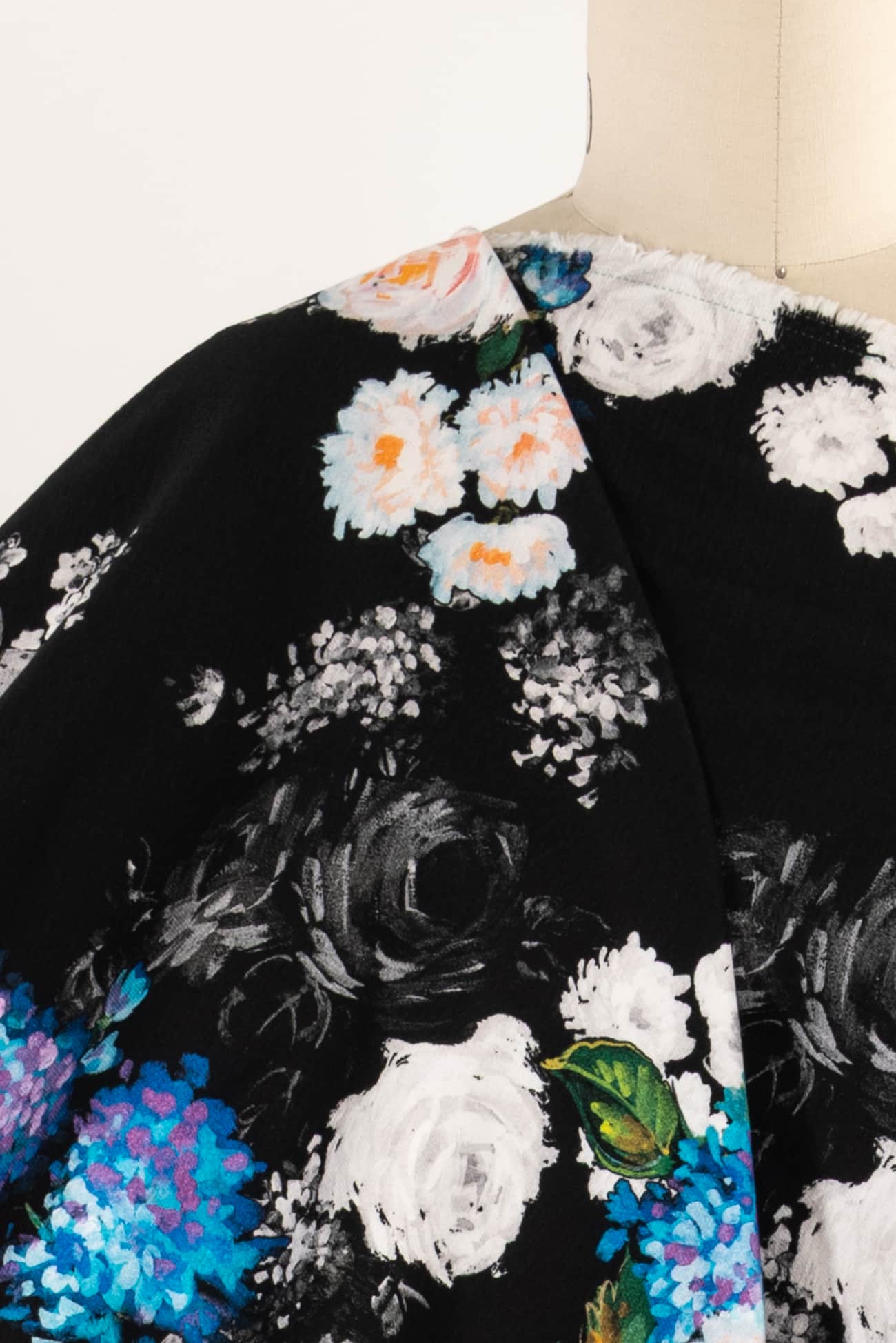 Striking digital print; multicolored floral on a black background with a modern painterly feel, deadstock from an Italian mill. Impeccable quality in a mid weight denim, (not heavy or thick), with an appealing soft hand, soft hand an drape, light crosswise stretch. Right for a jacket, coat, vest, dress, skirt, pants, jeans or jumpsuit.