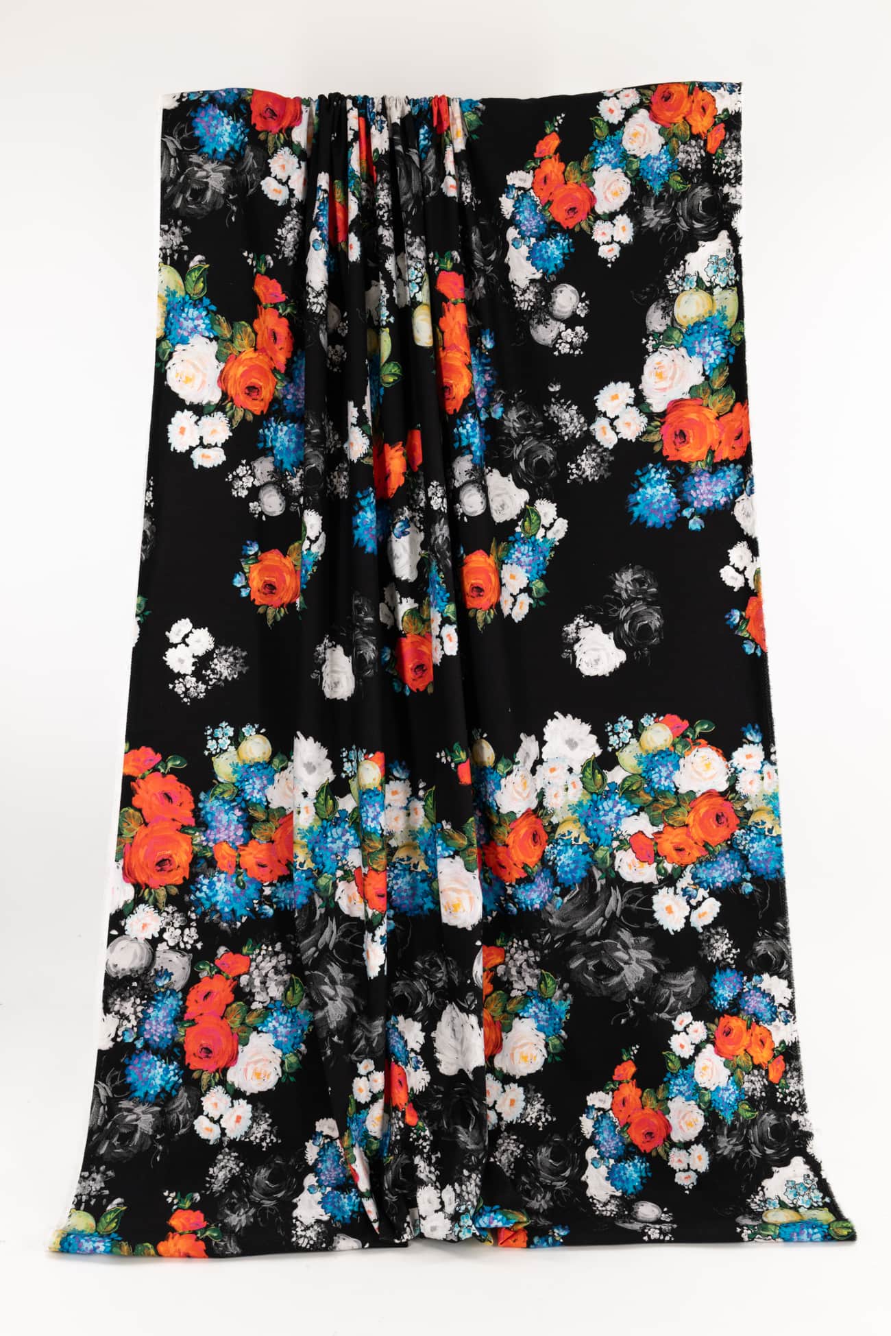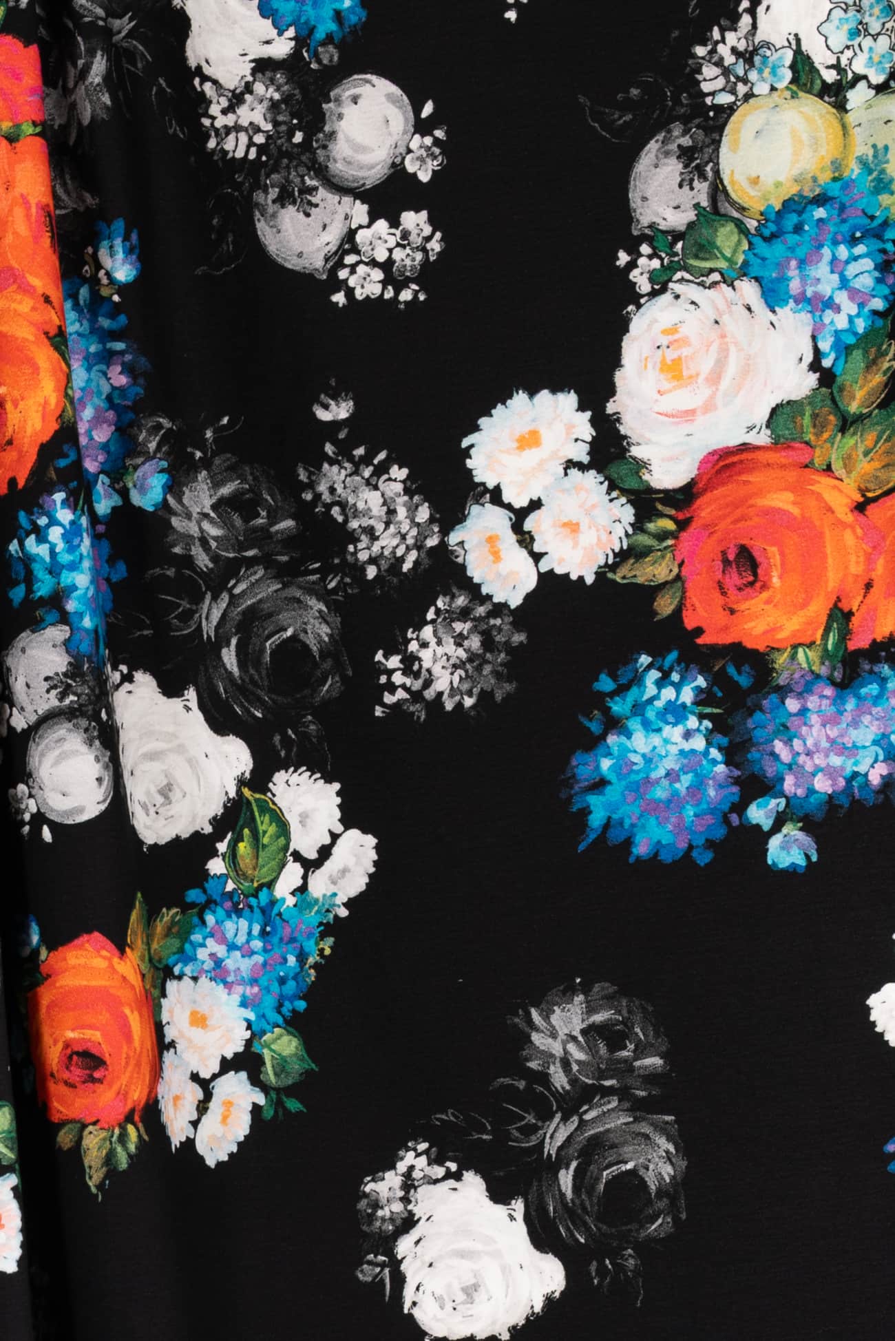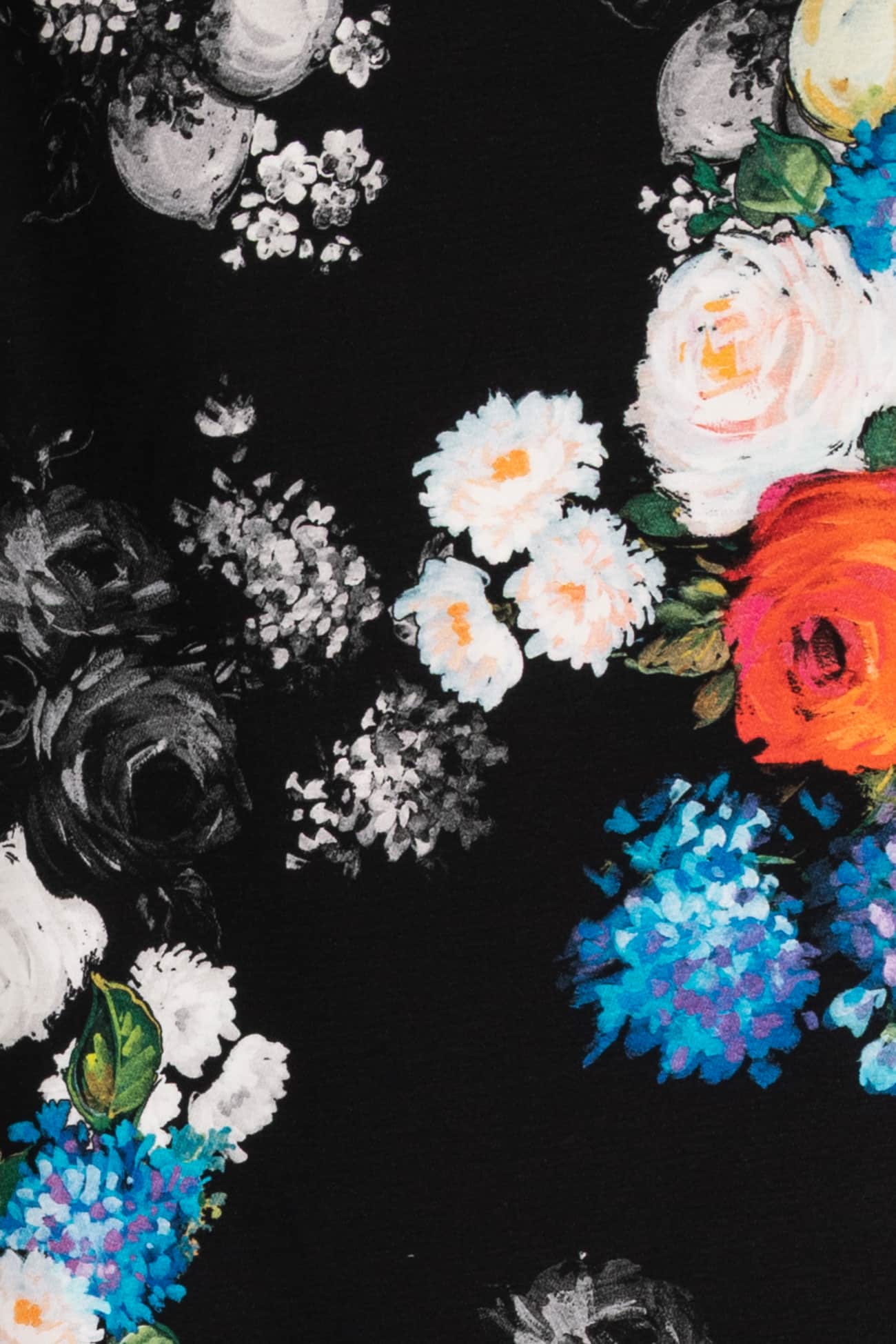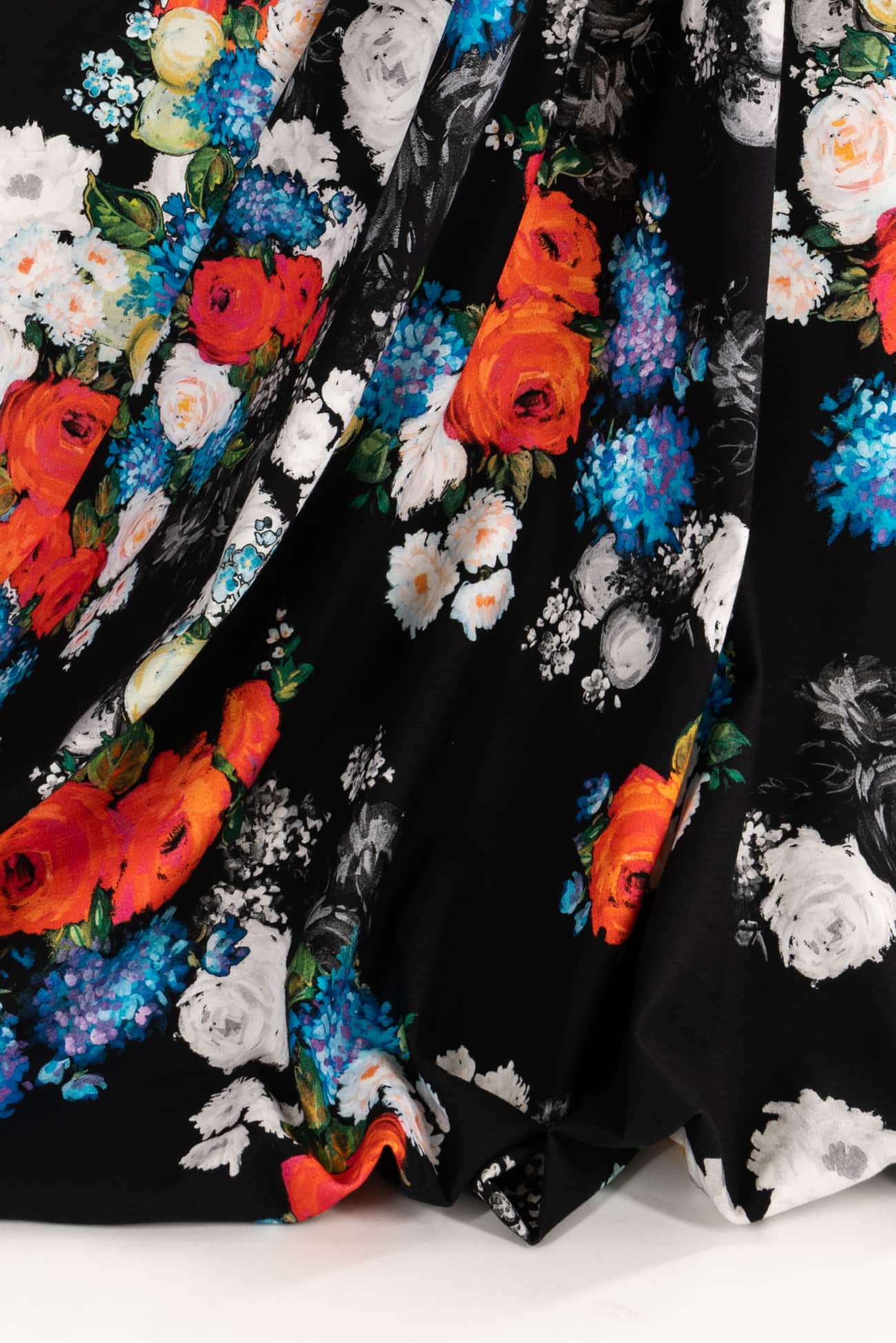 Striking digital print; multicolored floral on a black background with a modern painterly feel, deadstock from an Italian mill. Impeccable quality in a mid weight denim, (not heavy or thick), with an appealing soft hand, soft hand an drape, light crosswise stretch. Right for a jacket, coat, vest, dress, skirt, pants, jeans or jumpsuit.