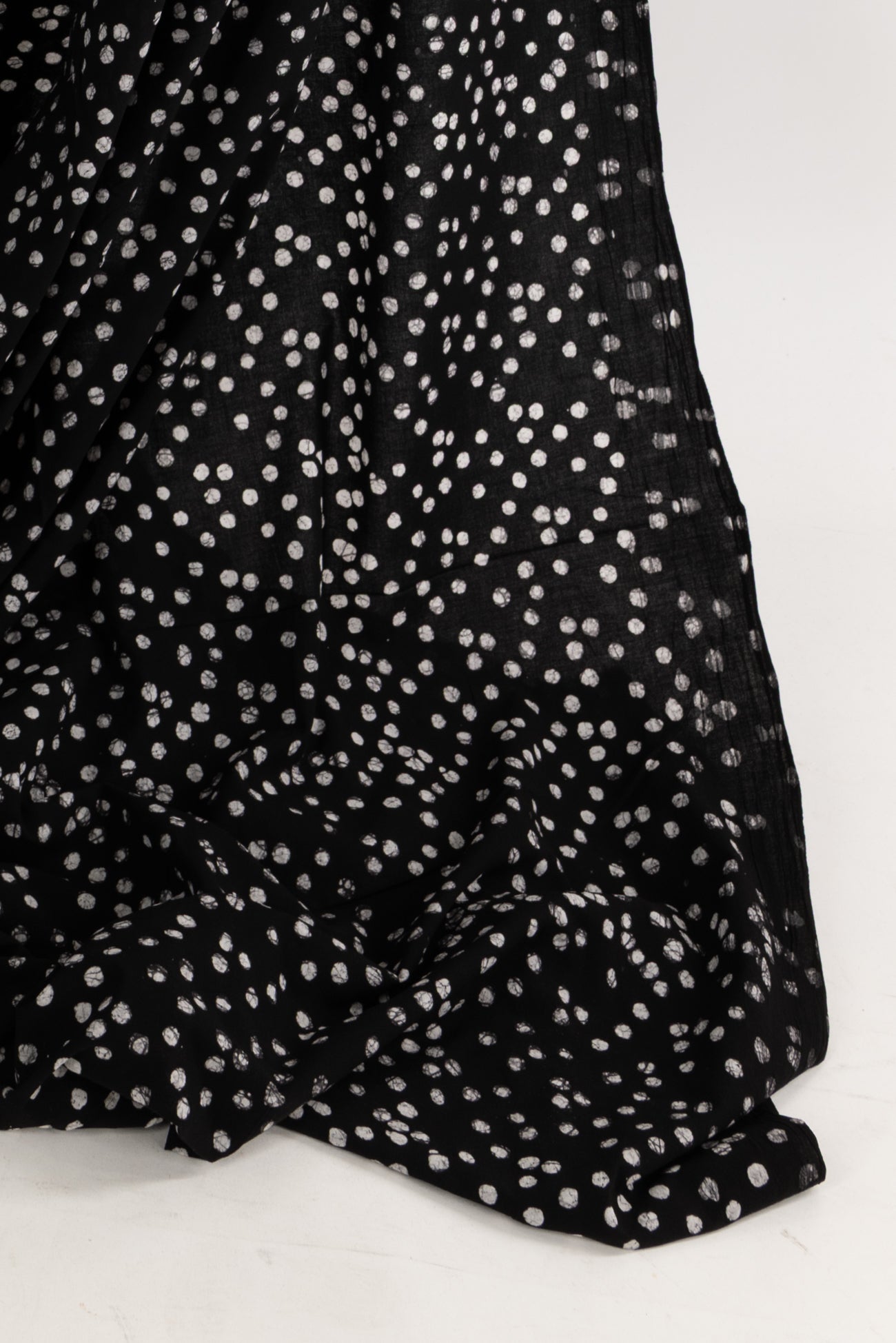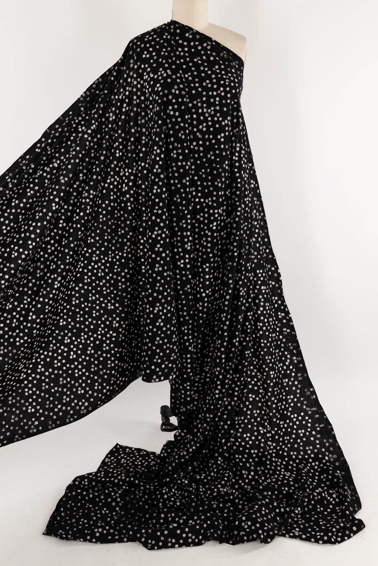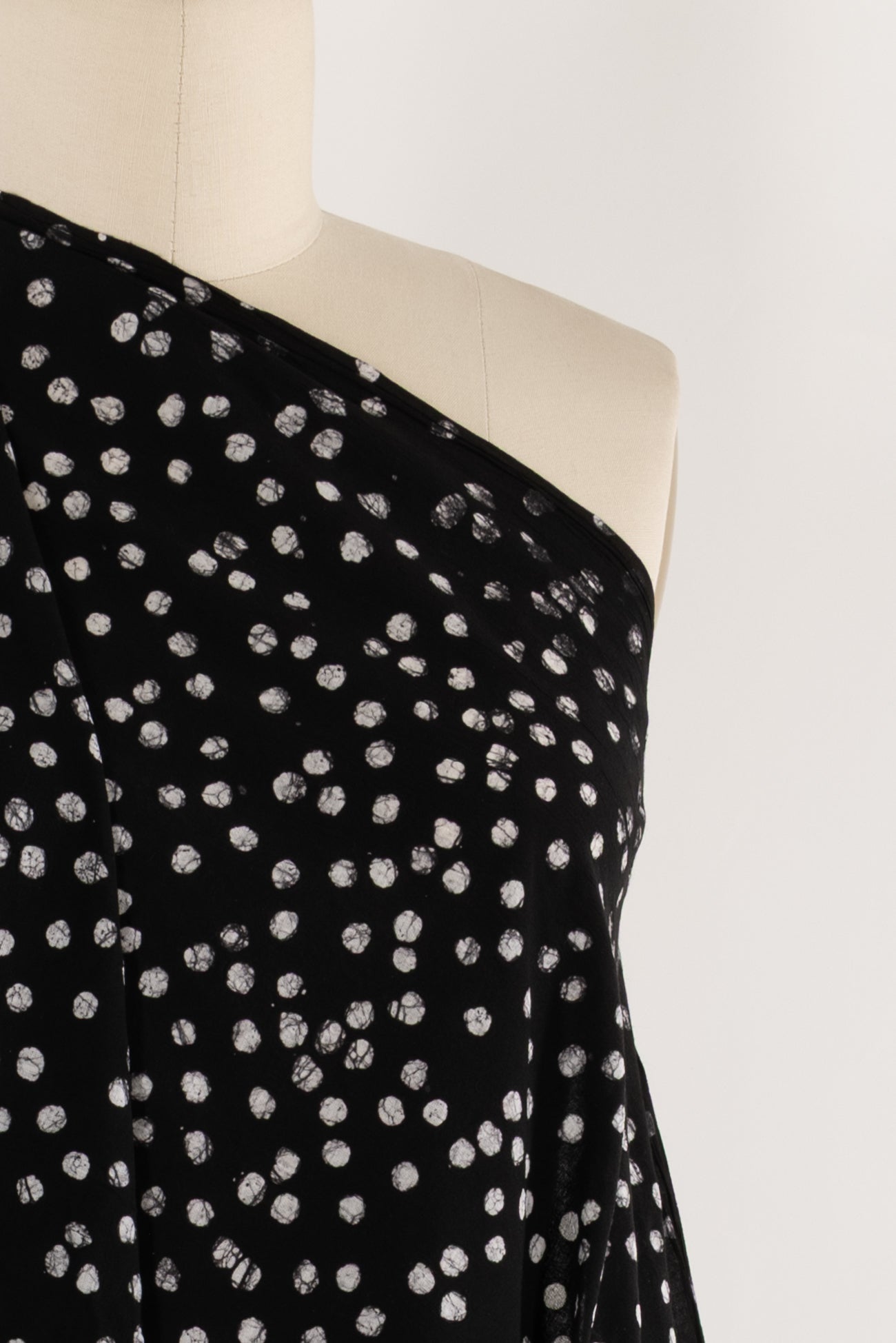 Beautiful quality lightweight cotton in black with all over hand-batiked soft gray/white smallish dots. Softly textured, opaque, with an appealing cool dry hand, light airy drape. The supple weight is right for a shirt, tunic, blouse, dress, skirt, soft pants, jumpsuit, kimono, caftan, men's or children's. Also great for quilting, home dec, and crafting.