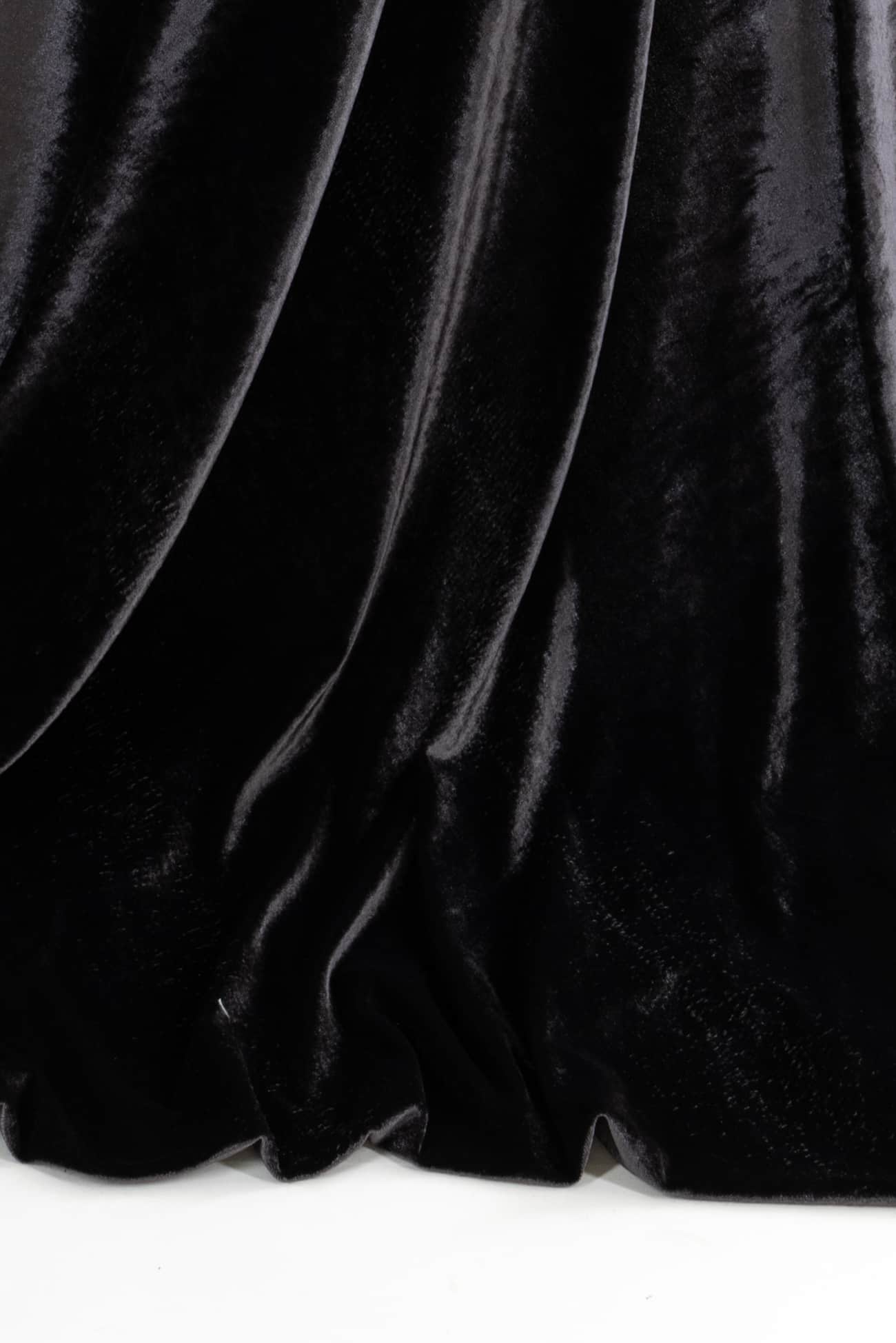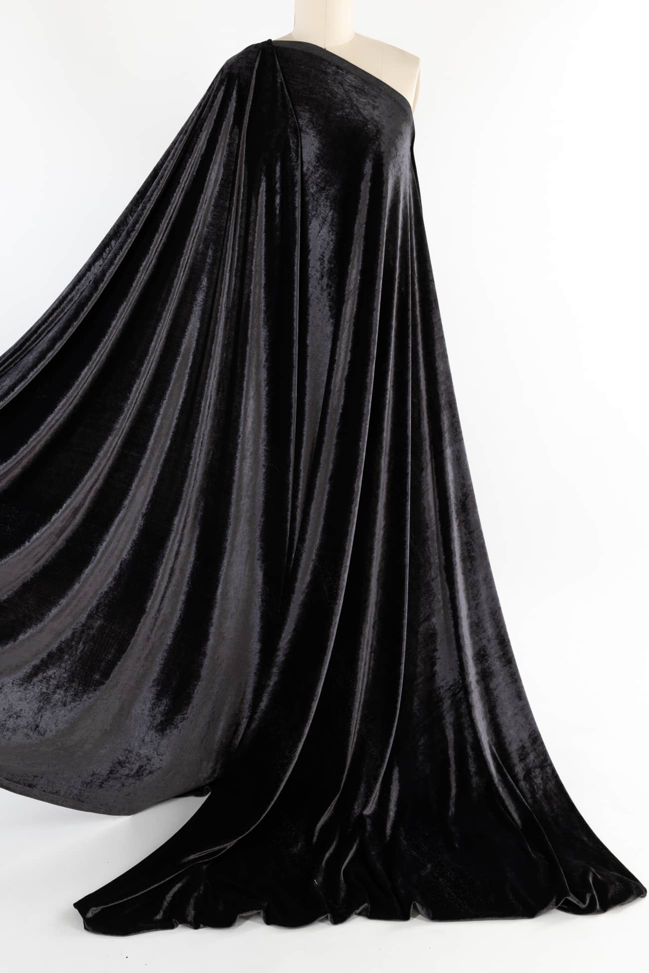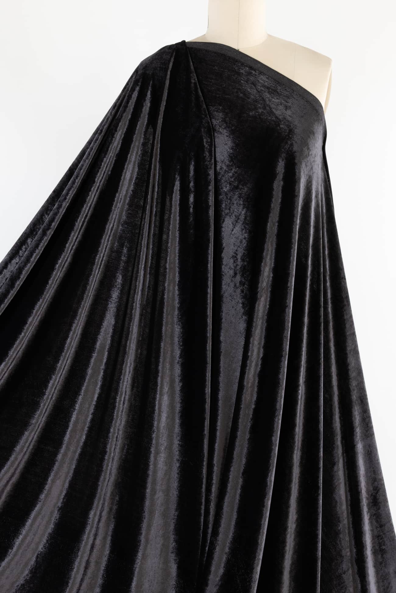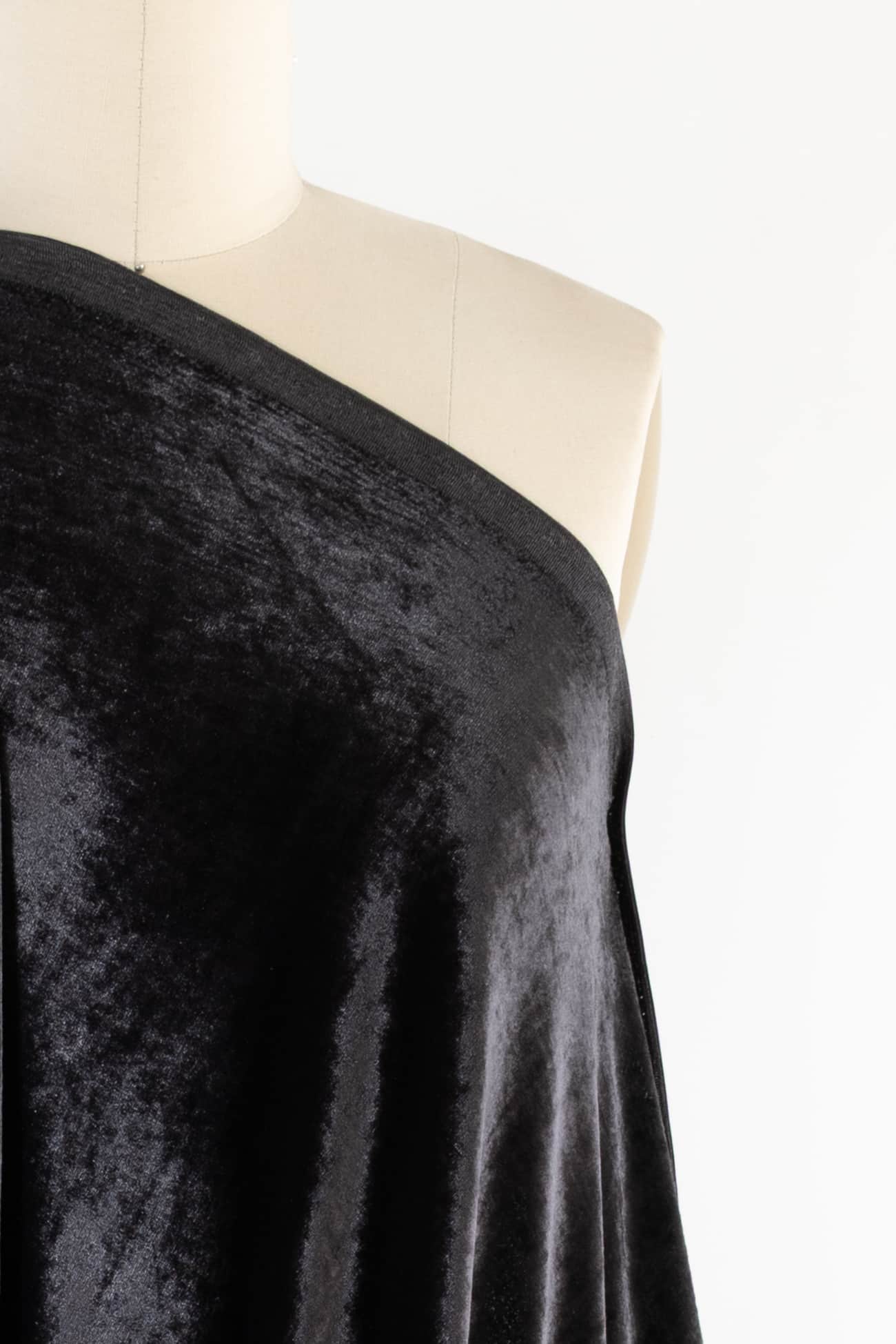 Subtle & elegant taupe crushed velvet knit, deadstock from an LA designer. Crushed velvet is twisted and flattened while wet, resulting in an overall random vertical soft crinkle and an appealing irregular texture. Lightweight with a soft velvety hand, silky smooth on the back side, a fluid drape with crosswise stretch, and excellent recovery. Cut for nap. A fabric to dress up or down; right for a top, t-shirt, dress, skirt, cardigan, hoodie, jacket, kimono, or soft pants.