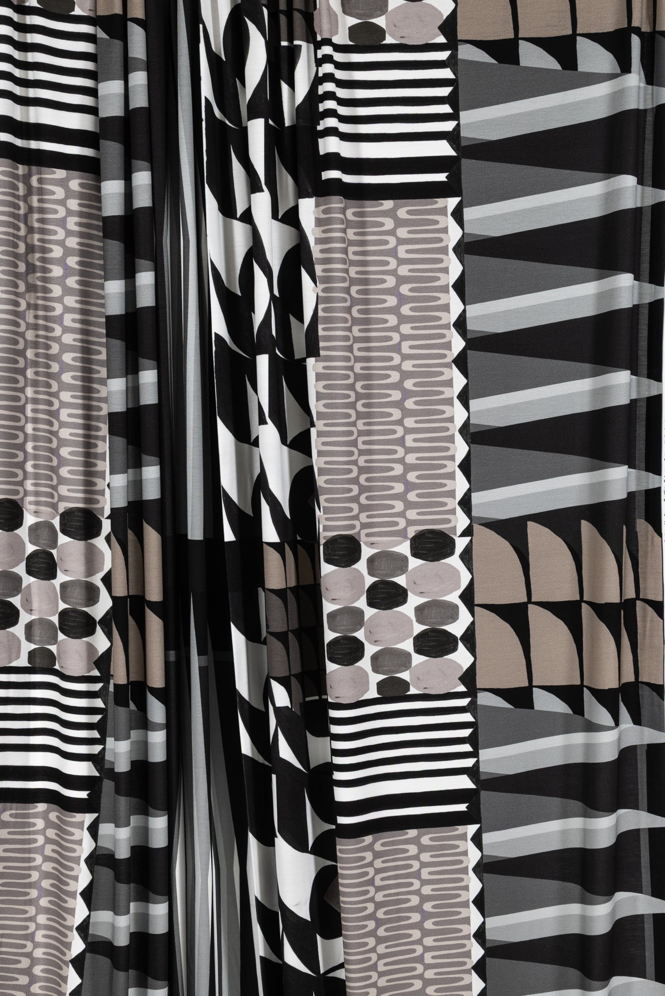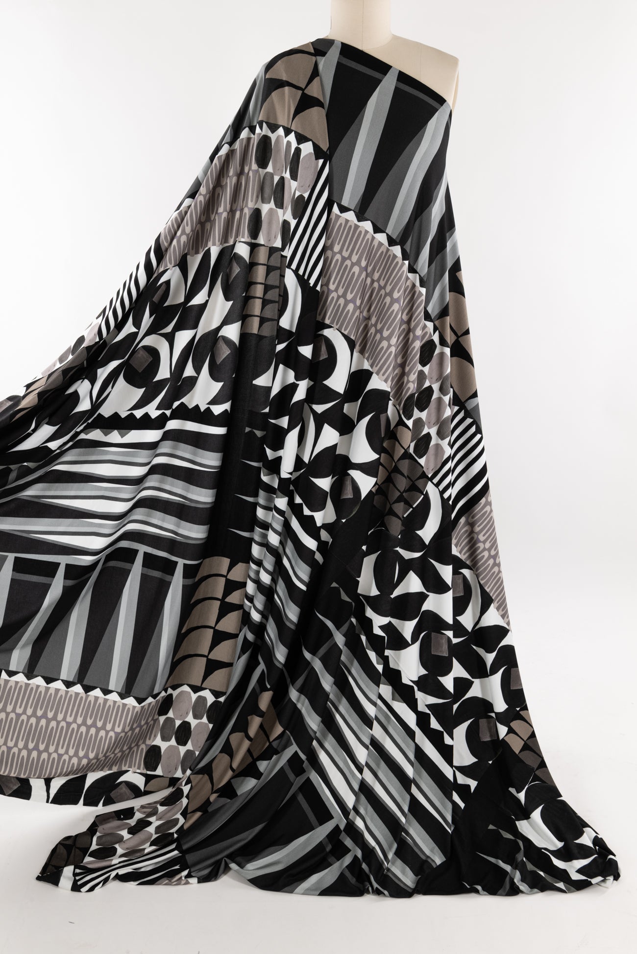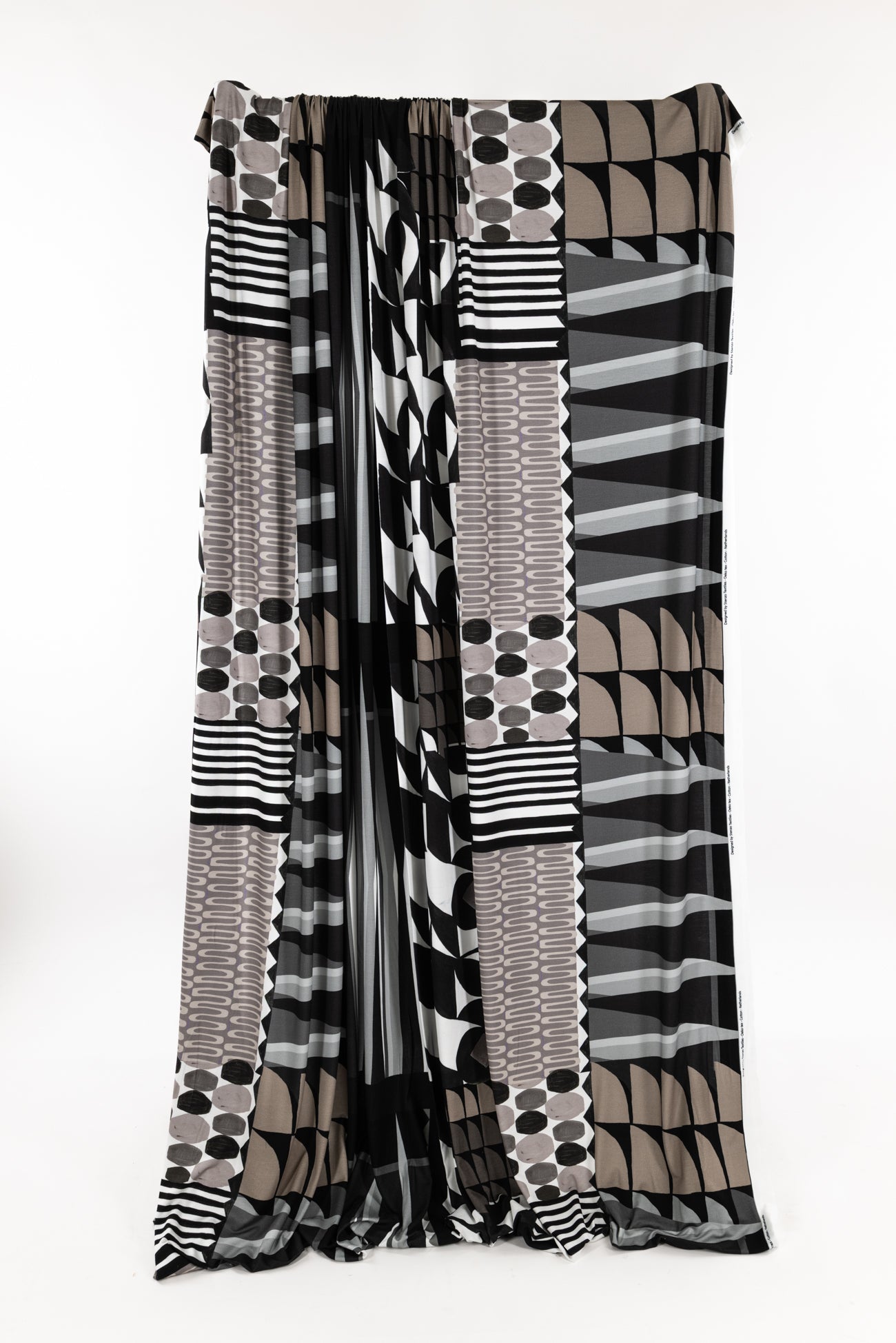 Luxurious viscose knit jersey, digitally printed in the Netherlands, features a dramatically color-saturated print. The black, white, and mocha design beautifully blends striking geometric elements. Impeccable quality, light/mid-weight, opaque, with a flattering body-skimming flow, appealing soft hand, fluid drape, crosswise stretch, some lengthwise stretch, a 28" repeat, and some rolling at the cut edge. Ideal for a wide range of garments, t-shirt, tunic, dress, skirt, soft pants, loungewear, caftan, kimono, or children's. Oeko-Tex® certified.