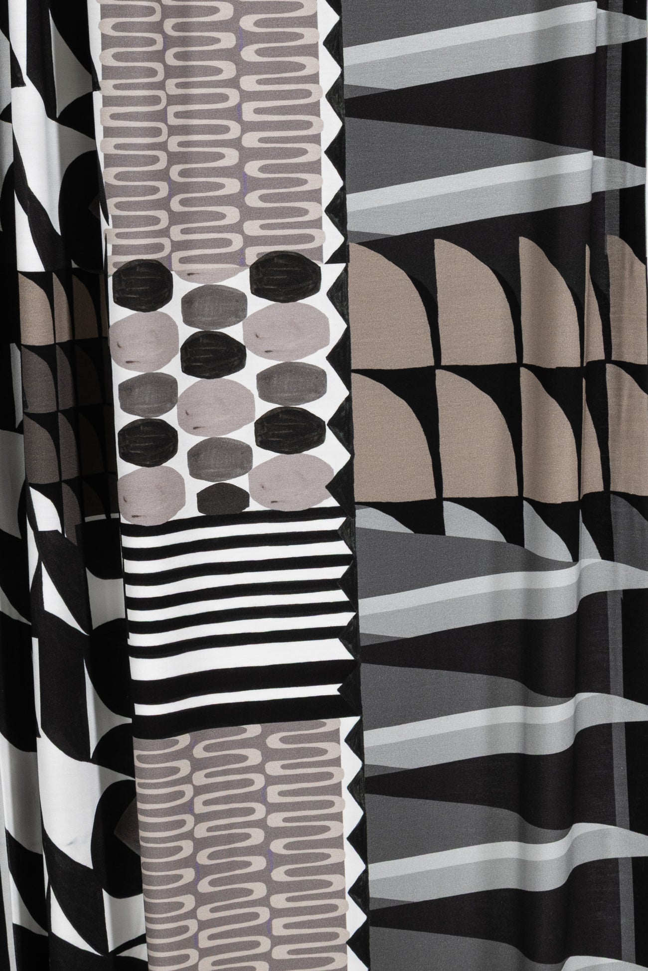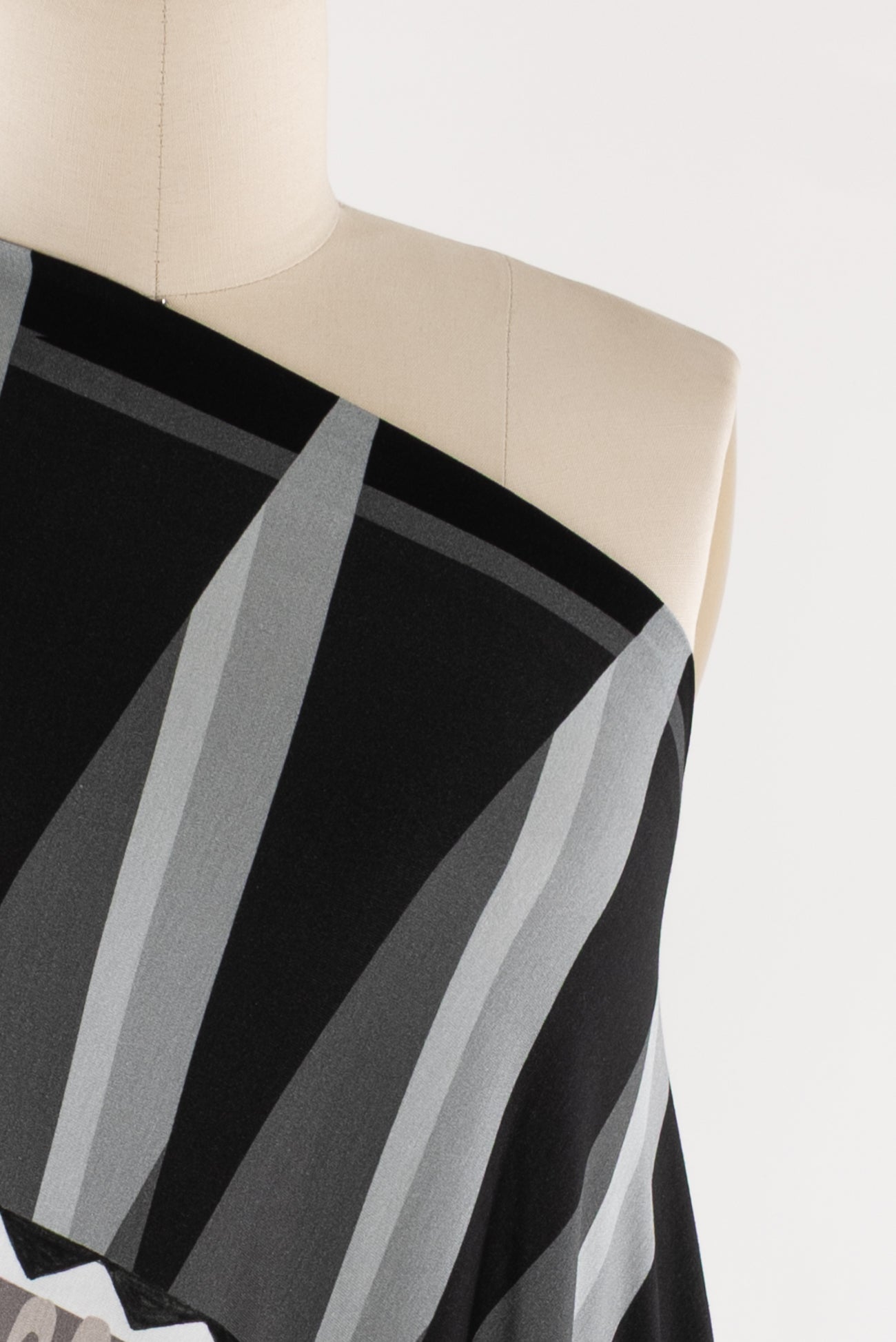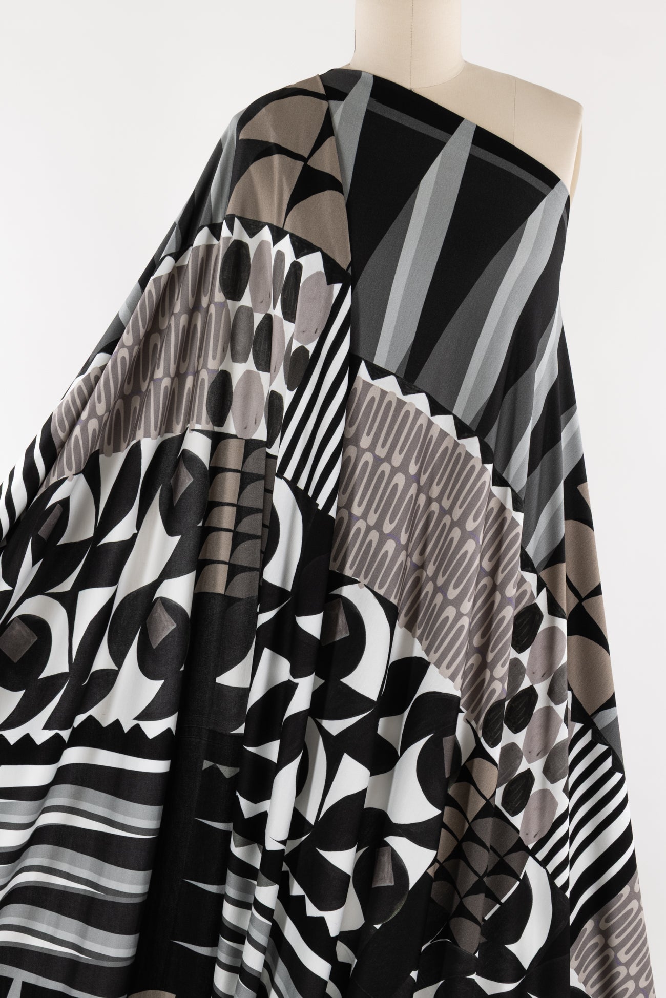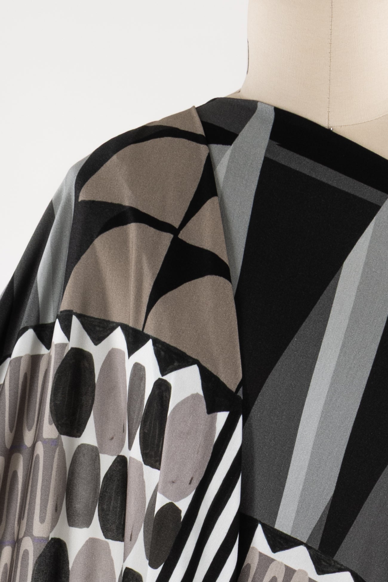 Luxurious viscose knit jersey, digitally printed in the Netherlands, features a dramatically color-saturated print. The black, white, and mocha design beautifully blends striking geometric elements. Impeccable quality, light/mid-weight, opaque, with a flattering body-skimming flow, appealing soft hand, fluid drape, crosswise stretch, some lengthwise stretch, a 28" repeat, and some rolling at the cut edge. Ideal for a wide range of garments, t-shirt, tunic, dress, skirt, soft pants, loungewear, caftan, kimono, or children's. Oeko-Tex® certified.