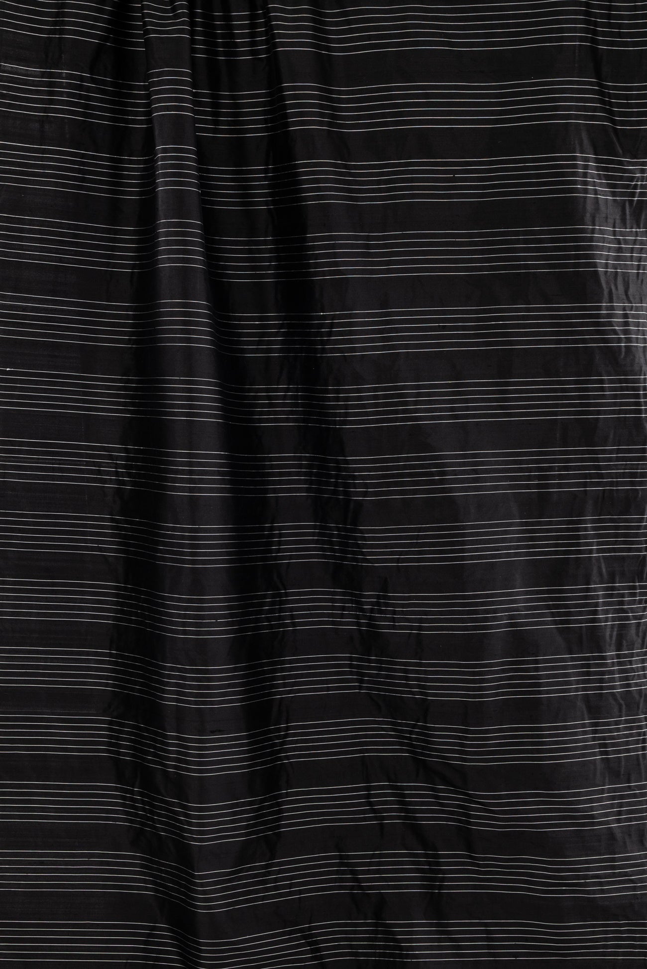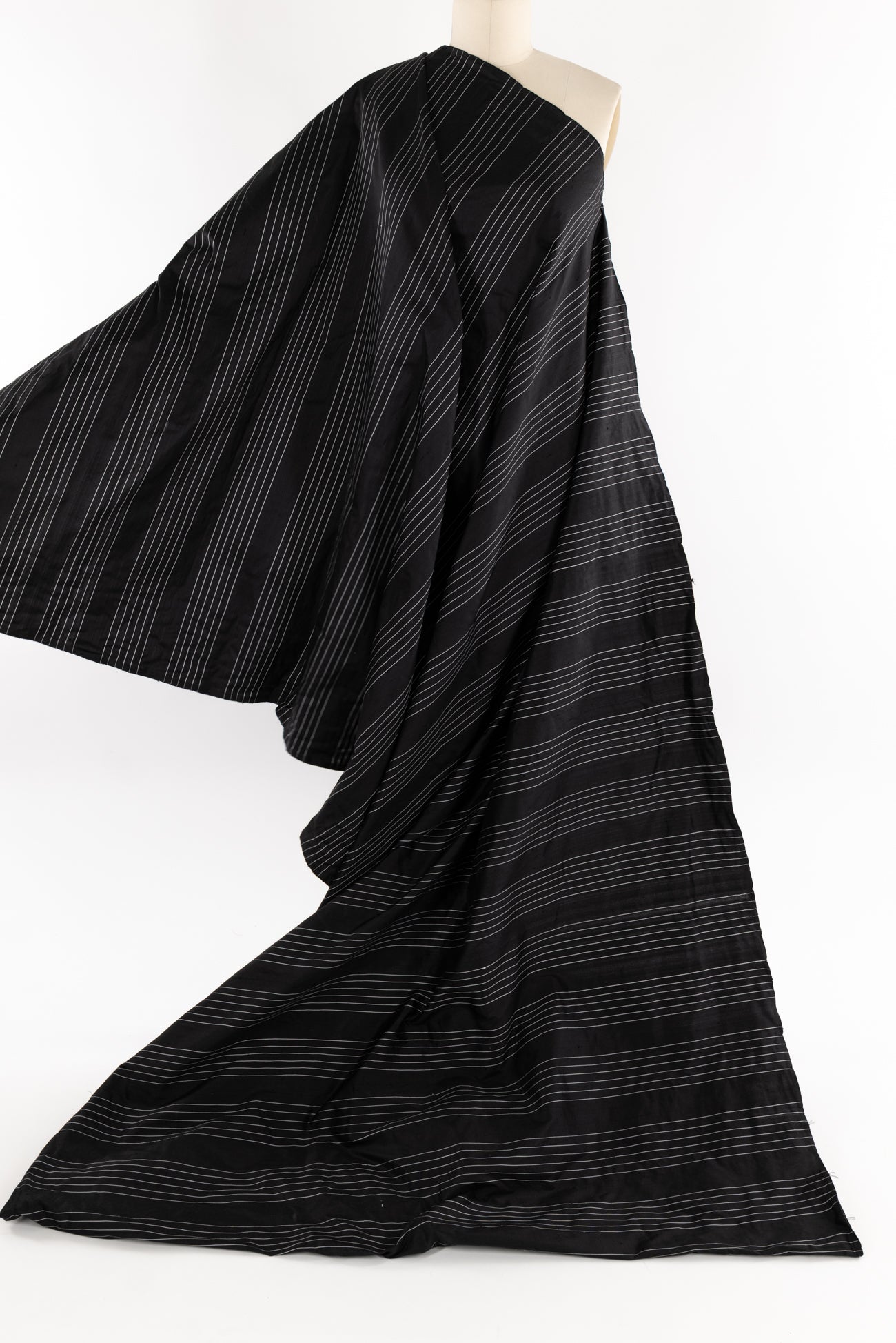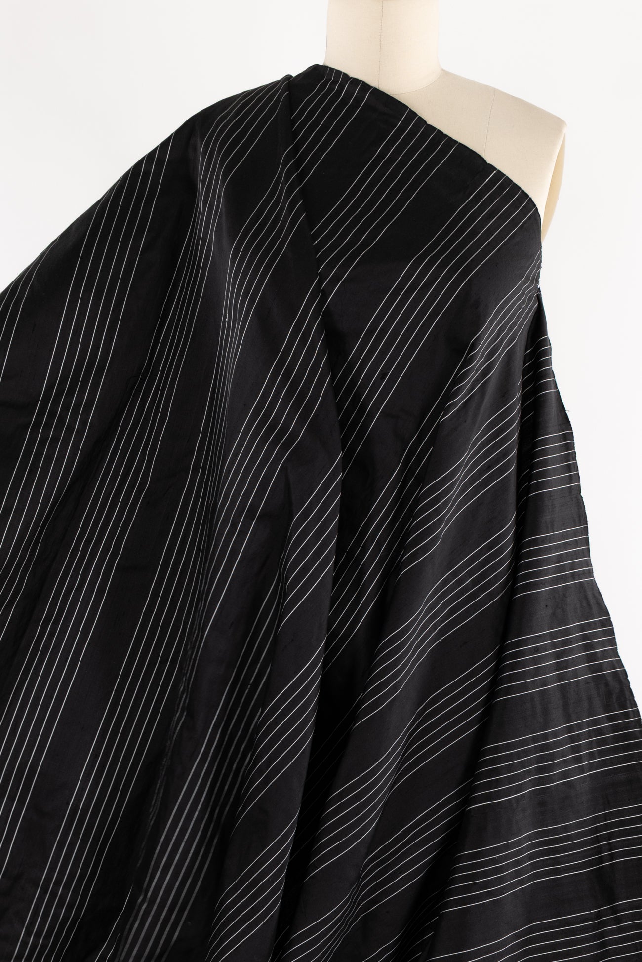 Striped silk taffeta with bands of narrow spaced stripes in black and white in a 4" repeat. I might cut this on the cross-grain so the stripes/yarns run vertically, but you could also cut on the lengthwise grain or bias. Lightweight, silky smooth, and lightly crisp with a malleable hand and airy drape. Dress it up or down, make a dress, shirt, skirt, vest, duster coat, or sculptural airy pants.