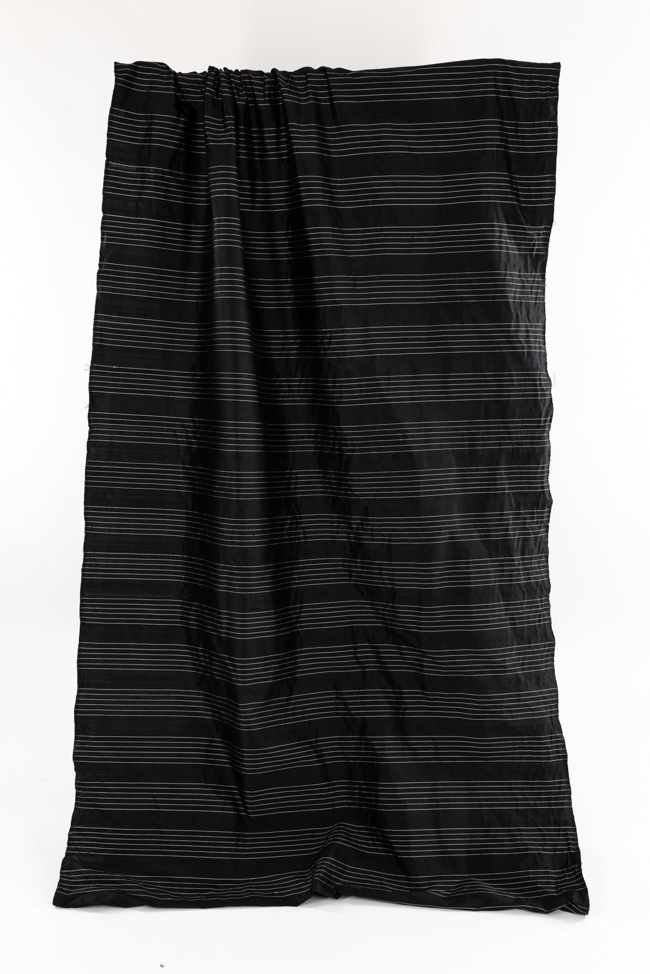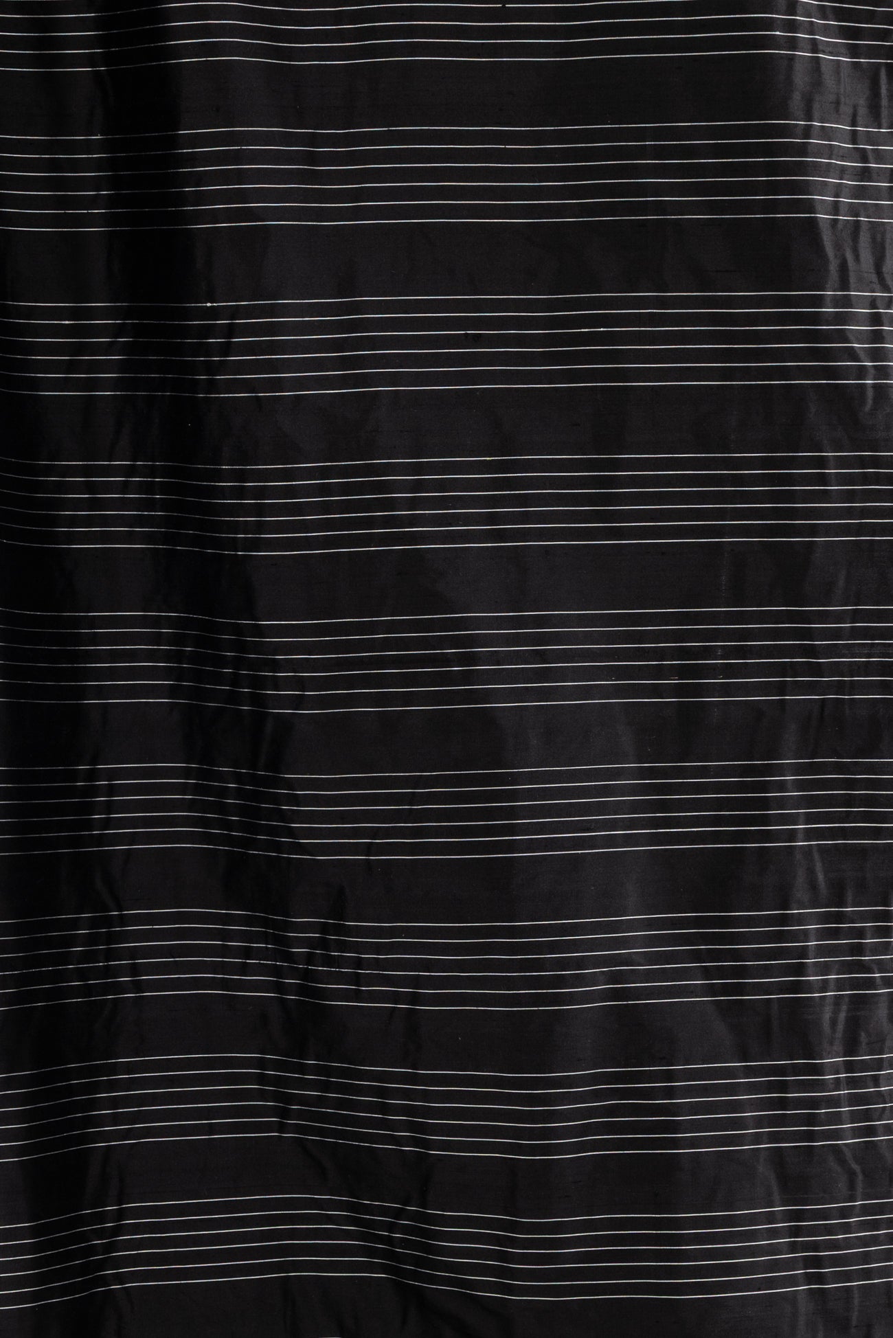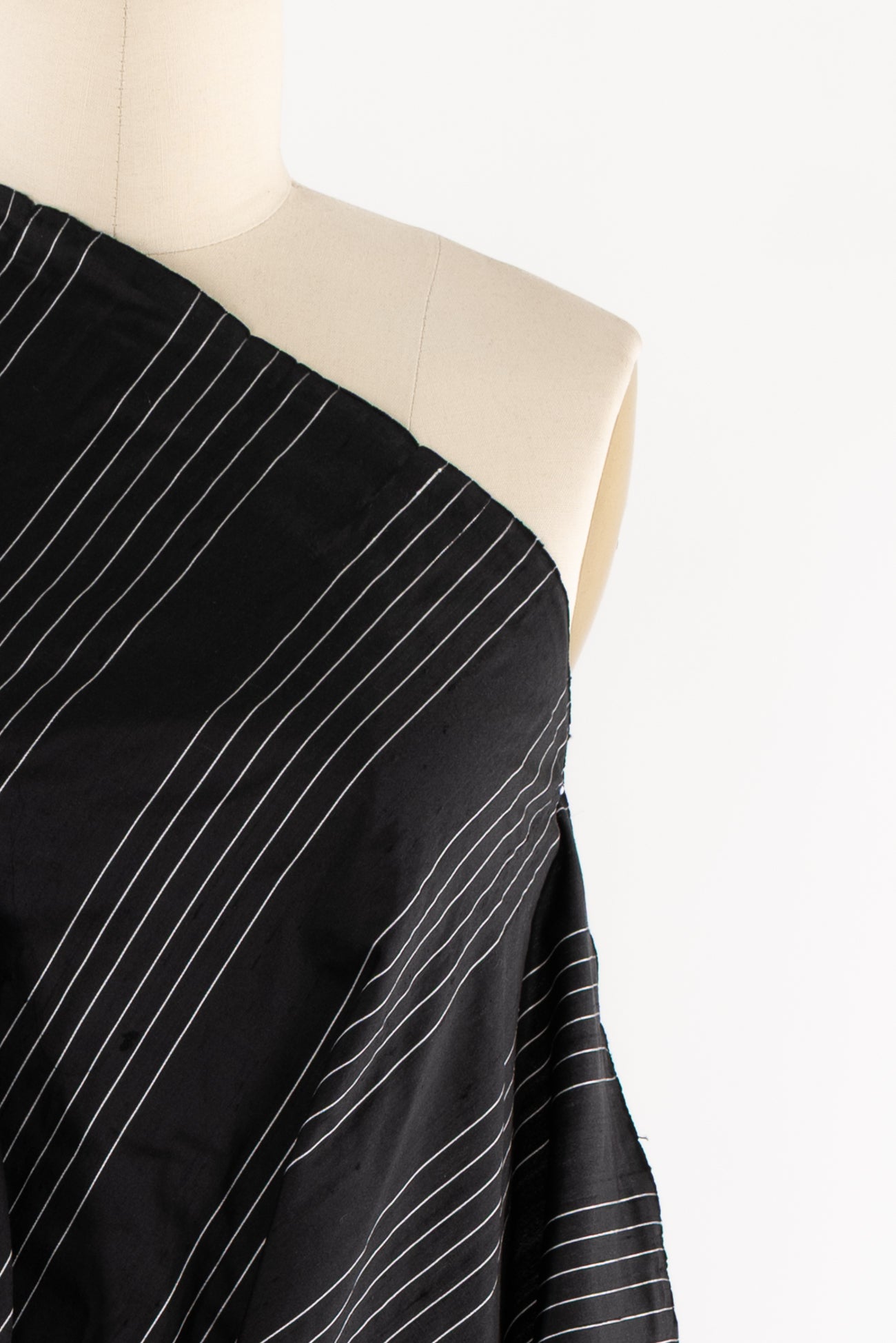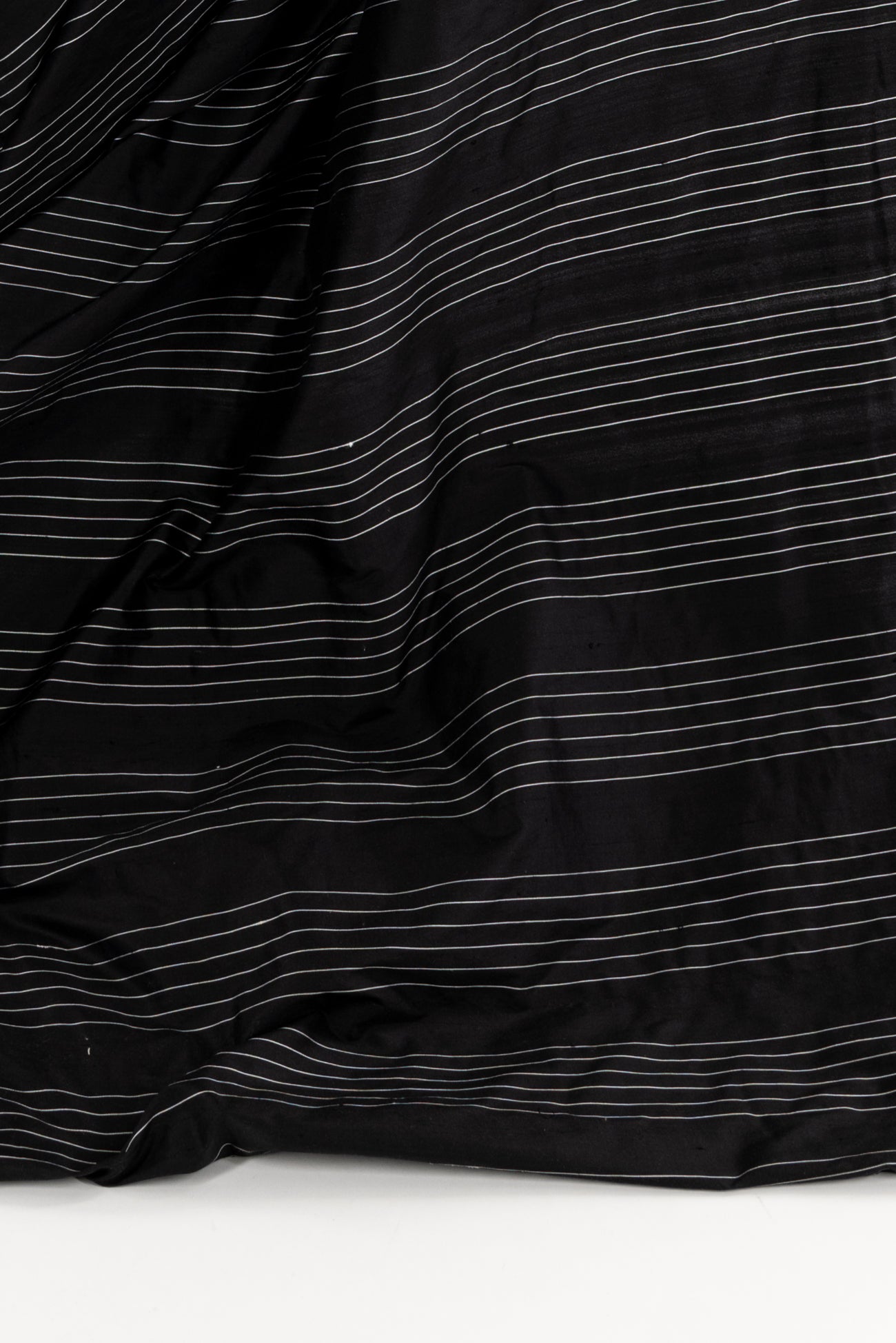 Striped silk taffeta with bands of narrow spaced stripes in black and white in a 4" repeat. I might cut this on the cross-grain so the stripes/yarns run vertically, but you could also cut on the lengthwise grain or bias. Lightweight, silky smooth, and lightly crisp with a malleable hand and airy drape. Dress it up or down, make a dress, shirt, skirt, vest, duster coat, or sculptural airy pants.