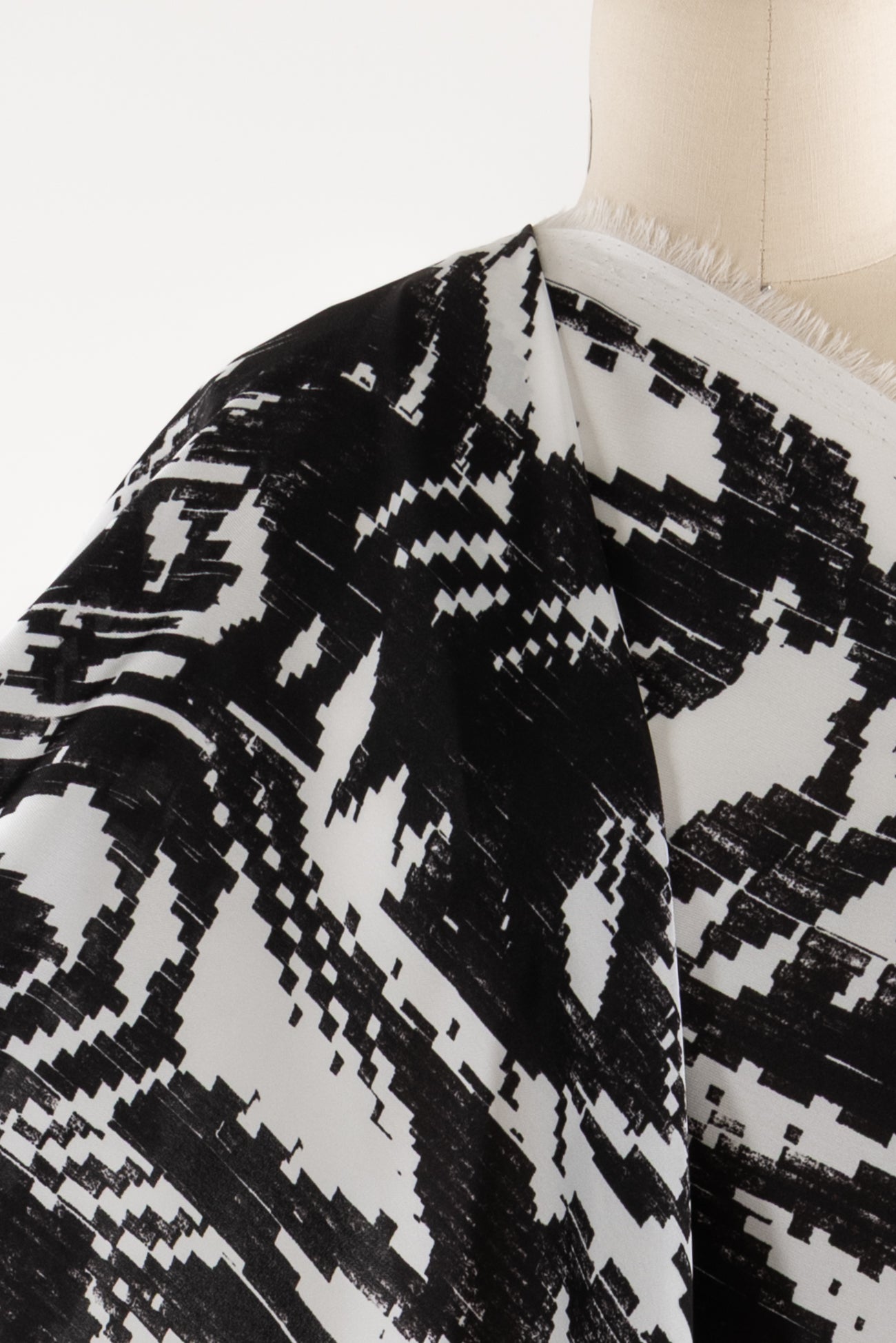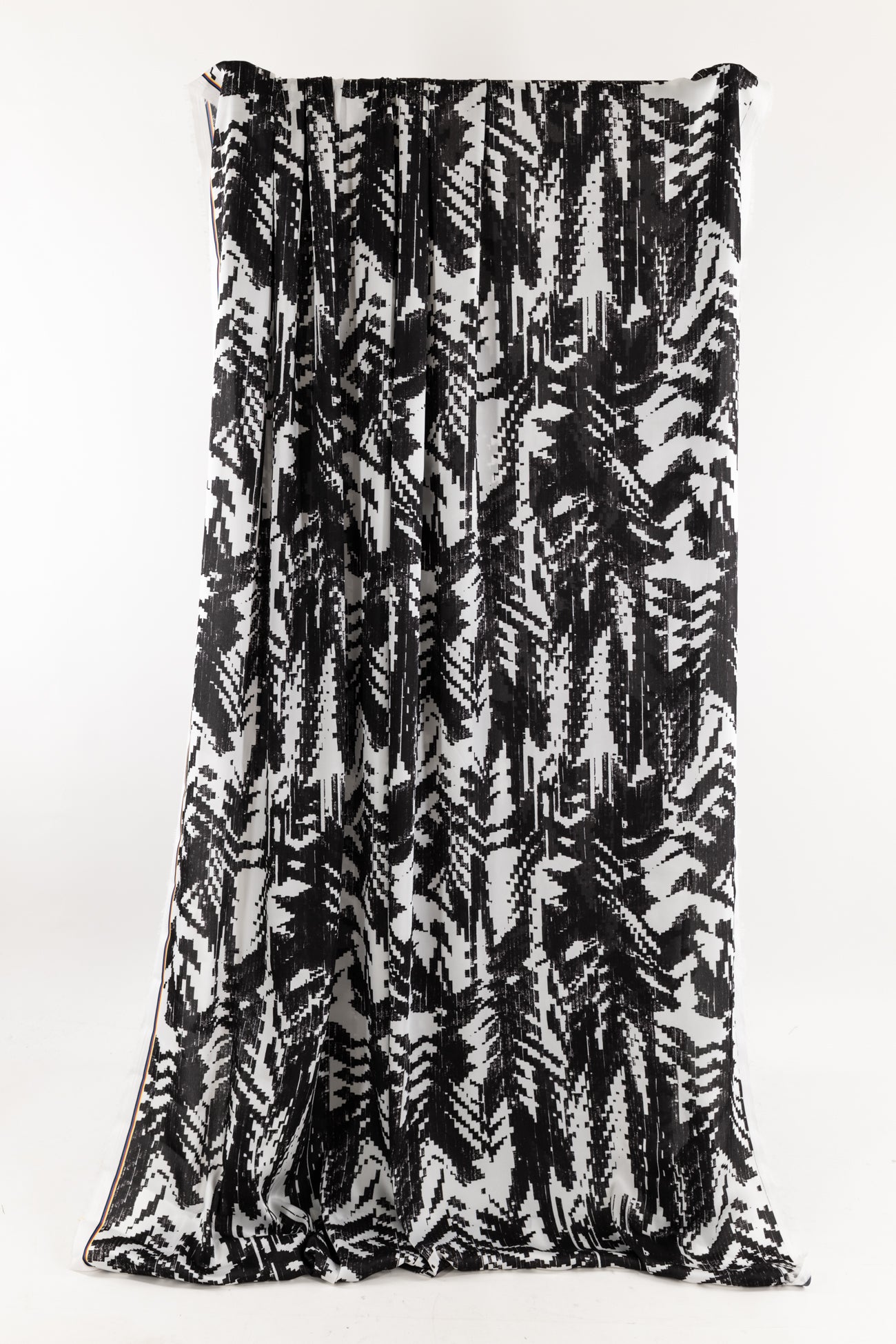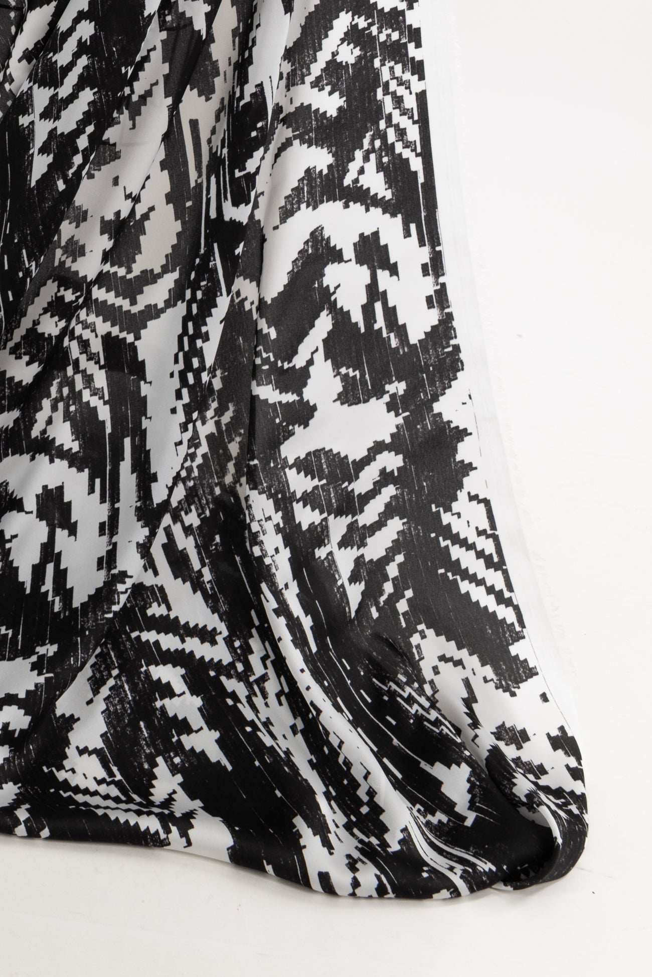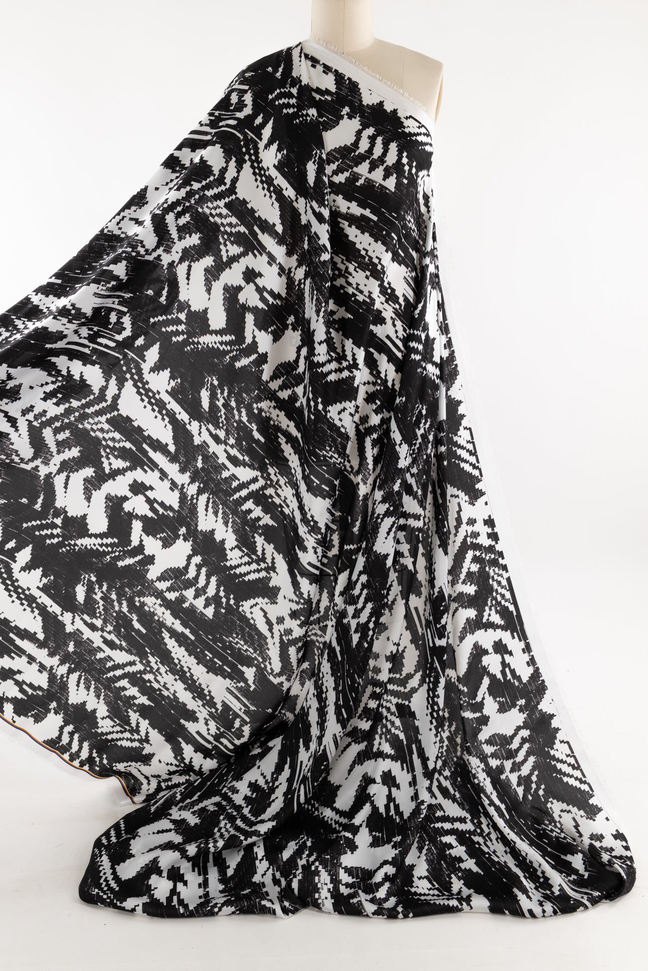 Artfully abstract black and white print with an ethnic feel on a fine poly woven, elegant deadstock from an LA designer. Light/mid-weight with a smooth silky hand, a 25" repeat, and soft airy drape. Right for a tunic, shirt, dress, kimono, caftan, loungewear, or soft pant.
