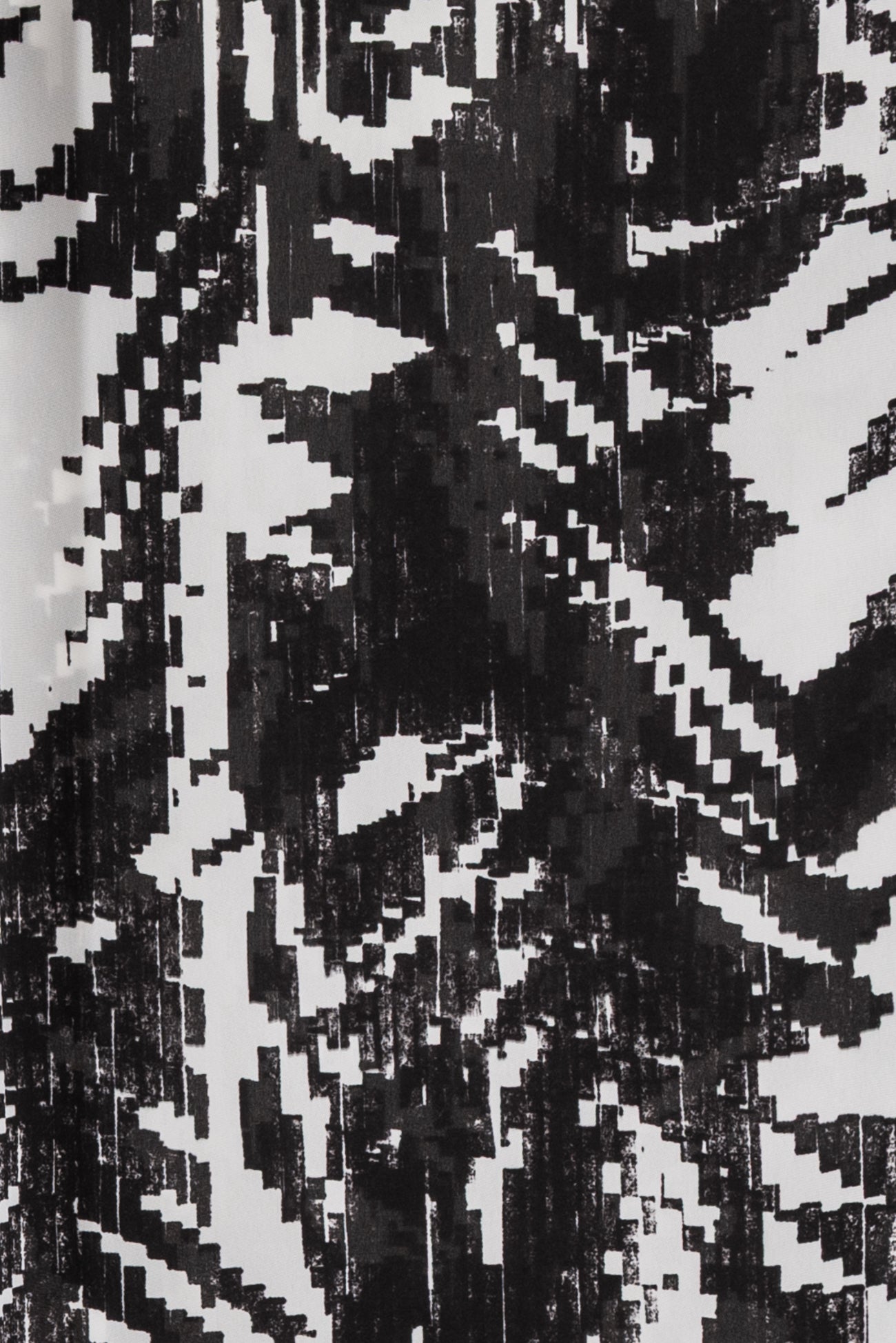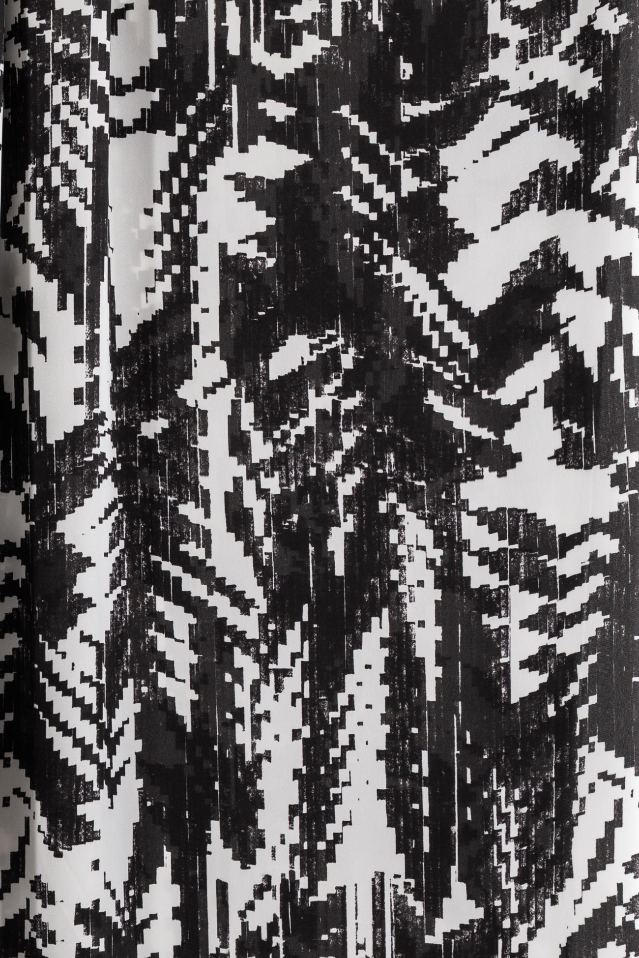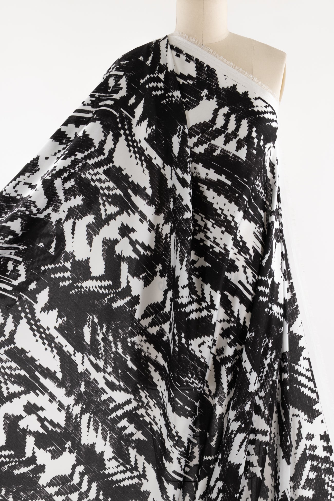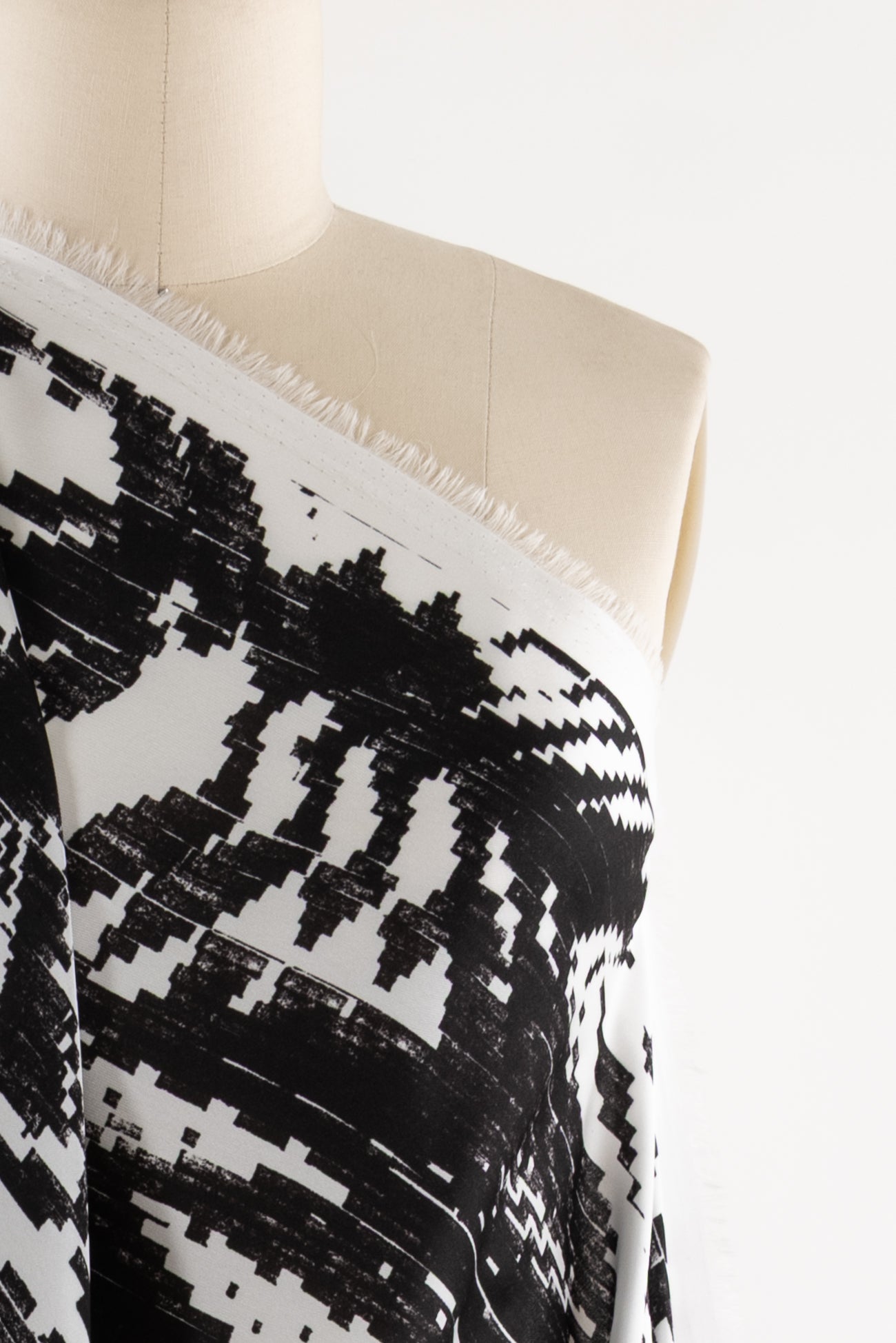 Artfully abstract black and white print with an ethnic feel on a fine poly woven, elegant deadstock from an LA designer. Light/mid-weight with a smooth silky hand, a 25" repeat, and soft airy drape. Right for a tunic, shirt, dress, kimono, caftan, loungewear, or soft pant.