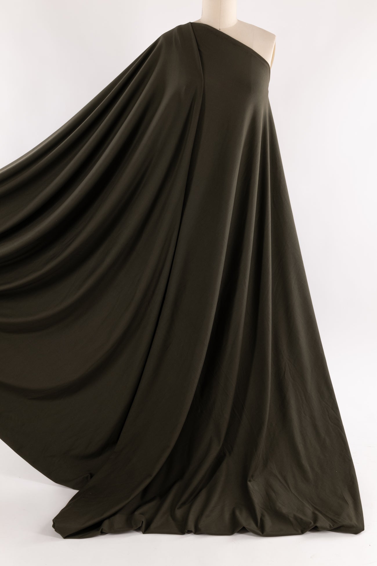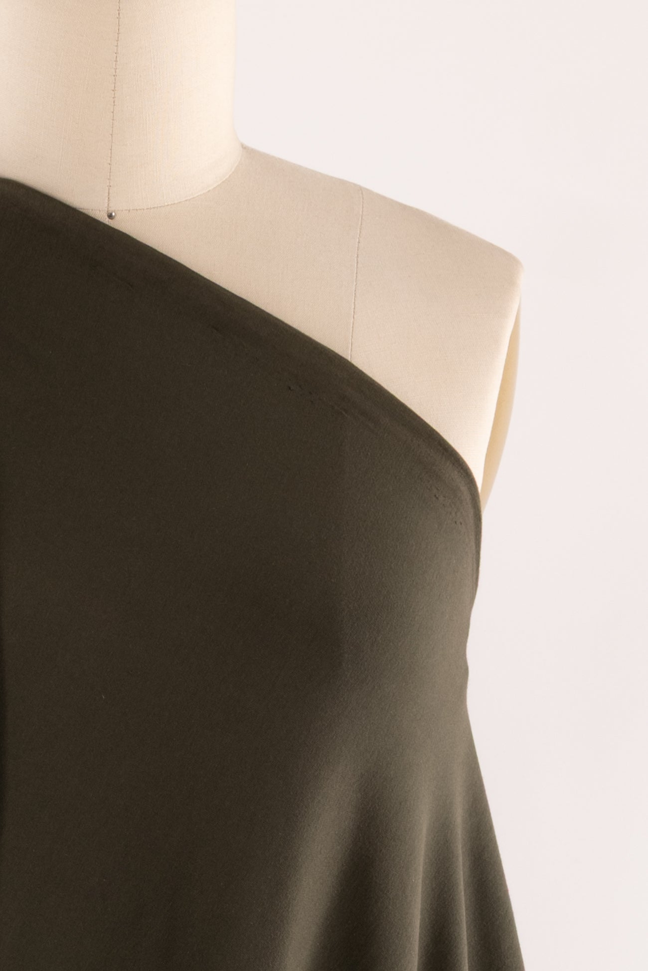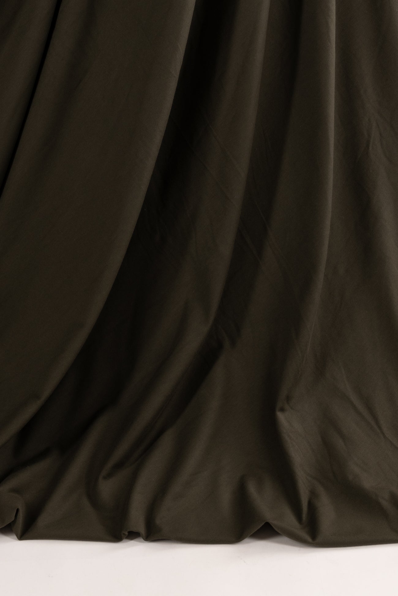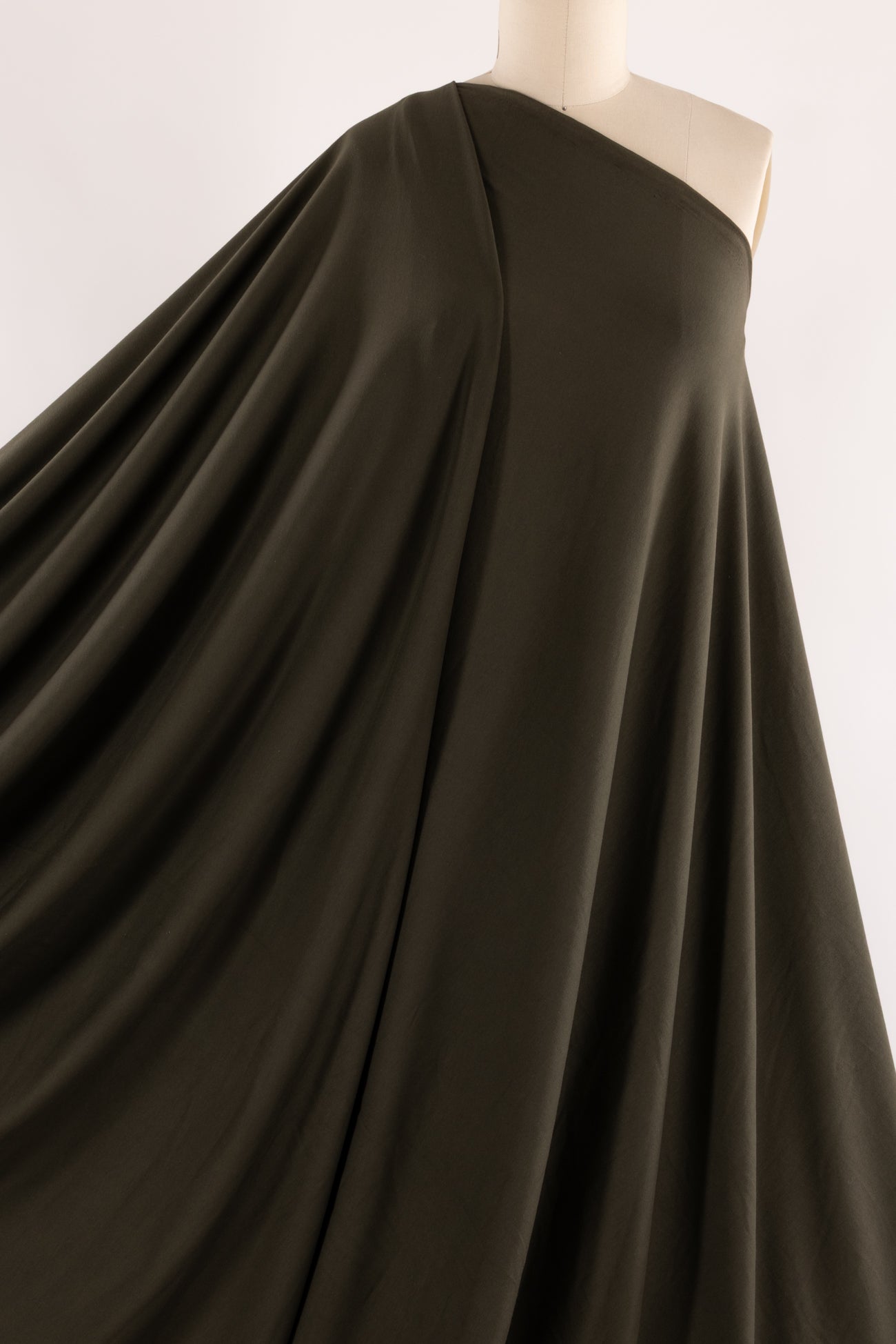 Spicy oregano, a deep olive verging to brown, in a fine jersey, beautiful quality in an elevated basic, deadstock from Eileen Fisher. Lightweight with a smooth, fine texture, fluid drape, 4-way stretch, and some rolling at the cut edge. Right for a t-shirt, tunic, cardigan, dress, skirt, soft pants or caftan. Limited quantity available.