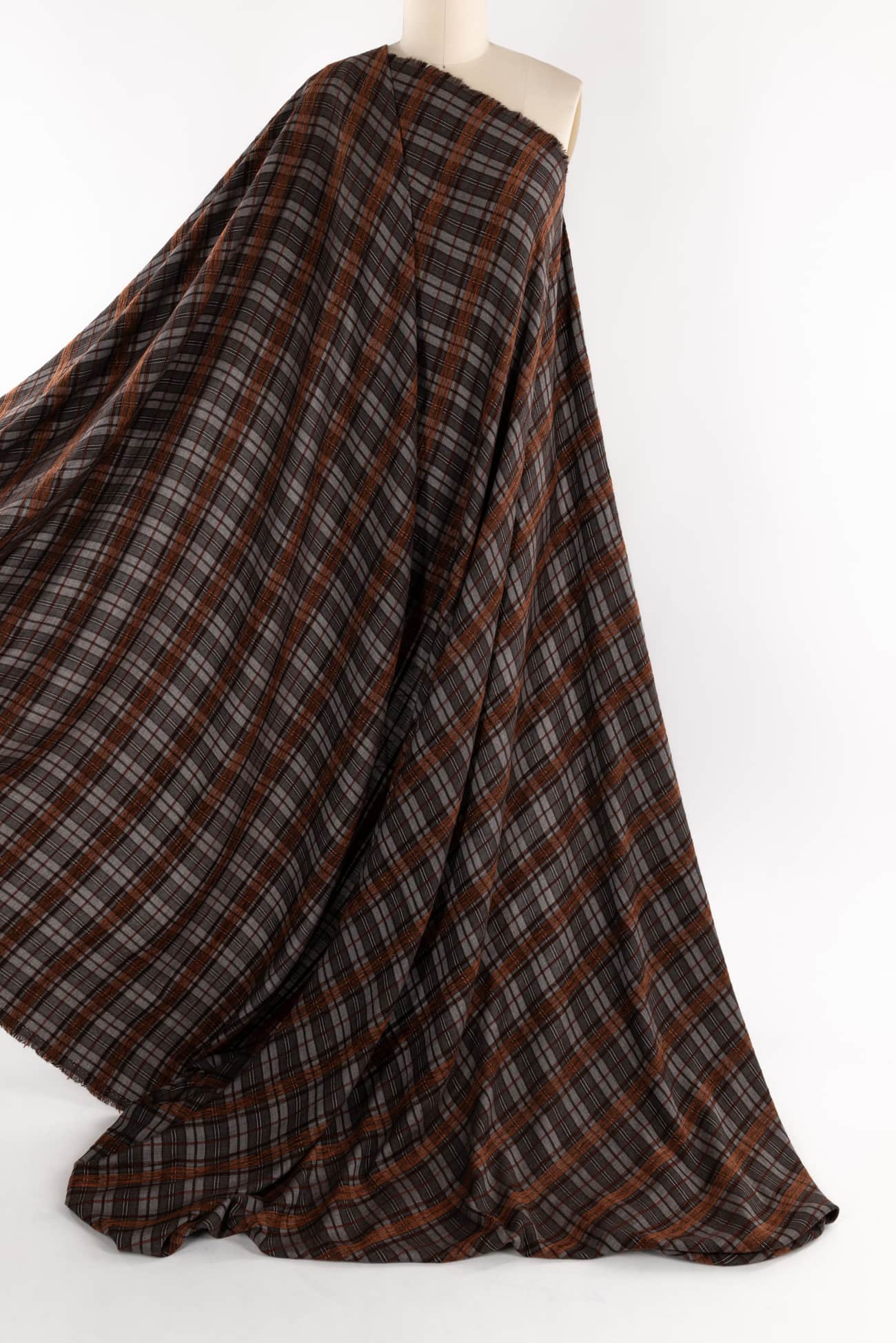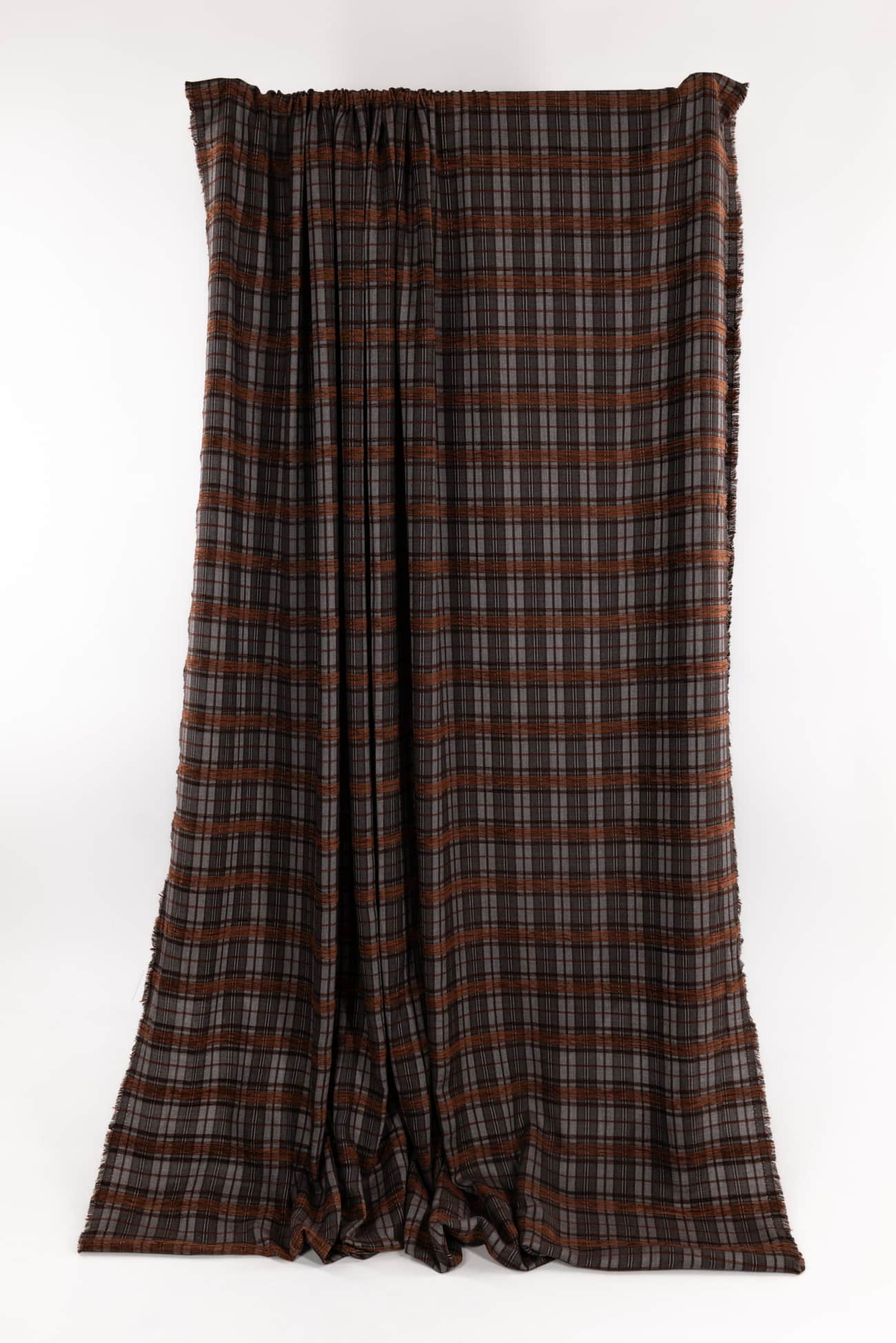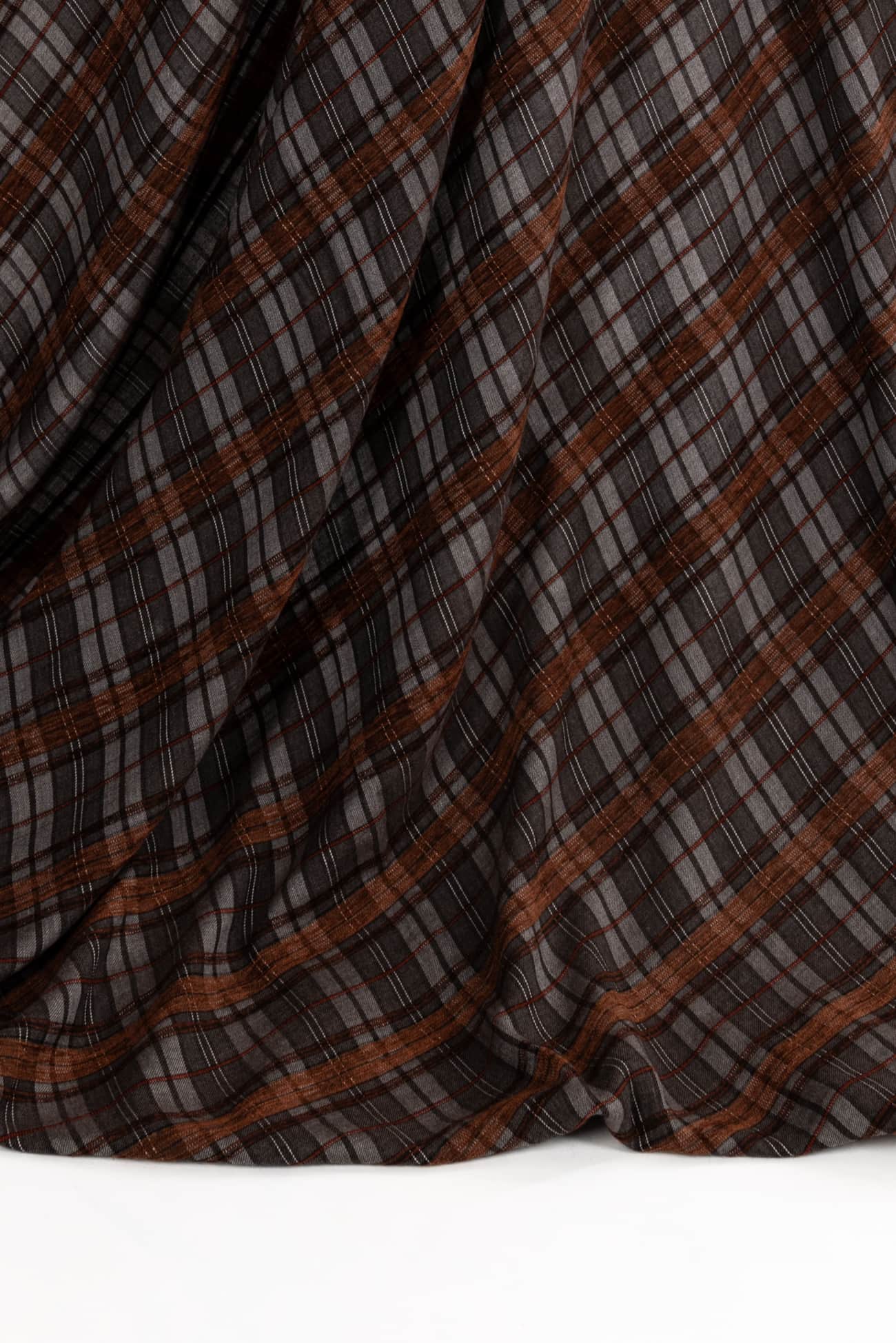 Wonderful warm-toned plaid in brown, rust and white in a fine quality viscose blend woven. Designer deadstock from an Italian mill. Lightweight, yarn dyed, with softly dimensional chenille accents, buttery soft with a 3" repeat and liquid drape. Right for a shirt, tunic, dress, caftan, skirt, soft pants men's or childrens.