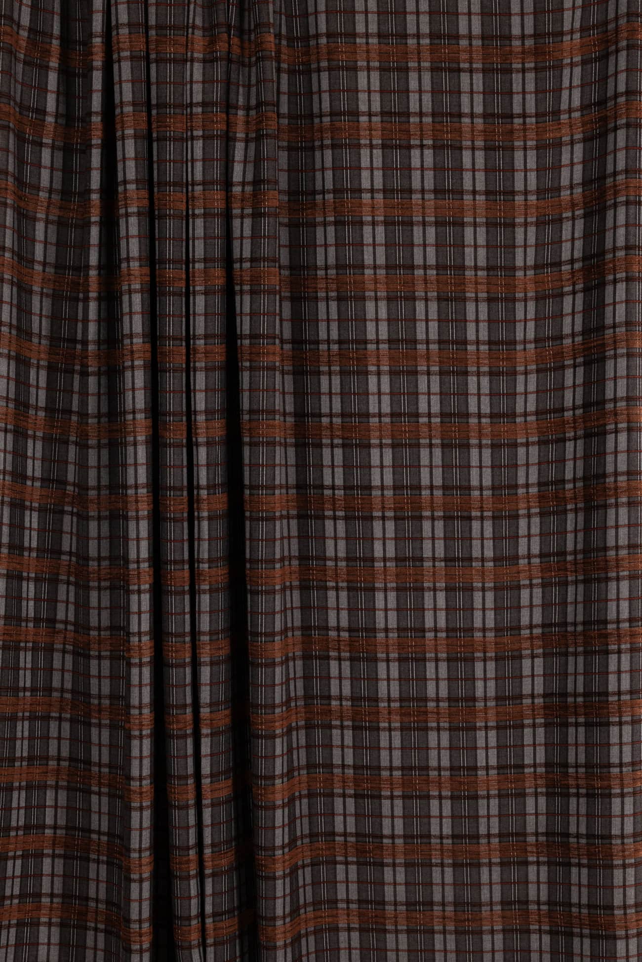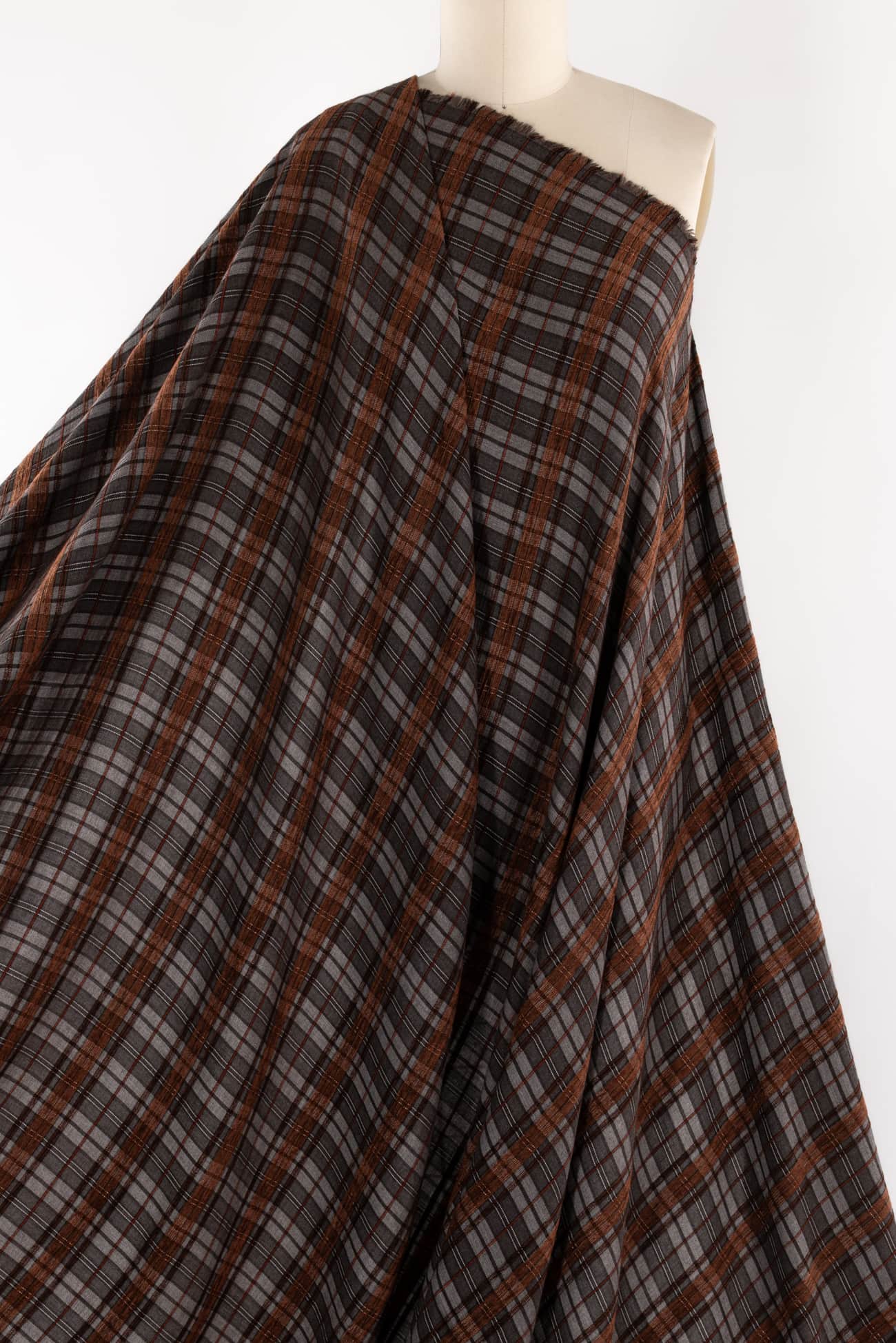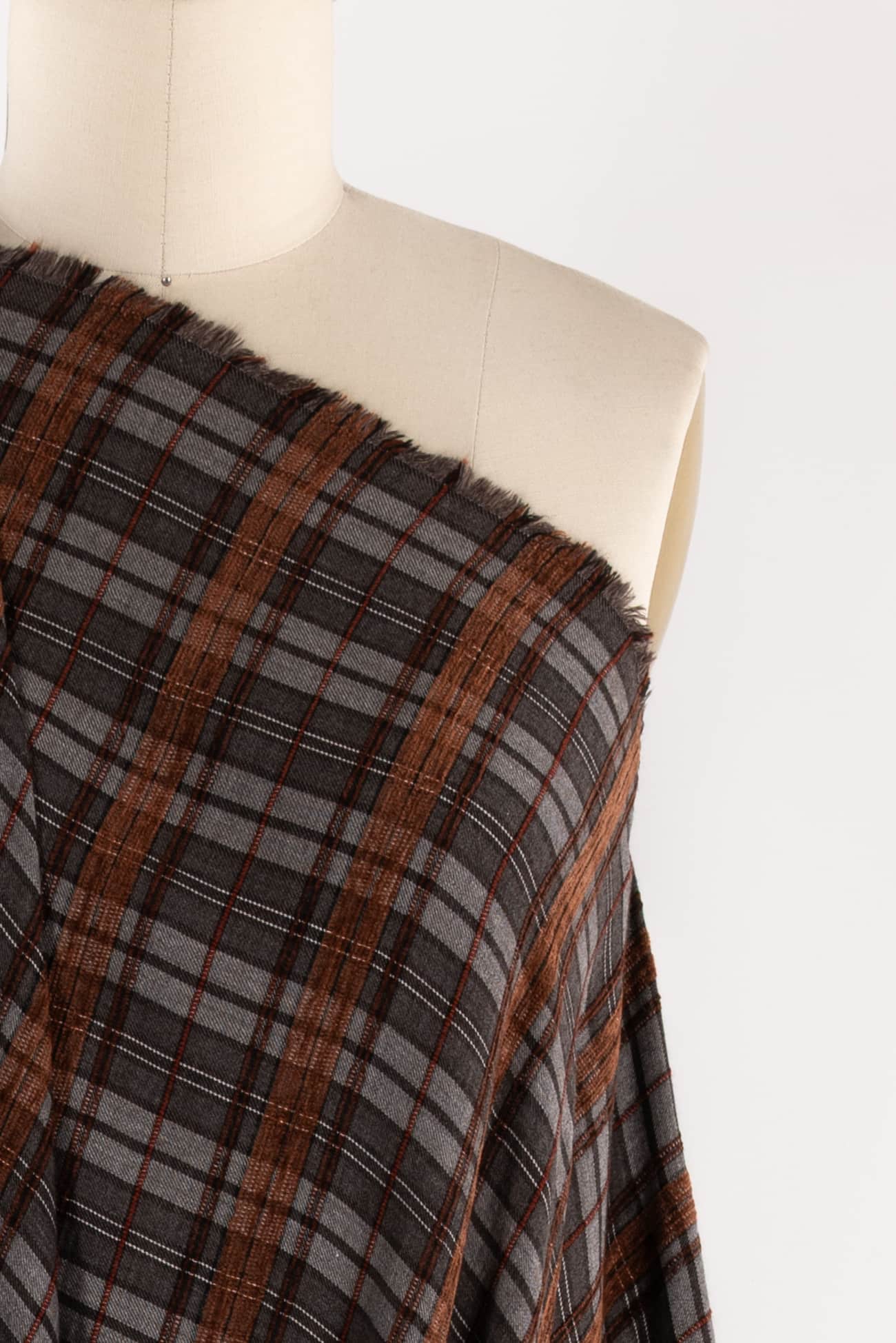 Wonderful warm-toned plaid in brown, rust and white in a fine quality viscose blend woven. Designer deadstock from an Italian mill. Lightweight, yarn dyed, with softly dimensional chenille accents, buttery soft with a 3" repeat and liquid drape. Right for a shirt, tunic, dress, caftan, skirt, soft pants men's or childrens.