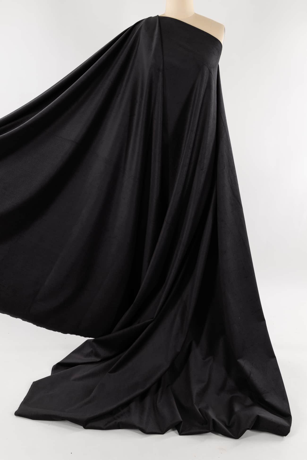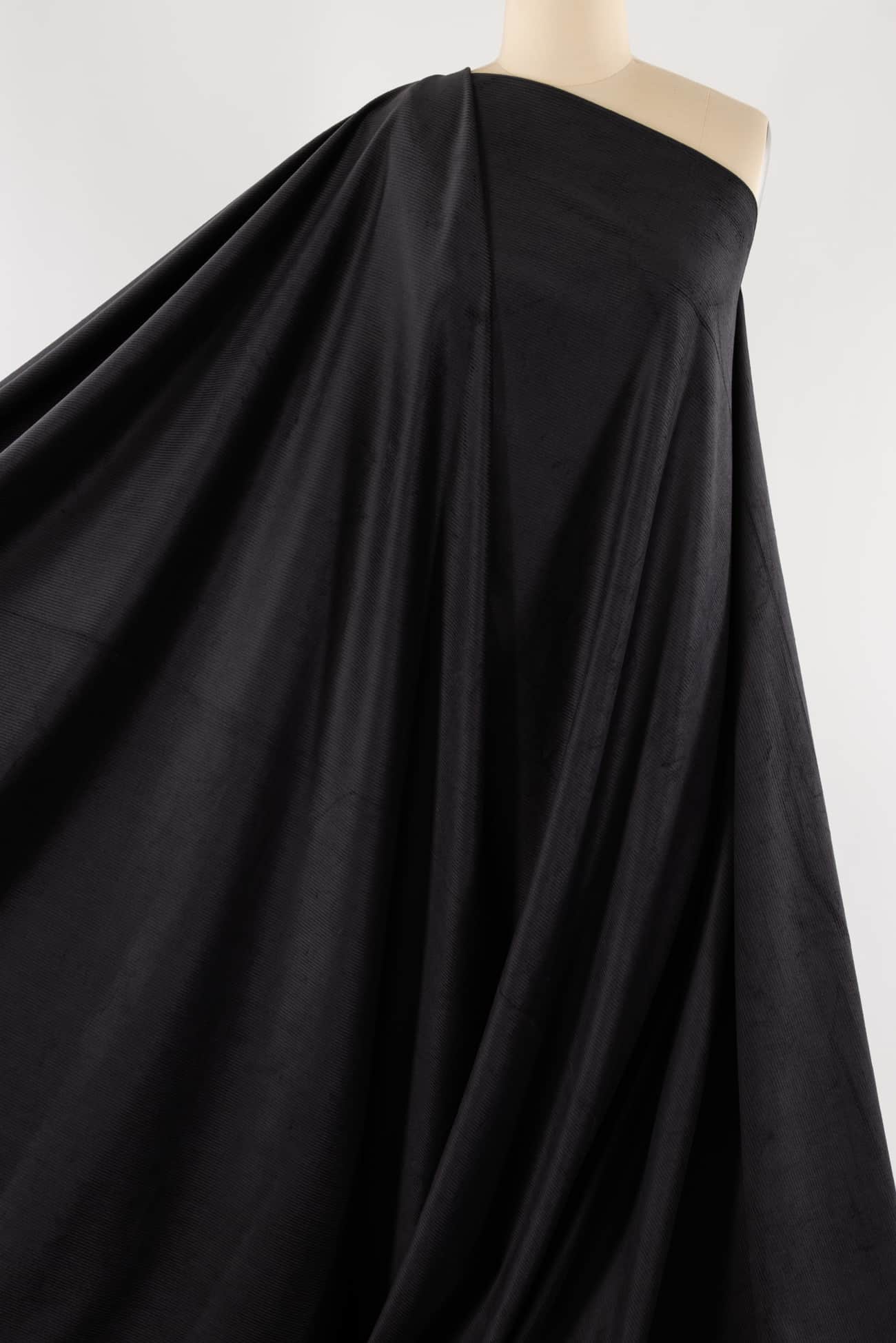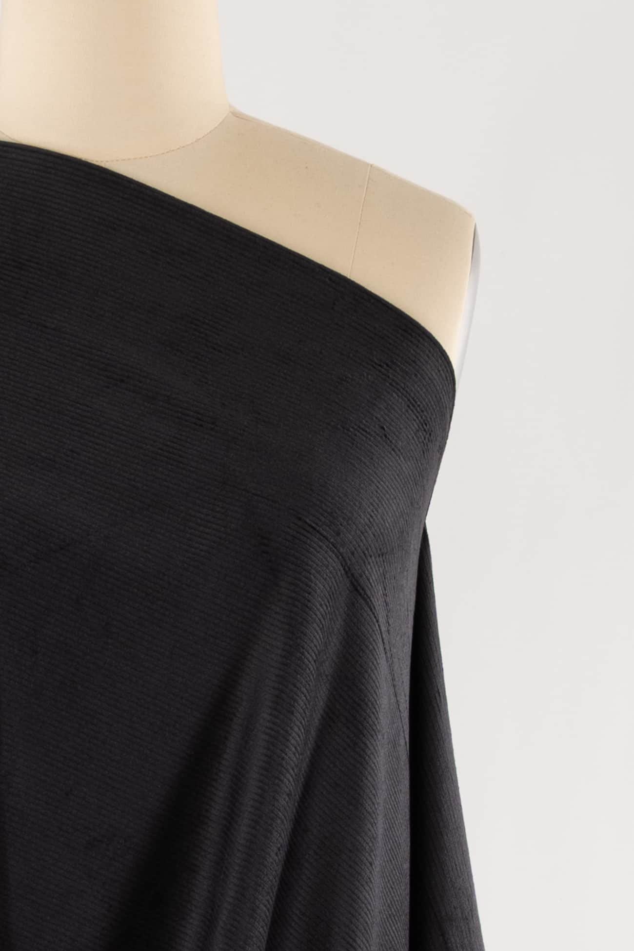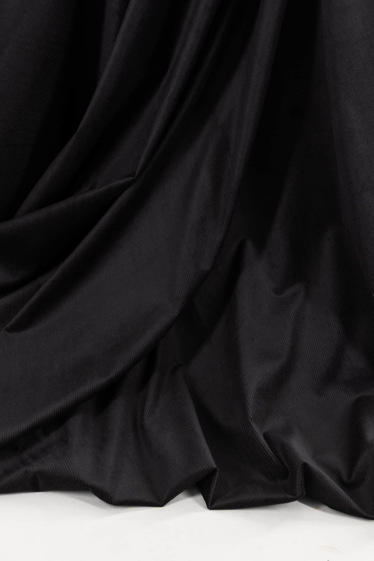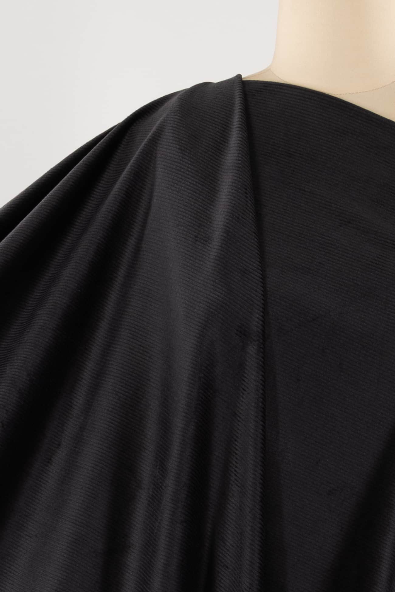 Pewter gray in a classic lush mid-wale stretch corduroy, fine quality deadstock from an LA designer. Mid-weight with a soft hand, some crosswise stretch, a light drape and 10 wales/inch. Right for a jacket, light coat, vest, dress, shirt, skirt, pants, men's or children's. Cut for nap.