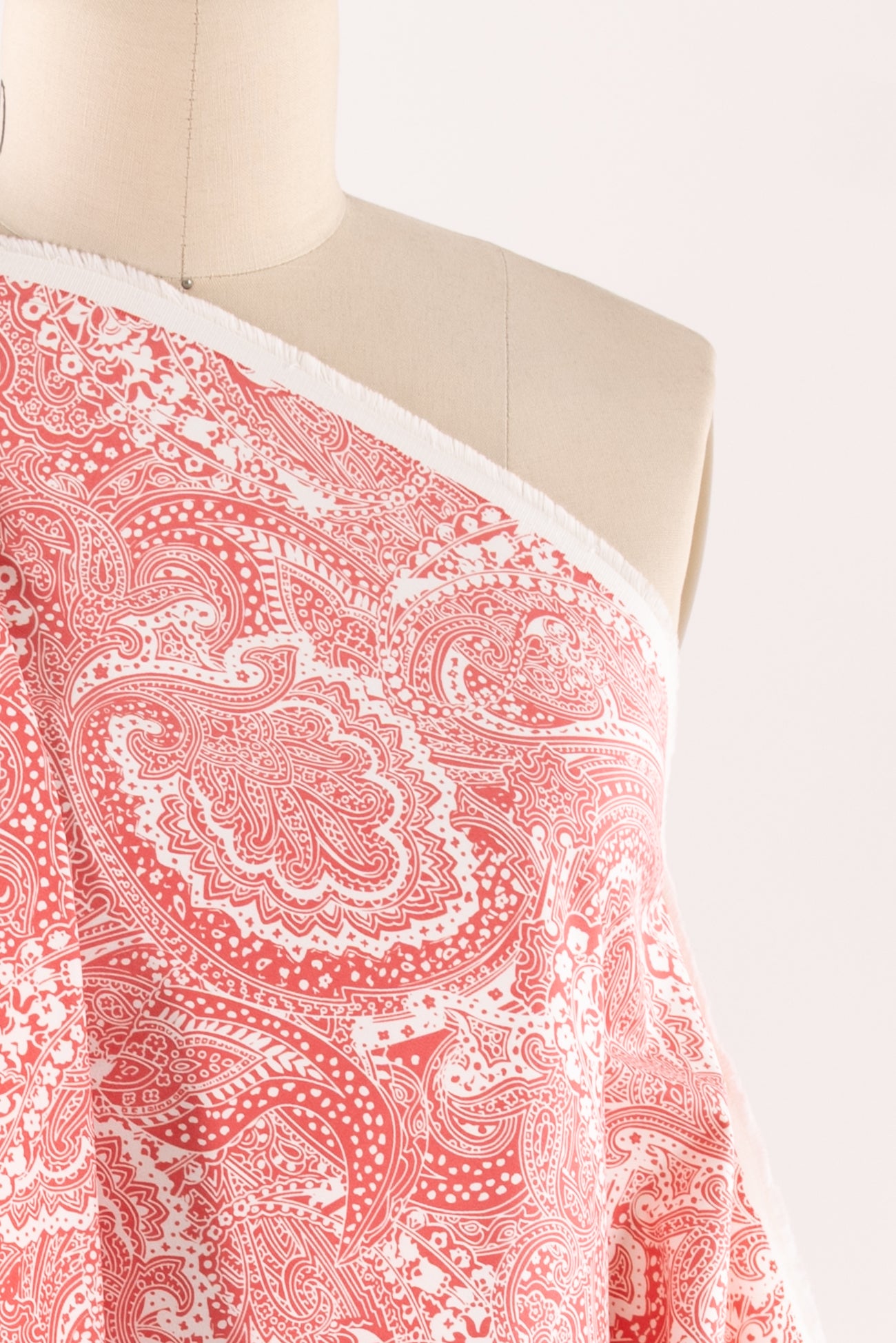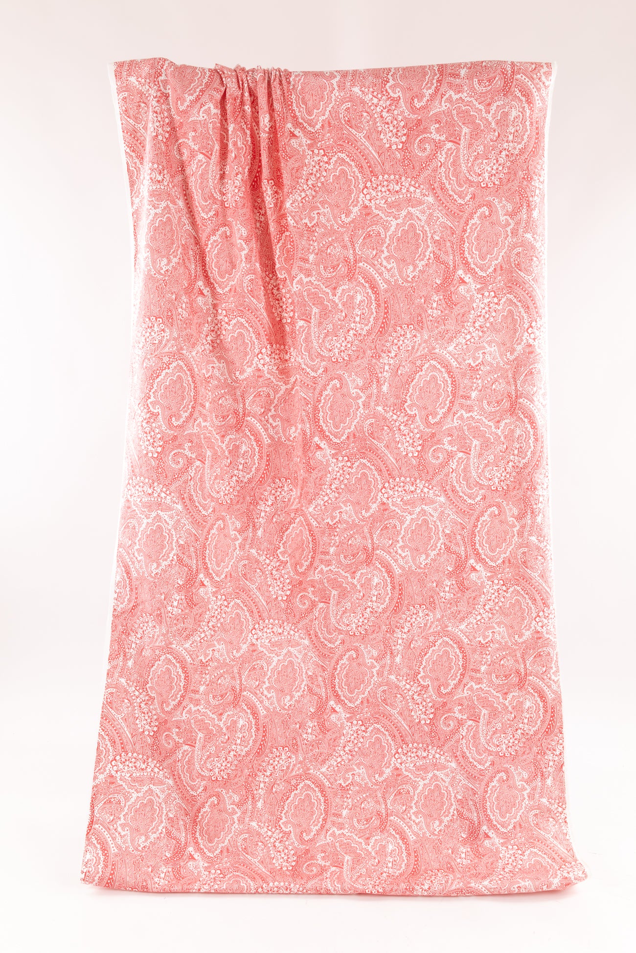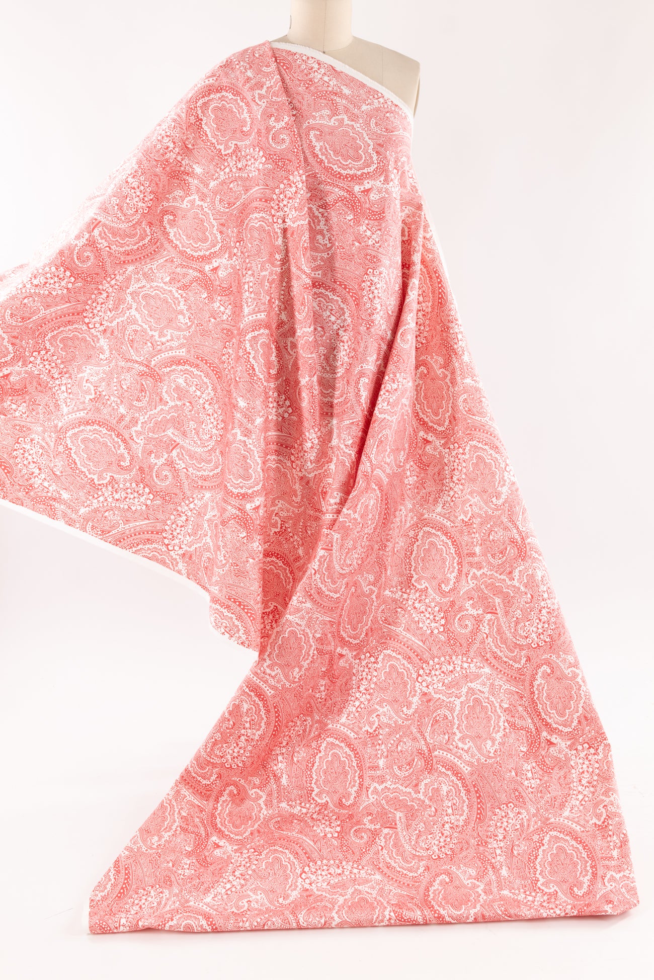 Peppermint pink on white paisley in a lovely quality stretch cotton, deadstock from an LA designer. Mid-weight with a soft, smooth, matte sateen hand, lightly crisp drape, a 23" repeat and crosswise stretch with good recovery. Right for a shirt, dress, skirt, soft pant, jeans, a light jacket, kimono, caftan or fun workwear. Limited quantity available.