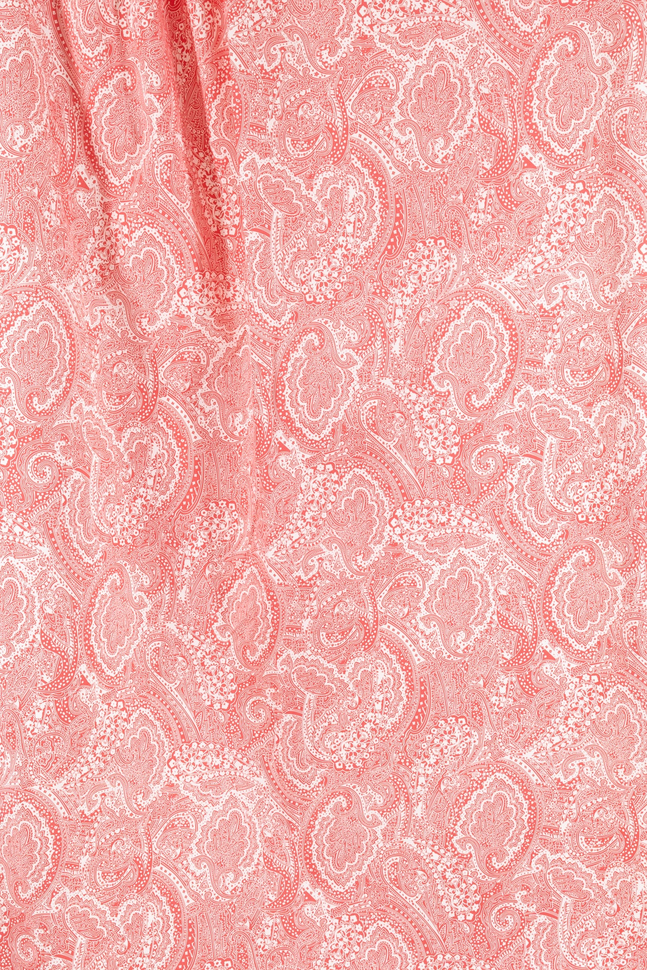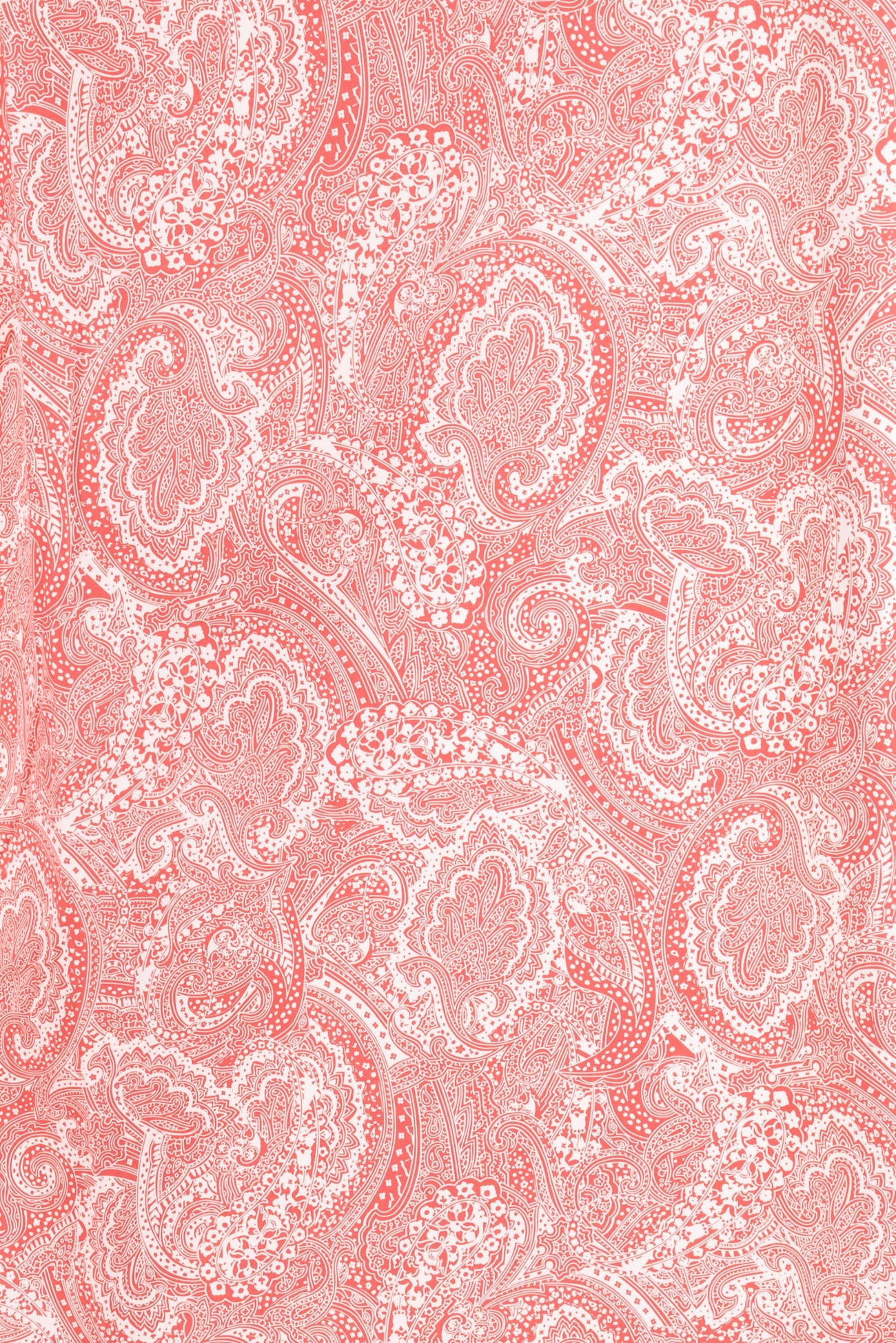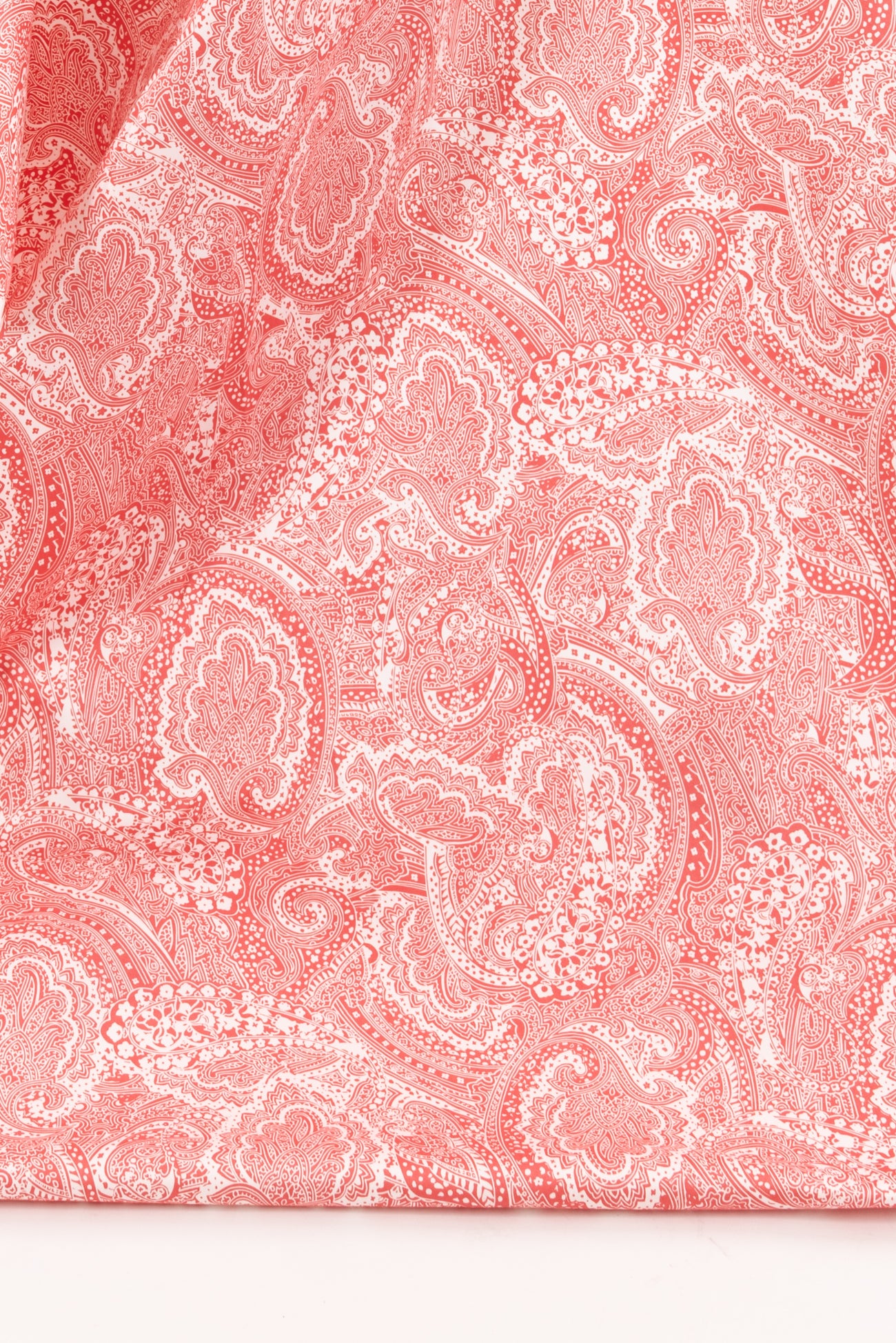 Peppermint pink on white paisley in a lovely quality stretch cotton, deadstock from an LA designer. Mid-weight with a soft, smooth, matte sateen hand, lightly crisp drape, a 23" repeat and crosswise stretch with good recovery. Right for a shirt, dress, skirt, soft pant, jeans, a light jacket, kimono, caftan or fun workwear. Limited quantity available.