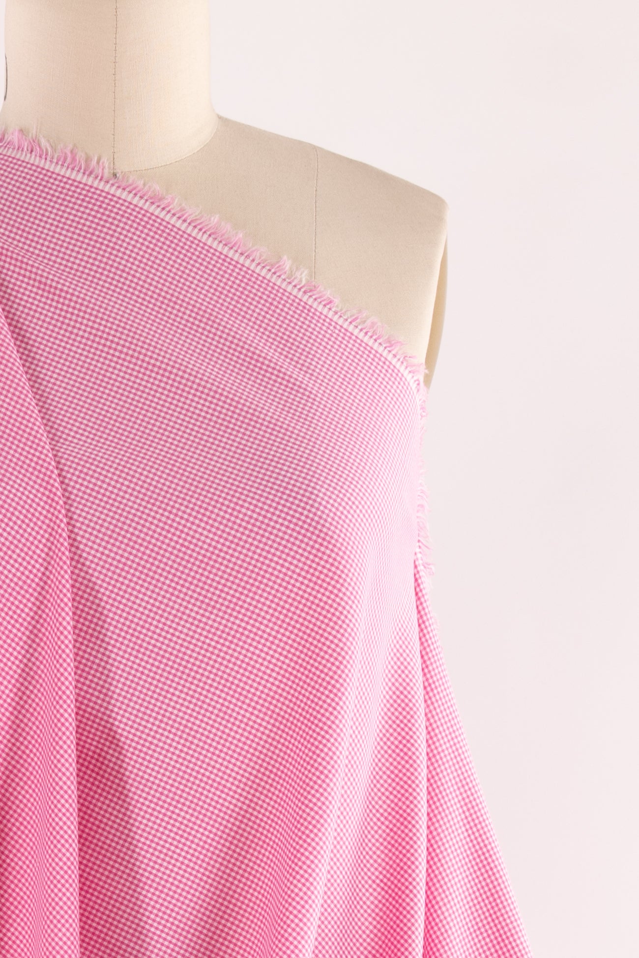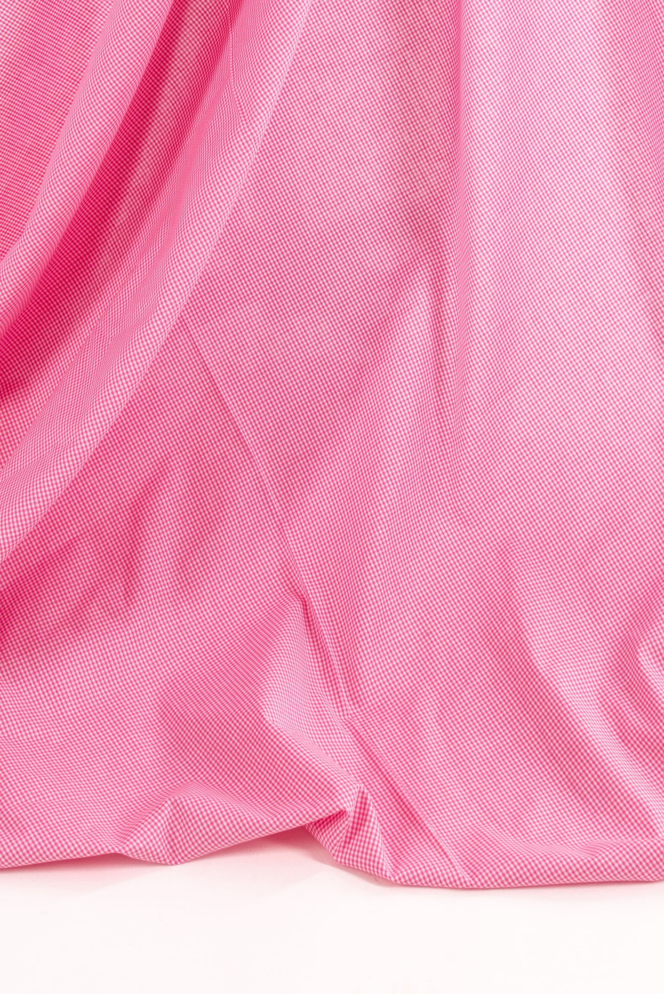 Tiny bubblegum pink and white yarn-dyed gingham checks on an impeccable quality cotton woven, deadstock from a NYC designer. Fine grained shirting weight, with an appealing smooth hand and a soft drape. Right for a dress, shirt, tunic, skirt, soft pants, caftan, kimono, children's, or menswear.