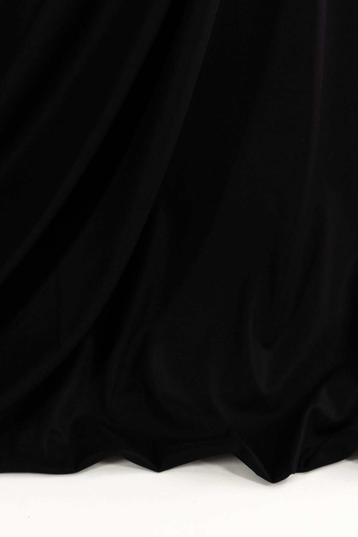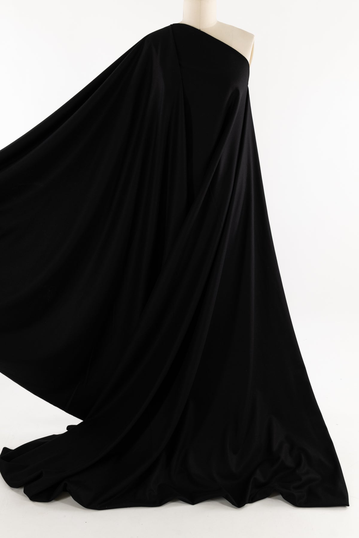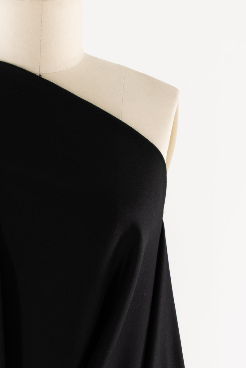 Elegant and classic black cashmere blend, supple deadstock produced in an Italian mill. Impeccable light flannel weight with a soft brushed hand (cut for a nap) and beautiful airy drape. Right for a jacket, light coat, vest, dress, skirt, pants, shirt-jacket, shawl, scarf, or menswear.