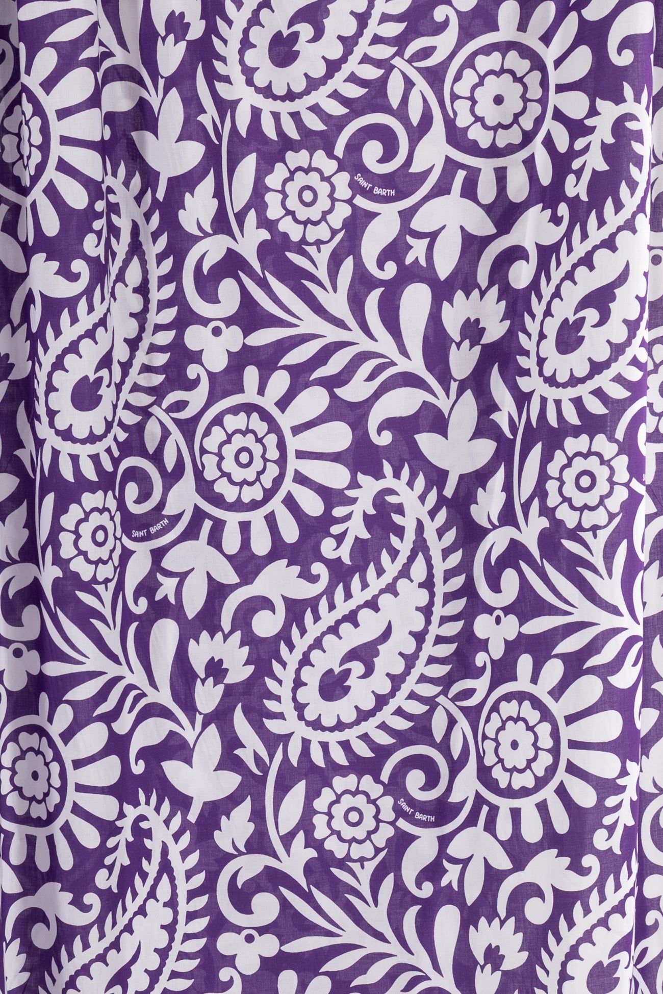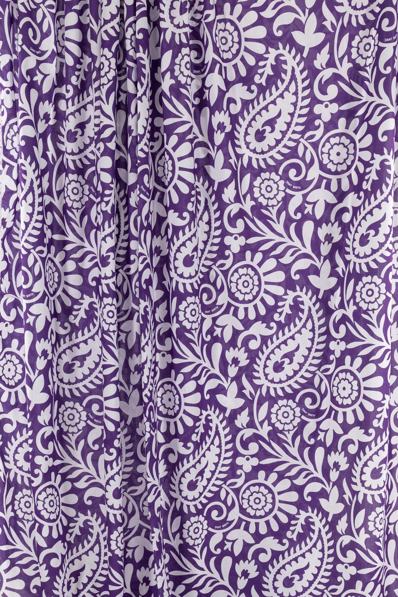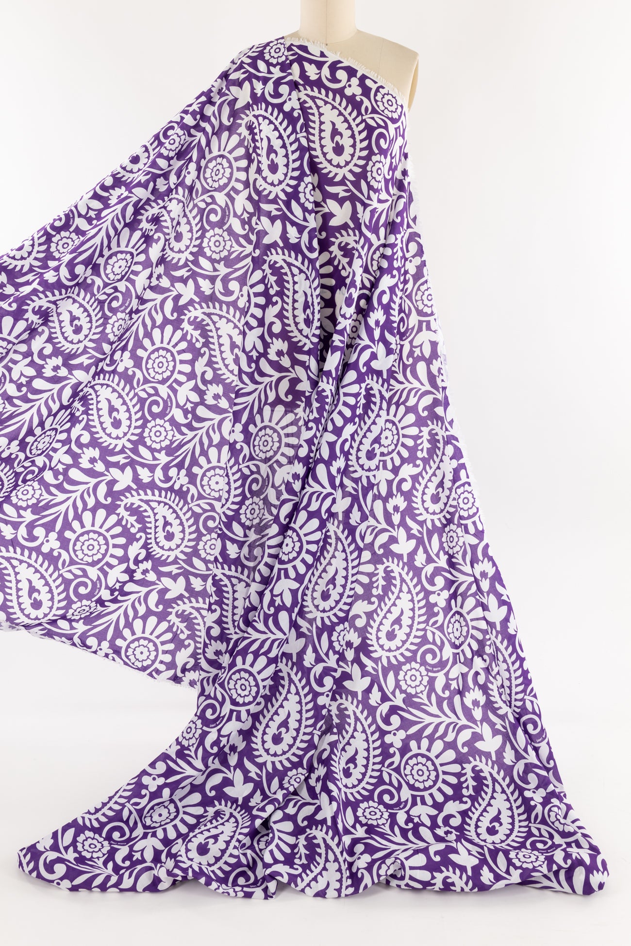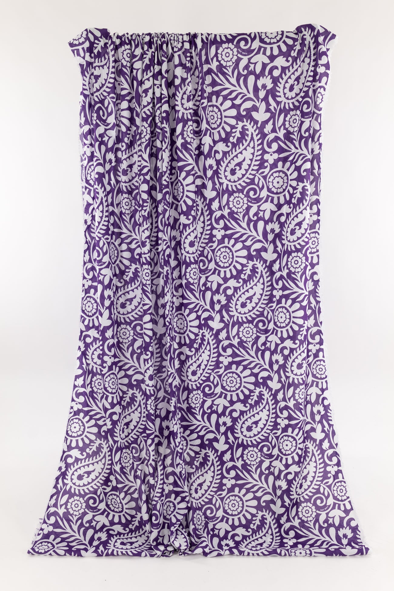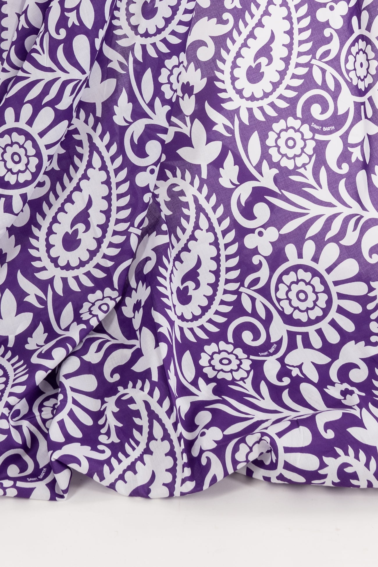 Dramatic purple paisleys printed on white cotton lawn, fine deadstock from boho chic brand MC2 Saint Barth, milled in Italy. Light shirting weight, with an appealing smooth hand, a 17" repeat, and soft drape. Right for a dress, shirt, tunic, skirt, caftan, kimono, or children's.