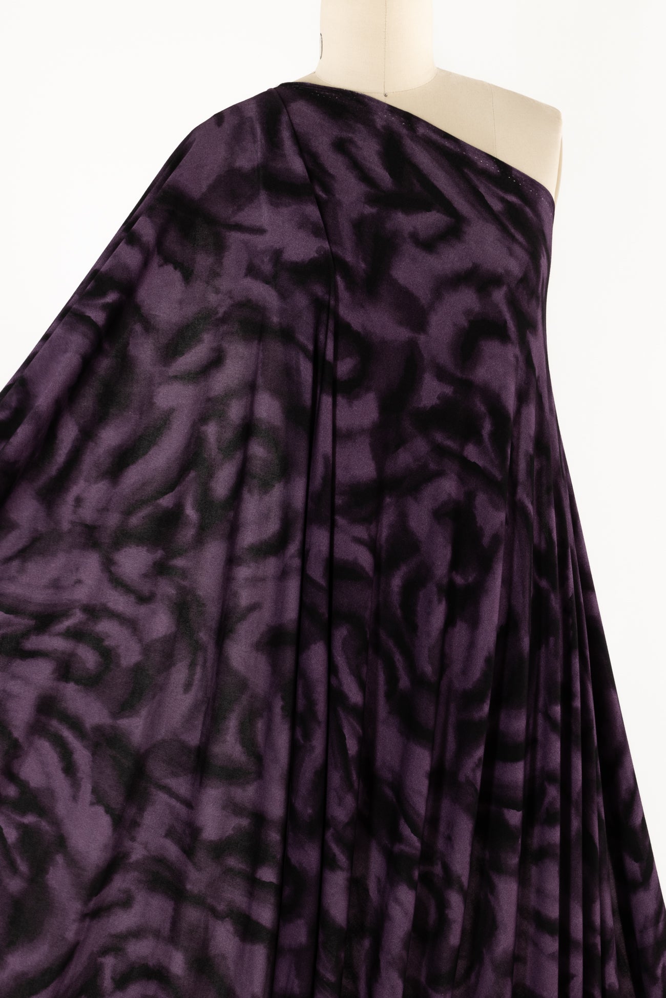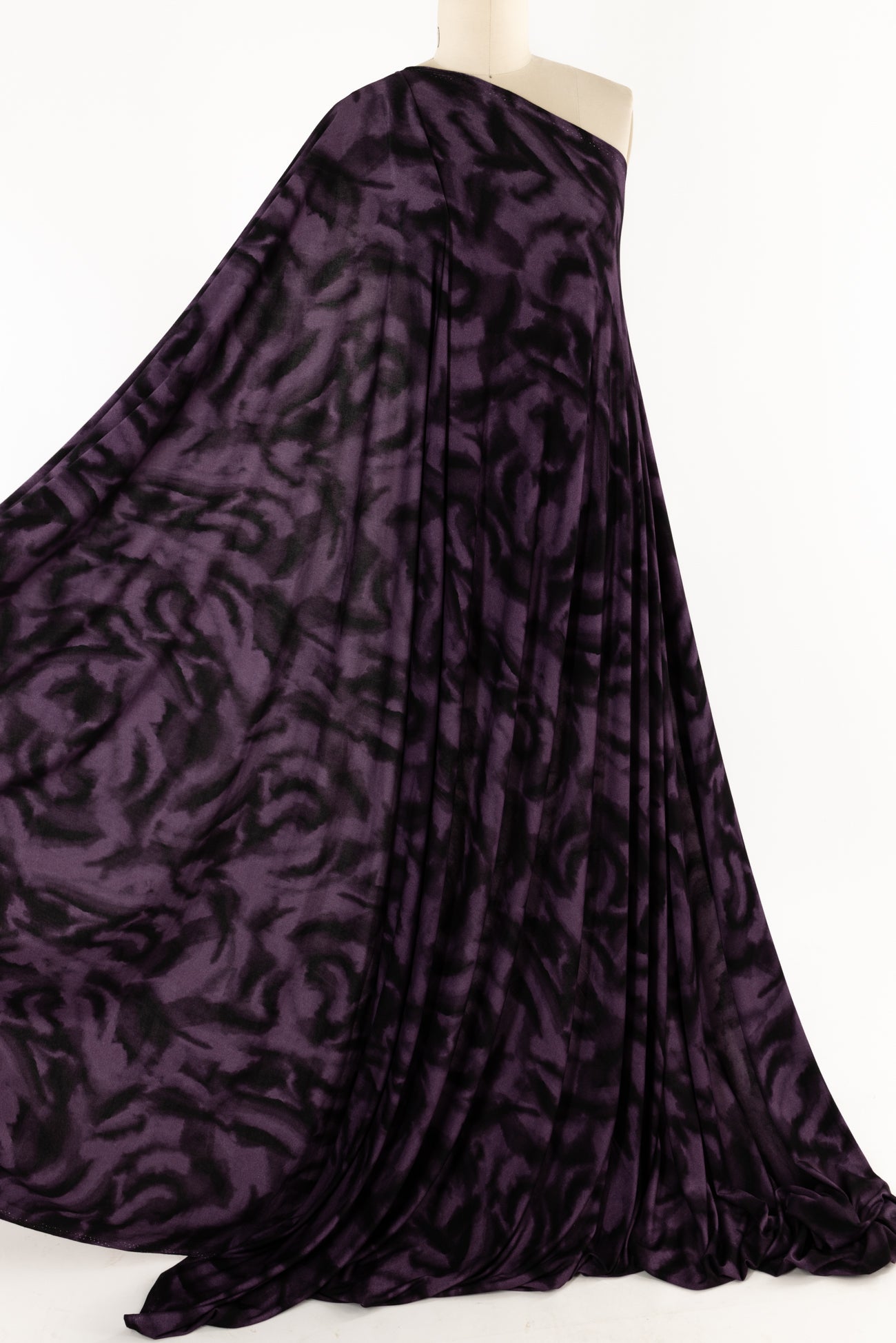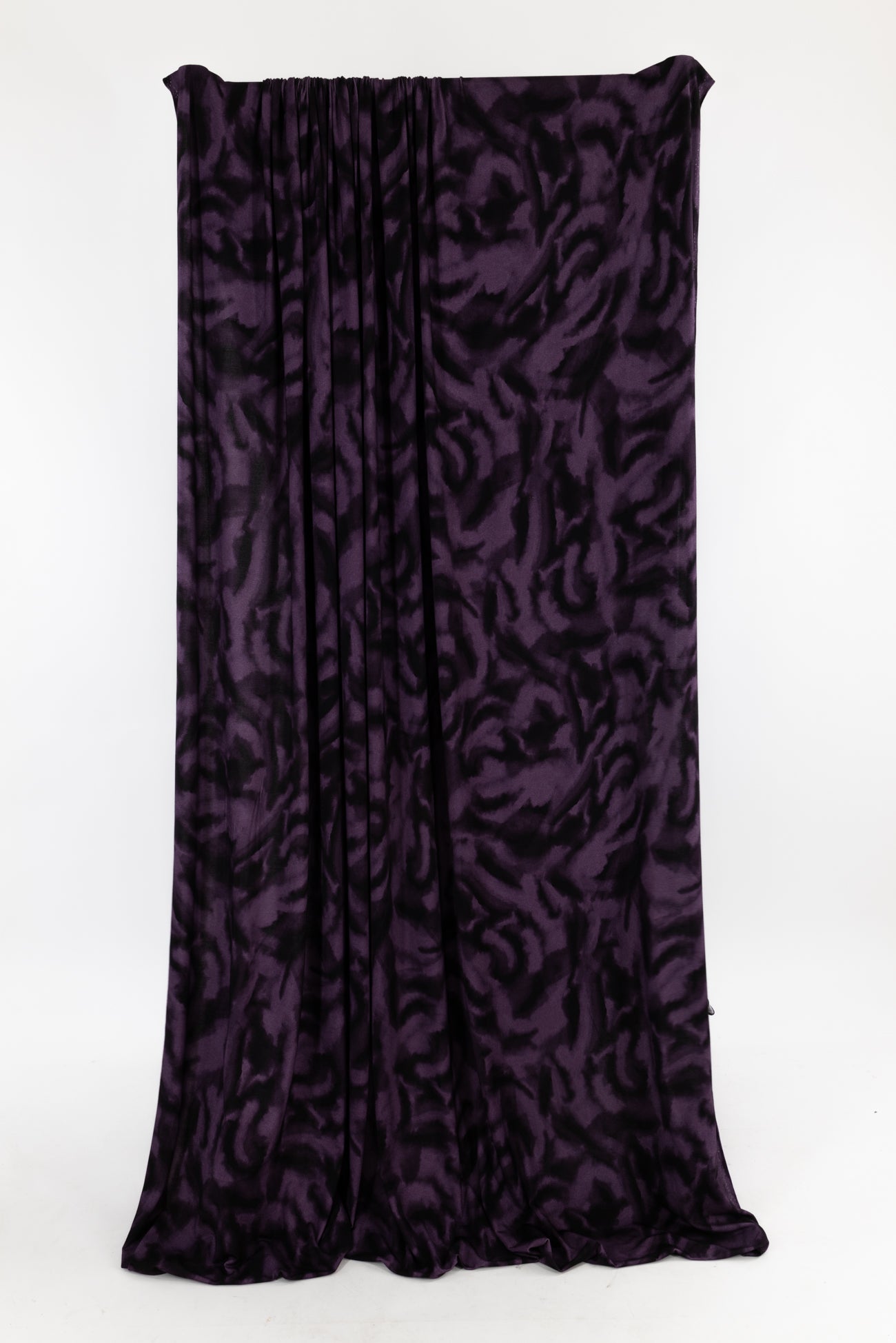 Abstract swirls grace a black and purple rayon knit. Dramatic deadstock produced for LA designer Katrin Noon. Mid-weight, with good 4-way stretch and recovery, a soft smooth hand, soft drape, 29" repeat, and some rolling at the cut edge. Right for a top, t-shirt, tunic, dress, skirt, soft pant, kimono, caftan, loungewear, men's, or children's.
