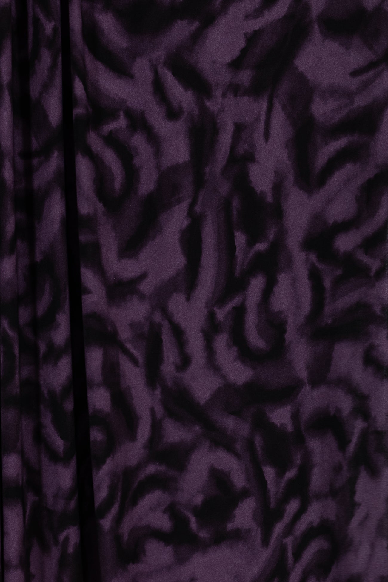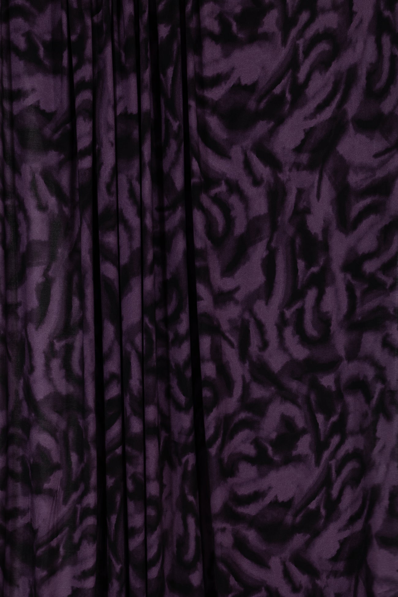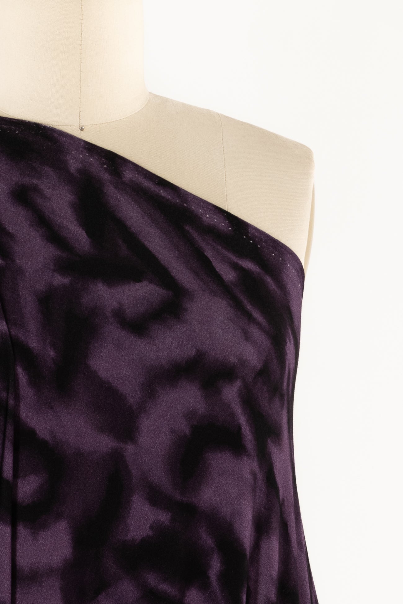 Abstract swirls grace a black and purple rayon knit. Dramatic deadstock produced for LA designer Katrin Noon. Mid-weight, with good 4-way stretch and recovery, a soft smooth hand, soft drape, 29" repeat, and some rolling at the cut edge. Right for a top, t-shirt, tunic, dress, skirt, soft pant, kimono, caftan, loungewear, men's, or children's.