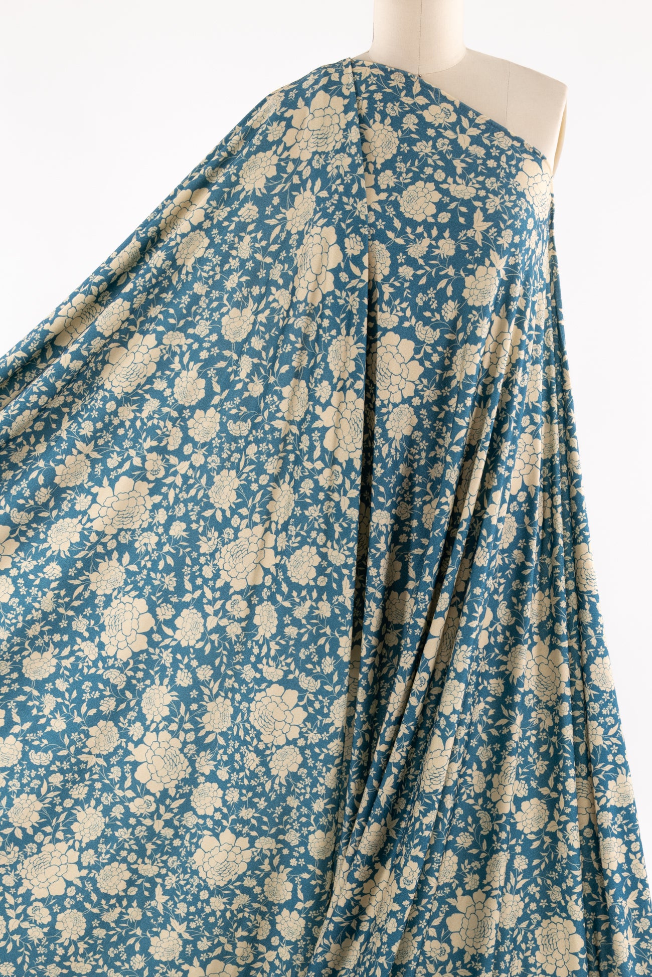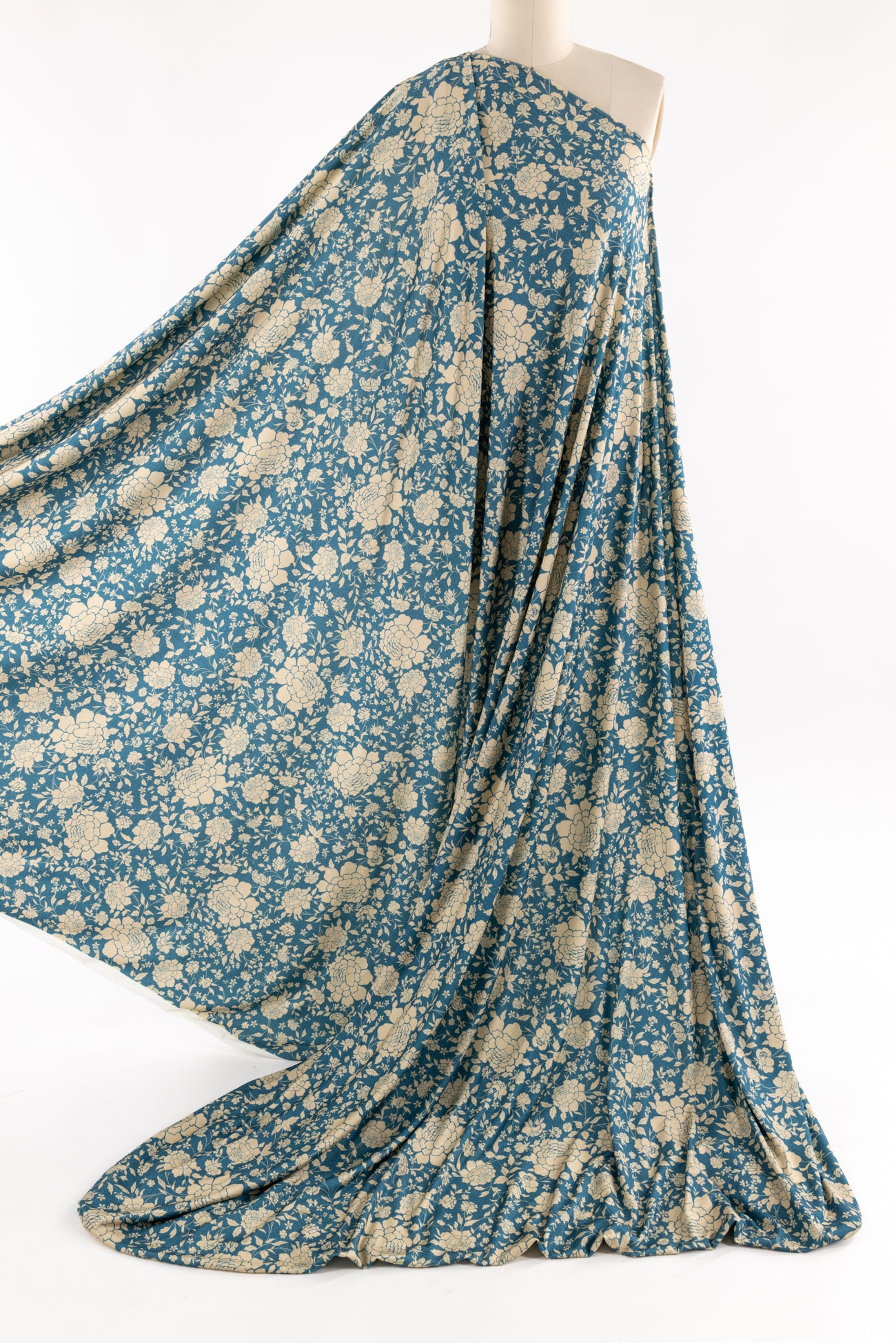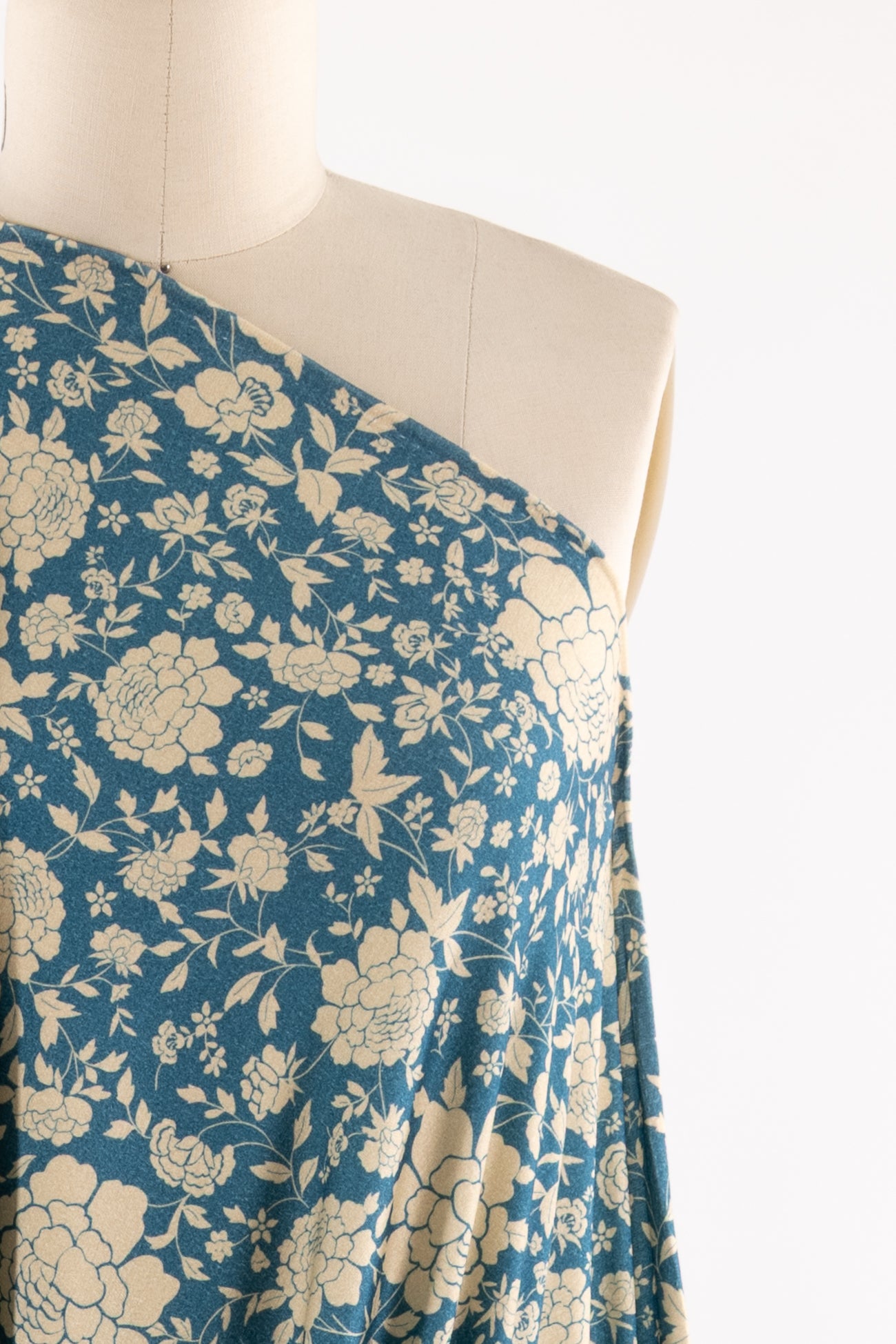 Modern spin on a classic Liberty-esque floral in blue and ivory, deadstock from LA designer, Novella Royale (who recently closed their 16 year business). Beautiful quality and weight rayon/spandex jersey - has just a touch more weight than most, opaque, with a soft, smooth, matte hand, 4 way stretch, minimal rolling at the cut edge. Right for a dress, skirt, tunic, t-shirt, soft pants, leggings, caftan, kimono, jumpsuit. One way design, 18" repeat.