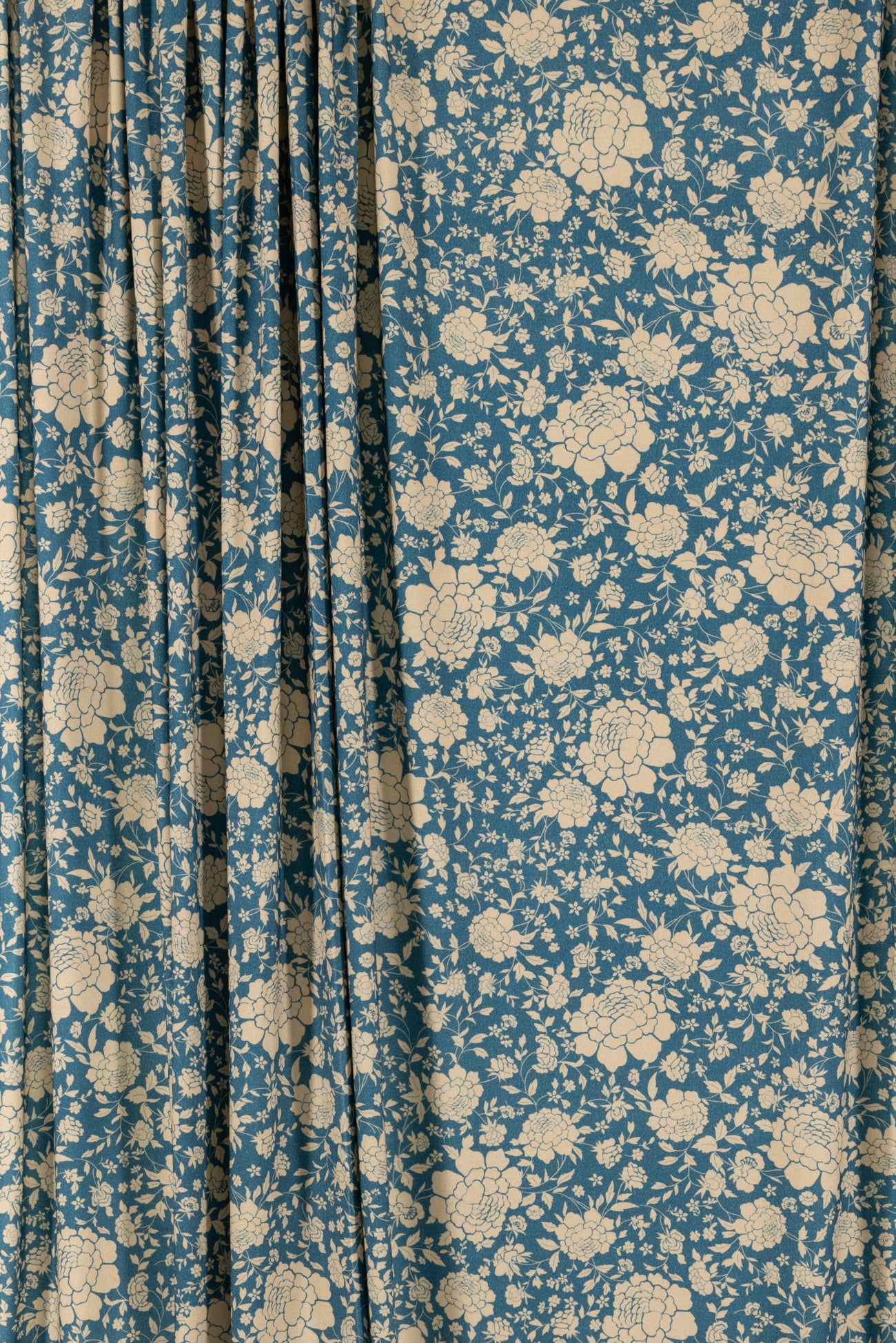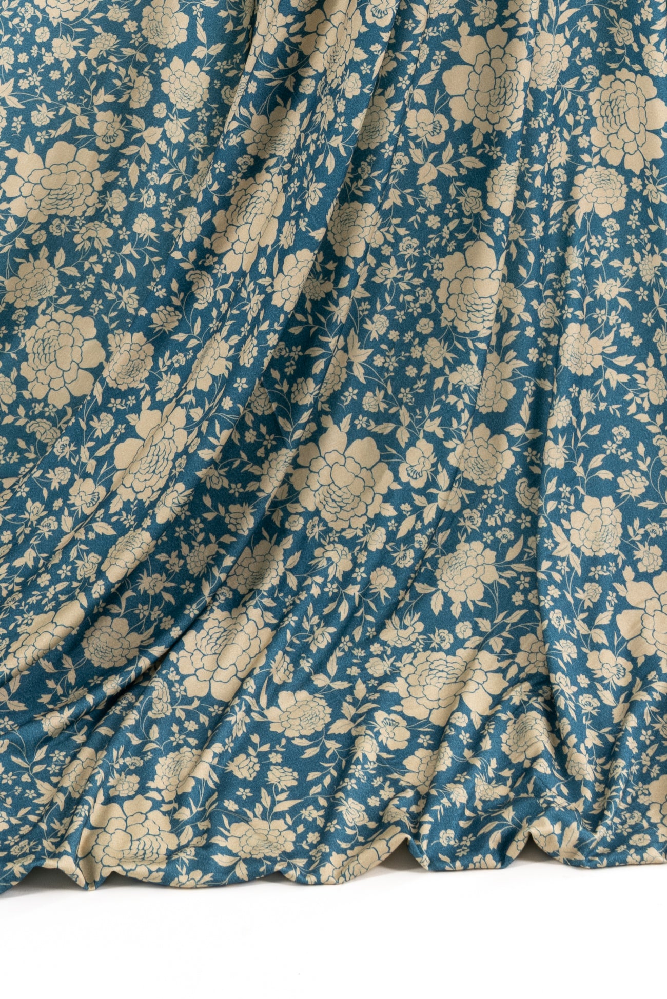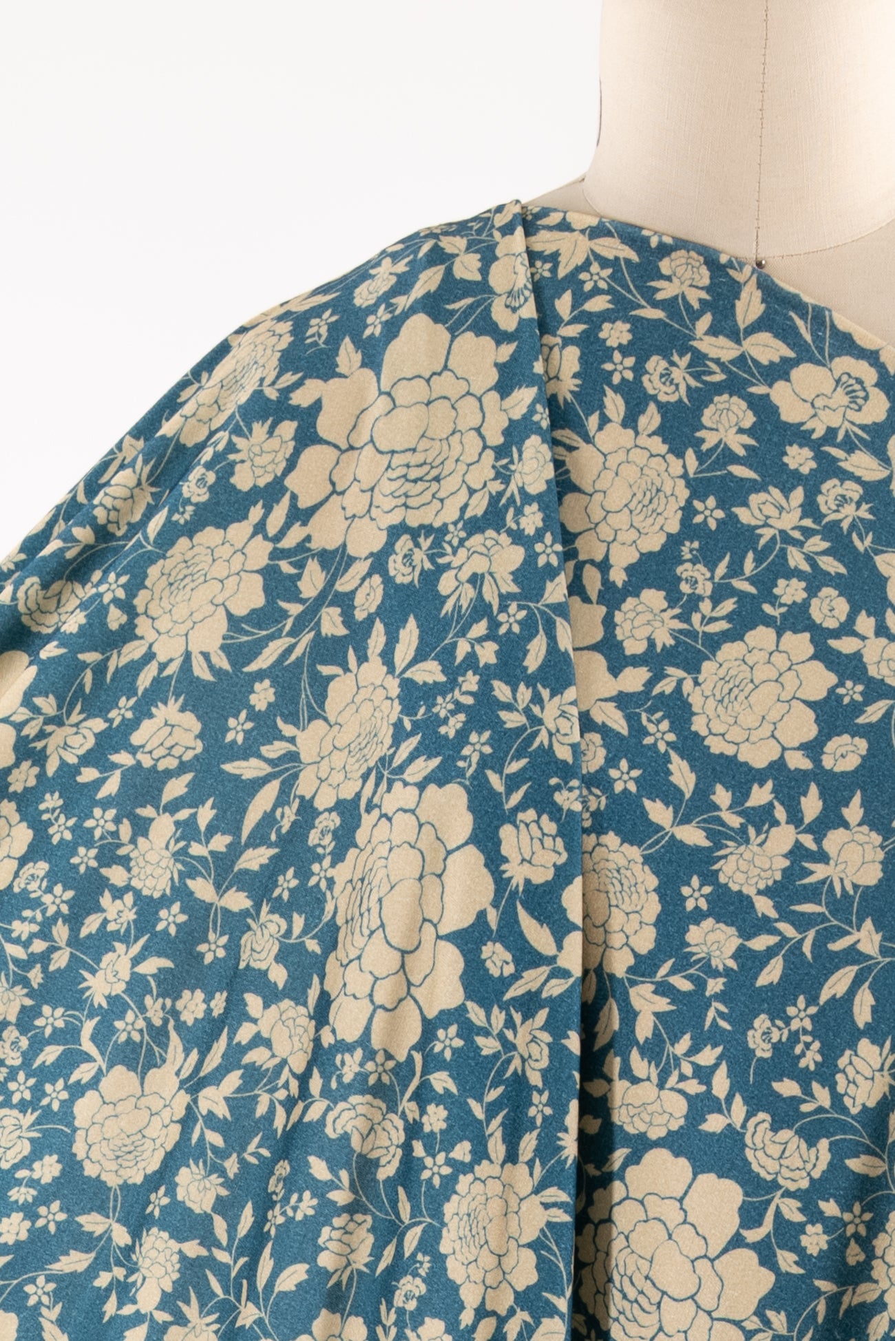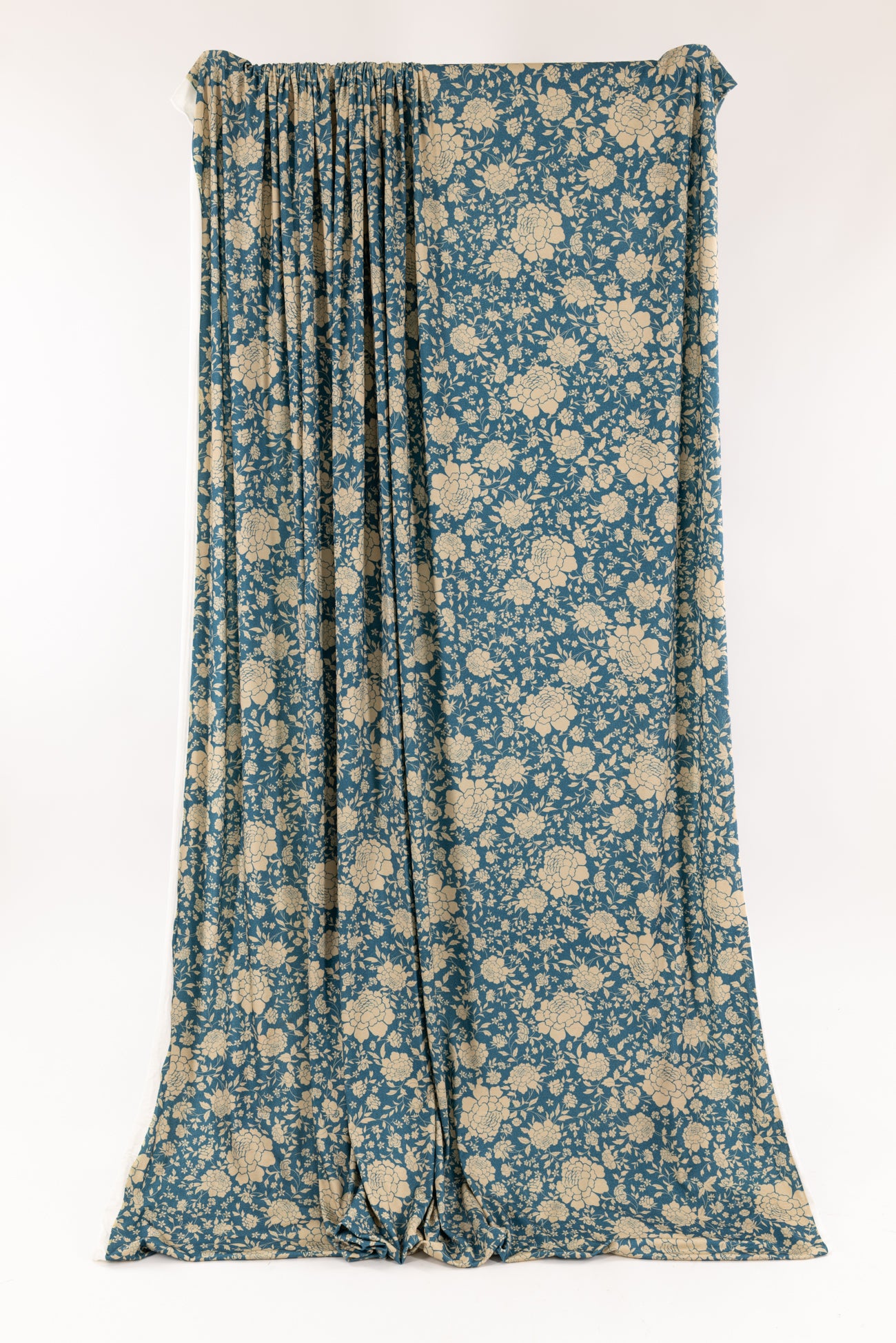 Modern spin on a classic Liberty-esque floral in blue and ivory, deadstock from LA designer, Novella Royale (who recently closed their 16 year business). Beautiful quality and weight rayon/spandex jersey - has just a touch more weight than most, opaque, with a soft, smooth, matte hand, 4 way stretch, minimal rolling at the cut edge. Right for a dress, skirt, tunic, t-shirt, soft pants, leggings, caftan, kimono, jumpsuit. One way design, 18" repeat.