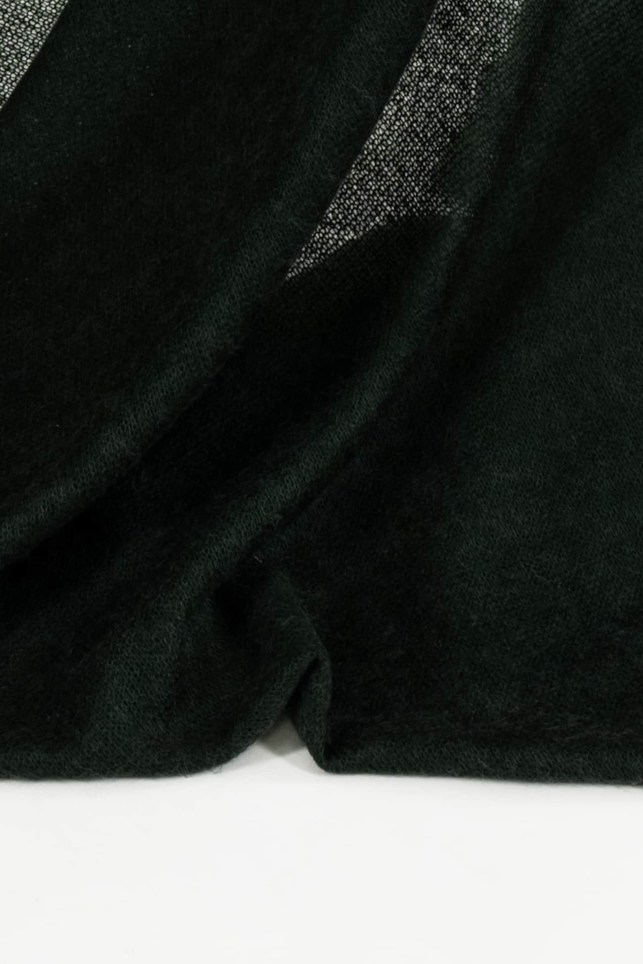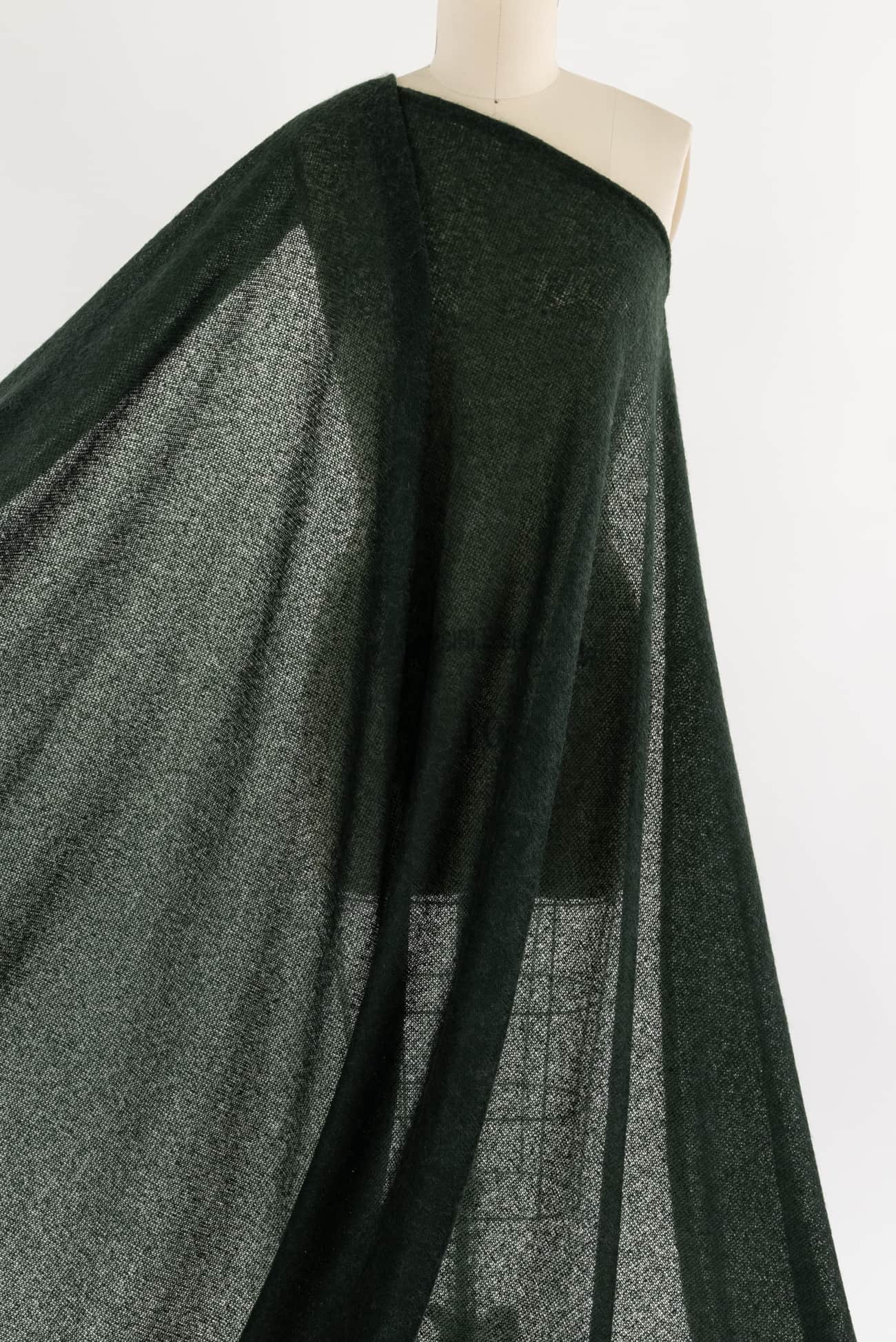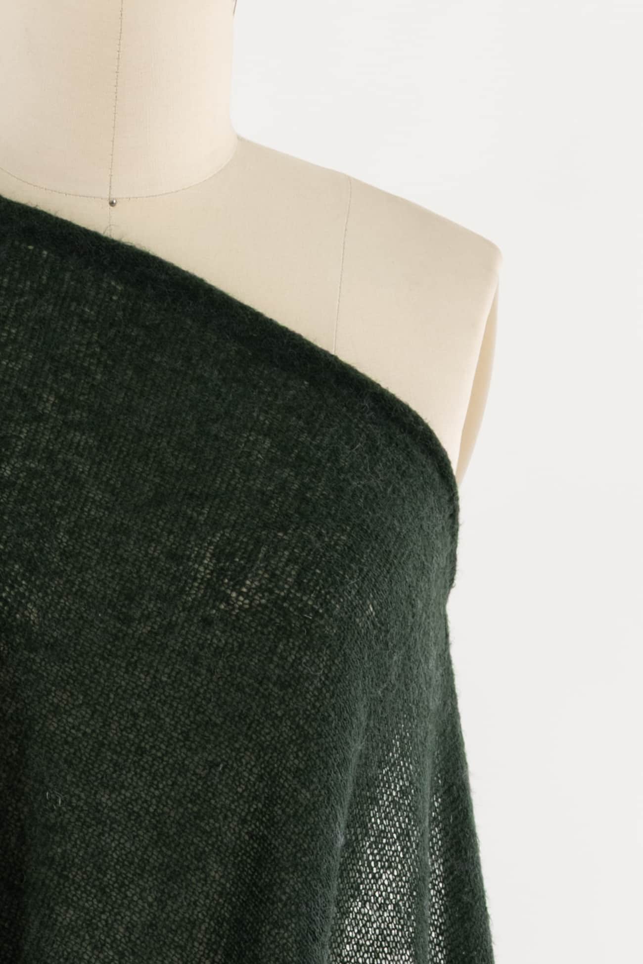 Soft and cozy racing green acrylic blend sweater knit, deadstock from a New York designer. Lightweight with a softly textured, loosely knit hand, easy drape, crosswise stretch, some recovery and rolling at the cut edge. Right for a sweater, tunic, cardi, hoodie or vest. Limited quantity.