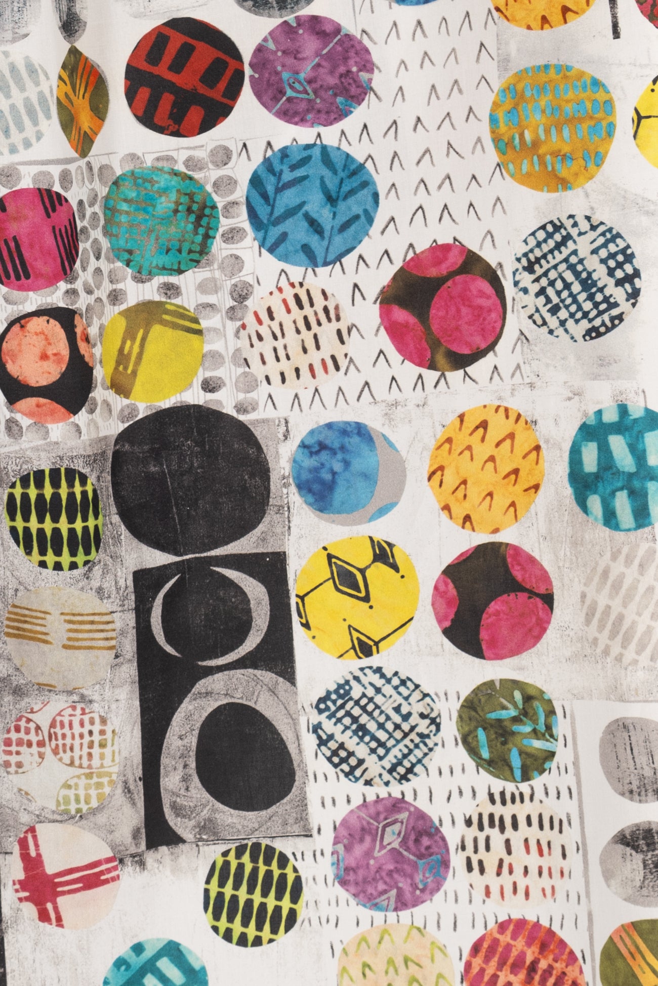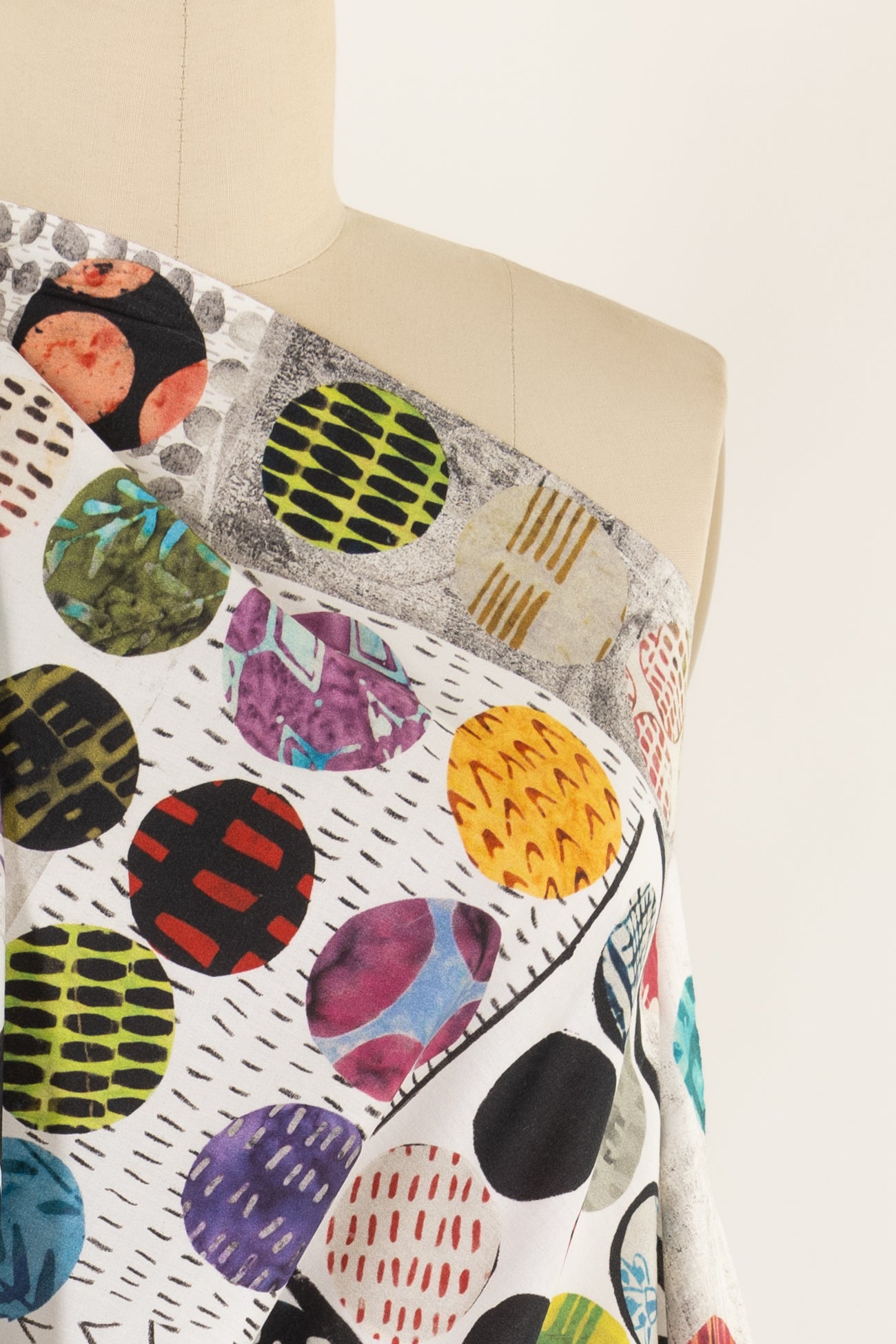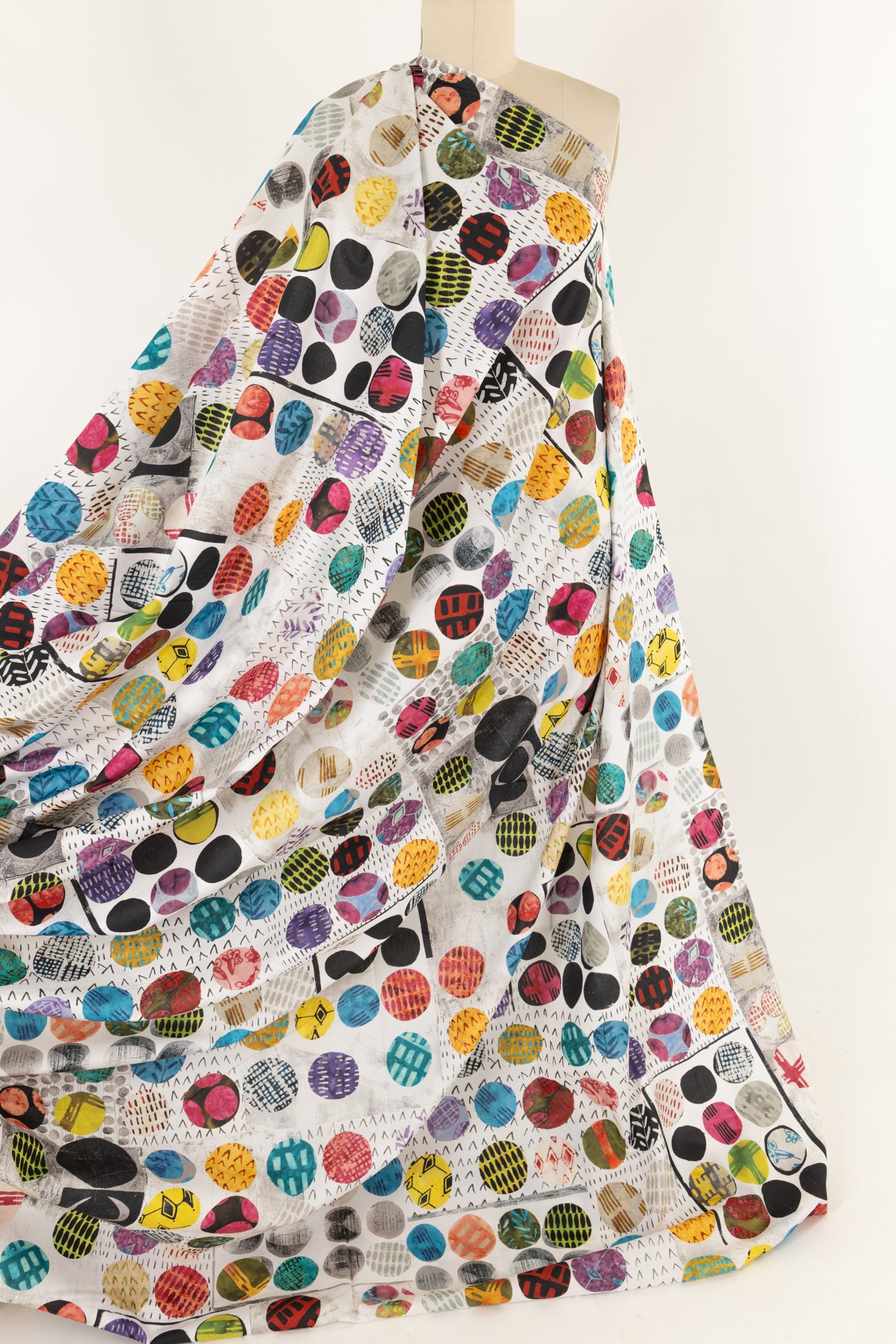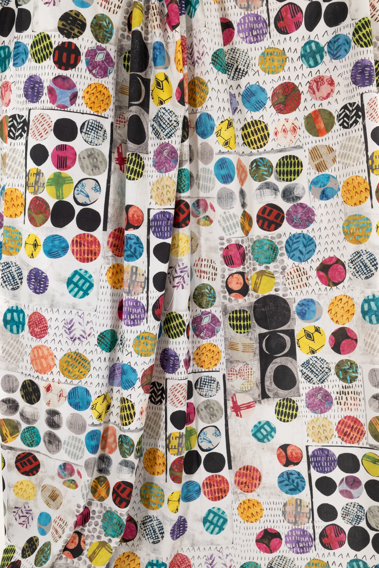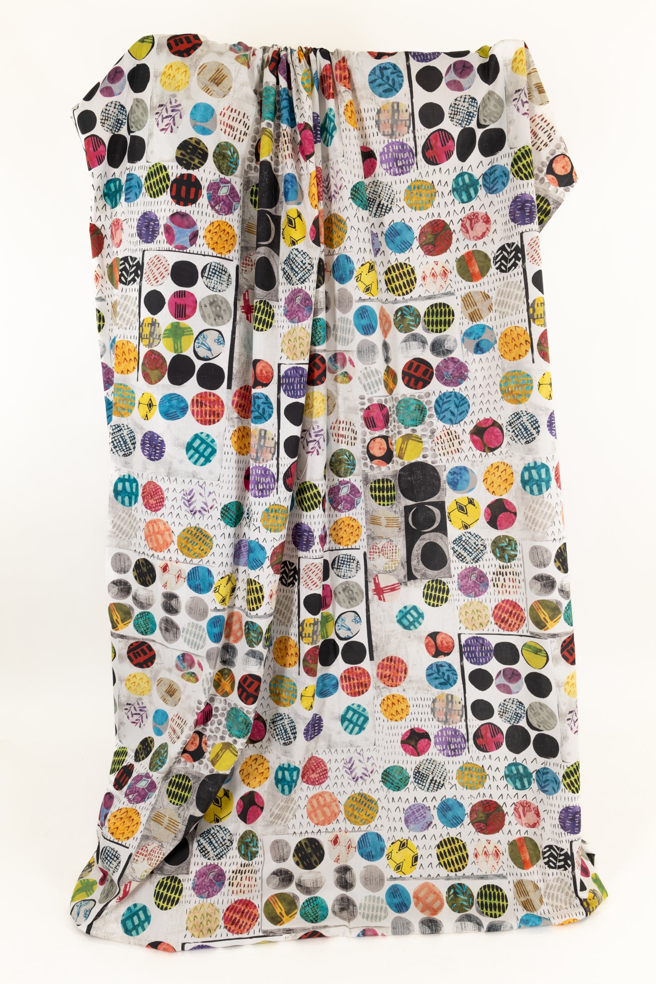 A delight of dots in a fresh and fabulous arrangement of color, design and form. The base fabric is a fine-grained shirting/quilting weight Oeko-Tex® cotton, with a soft smooth hand, soft drape, one-way design, and 45" repeat. Extra wide so it can be used as a quilt/duvet back, accessories, home dec and right for garments too: shirt, dress, skirt, light jacket, vest, soft pant, loungewear, kimono, children's or men's.