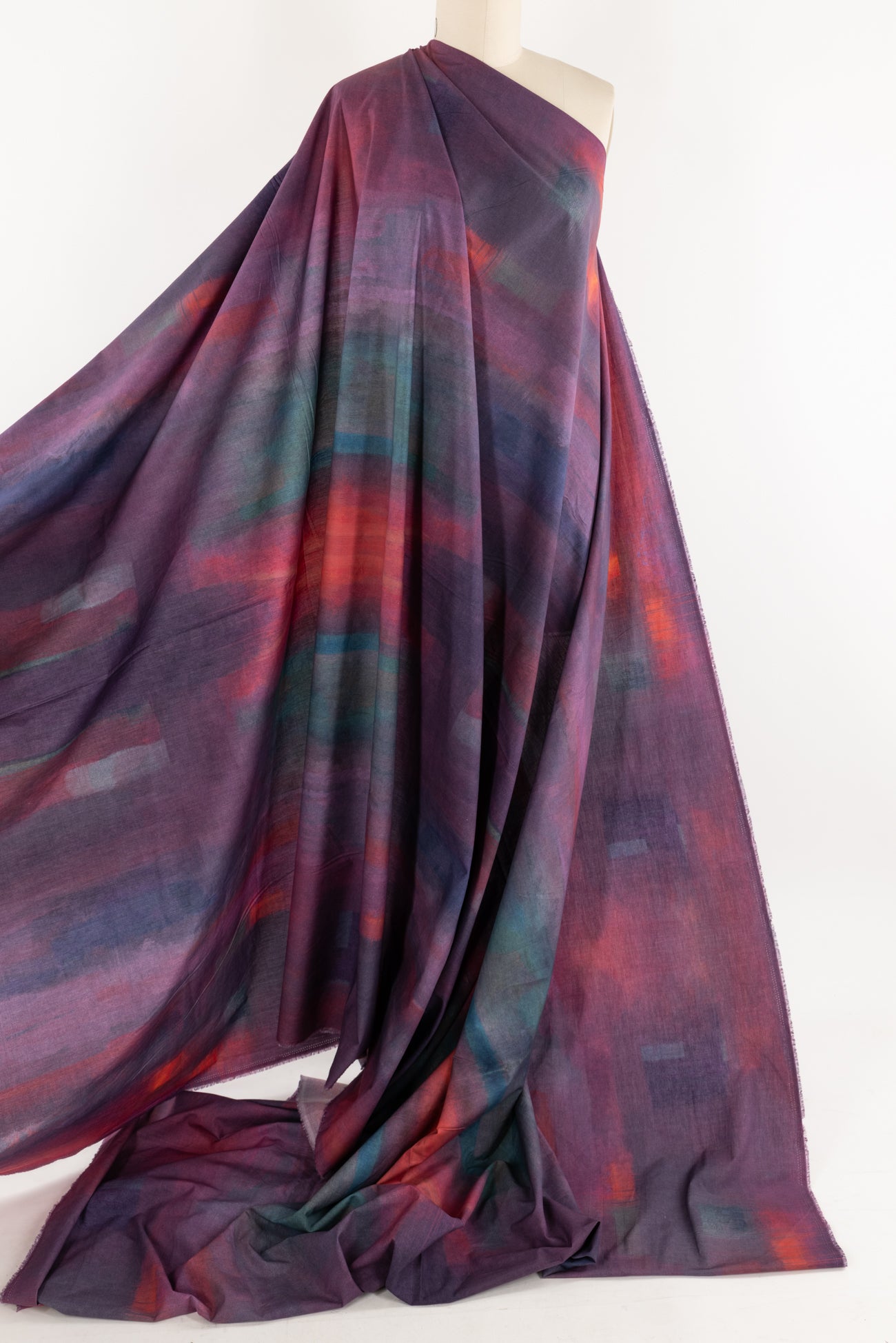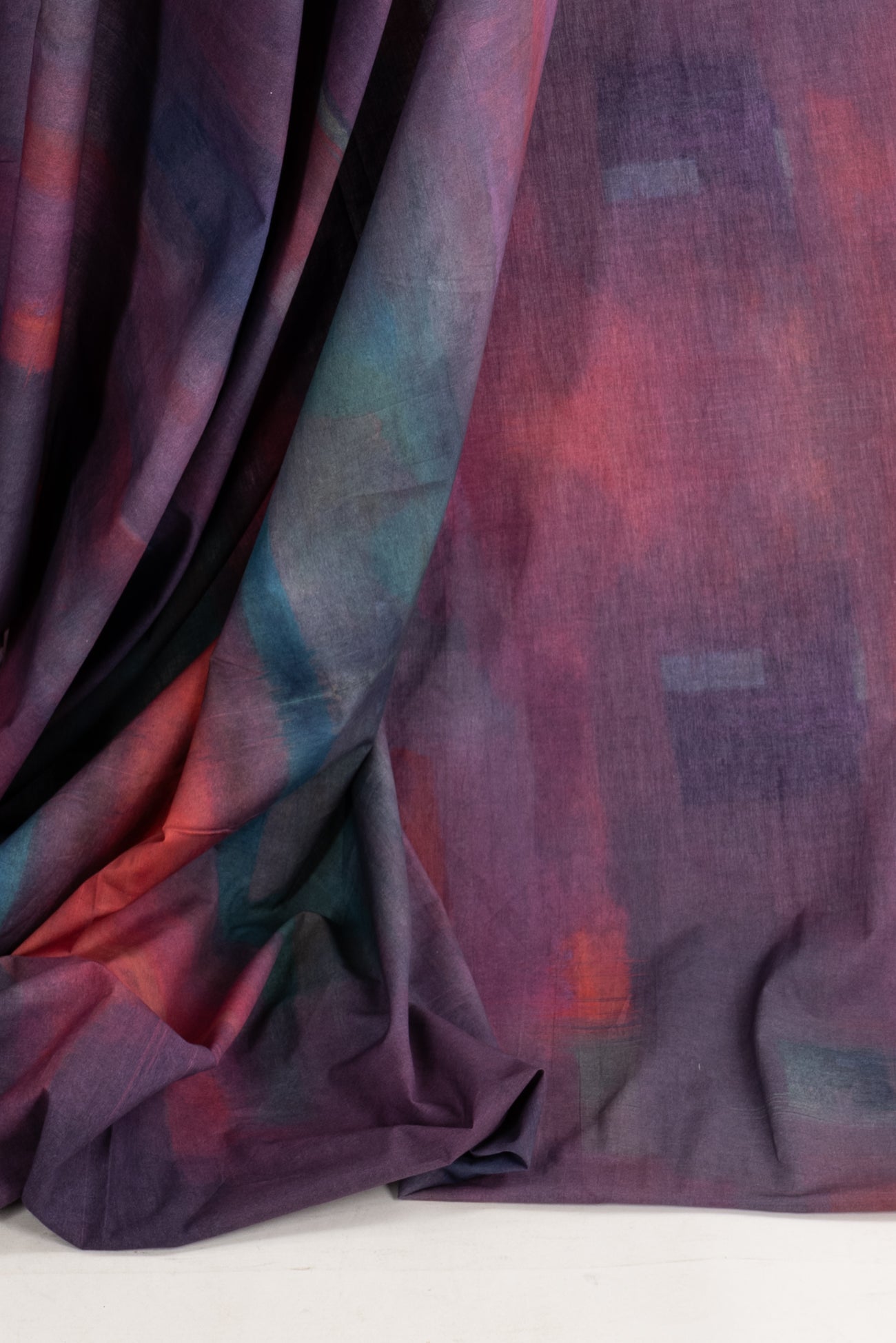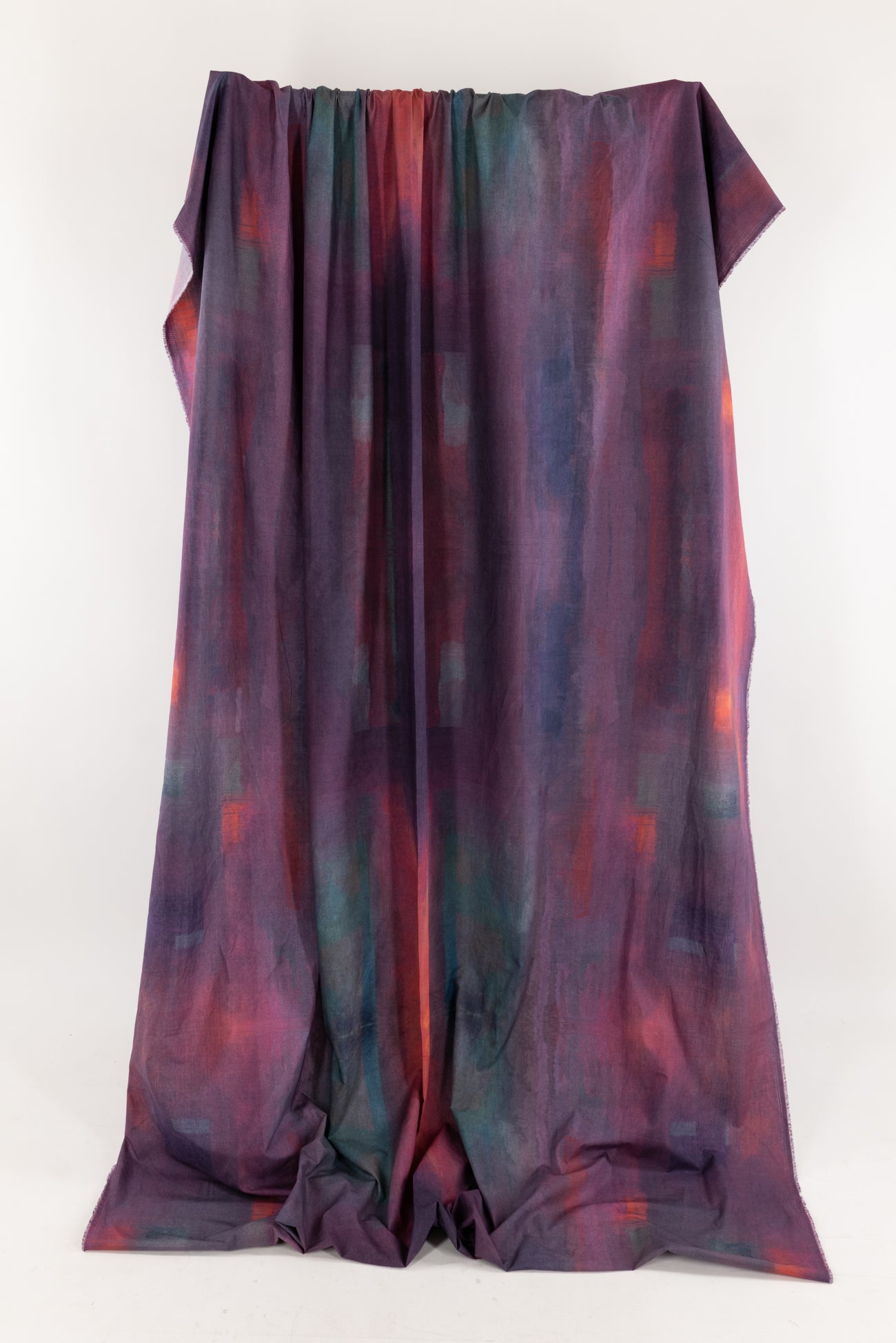 A stunning nuanced painterly mix of rich colors, overlaid with black. One-of-a-kind original abstract artwork is digitally printed on fine cotton poplin, produced for us in India. Light/shirting weight with a smooth hand, 41" repeat and light drape. Exceptional exclusive designs are right for a shirt, blouse, dress, caftan, kimono, soft pant, loungewear, men's, or children's.