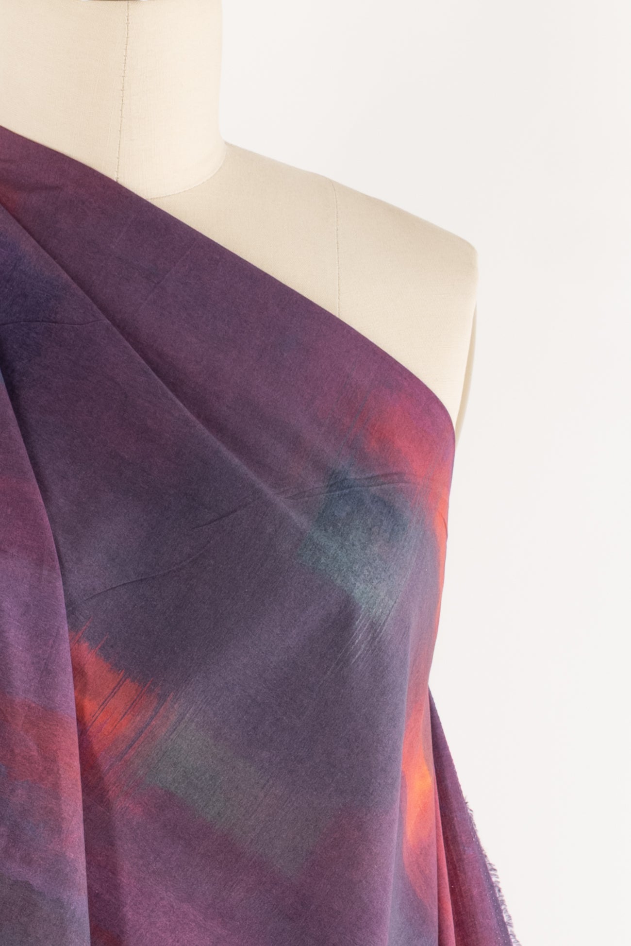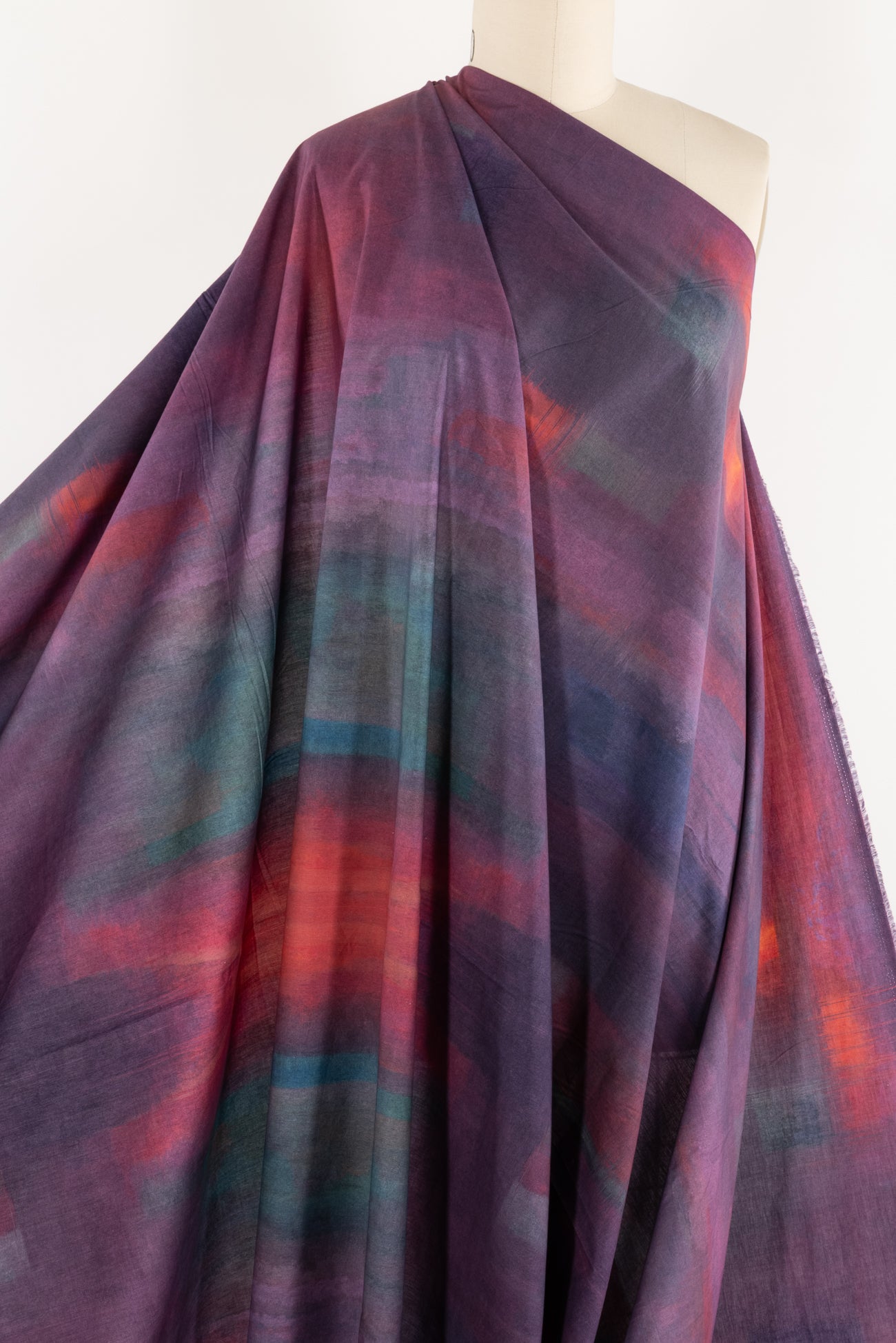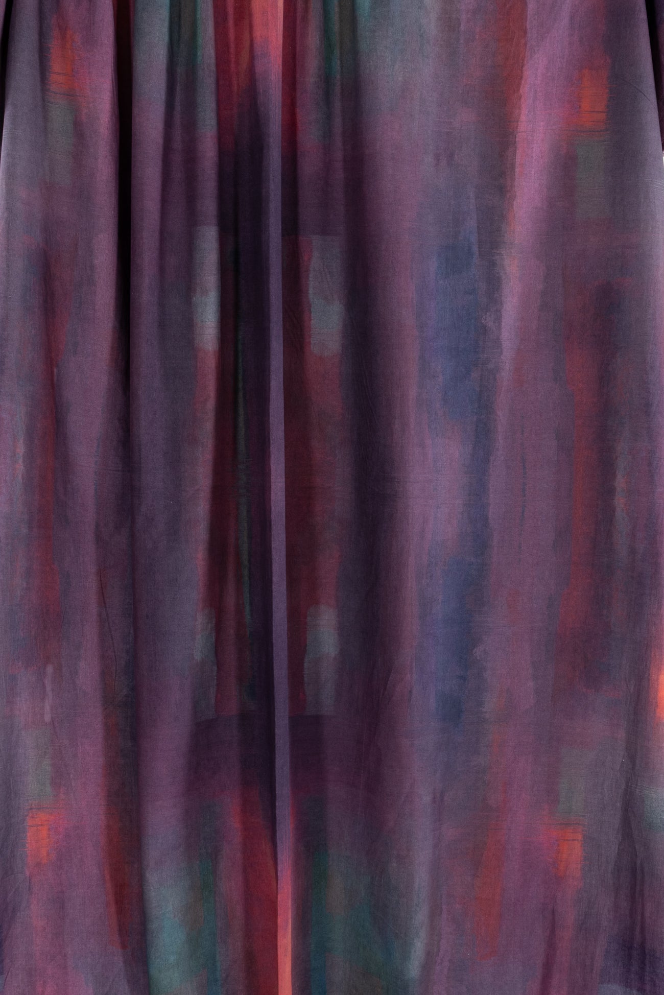 A stunning nuanced painterly mix of rich colors, overlaid with black. One-of-a-kind original abstract artwork is digitally printed on fine cotton poplin, produced for us in India. Light/shirting weight with a smooth hand, 41" repeat and light drape. Exceptional exclusive designs are right for a shirt, blouse, dress, caftan, kimono, soft pant, loungewear, men's, or children's.