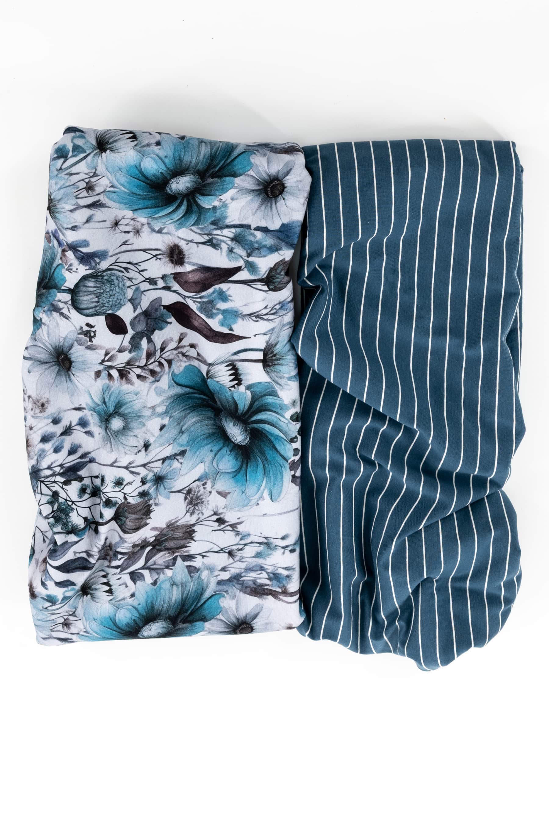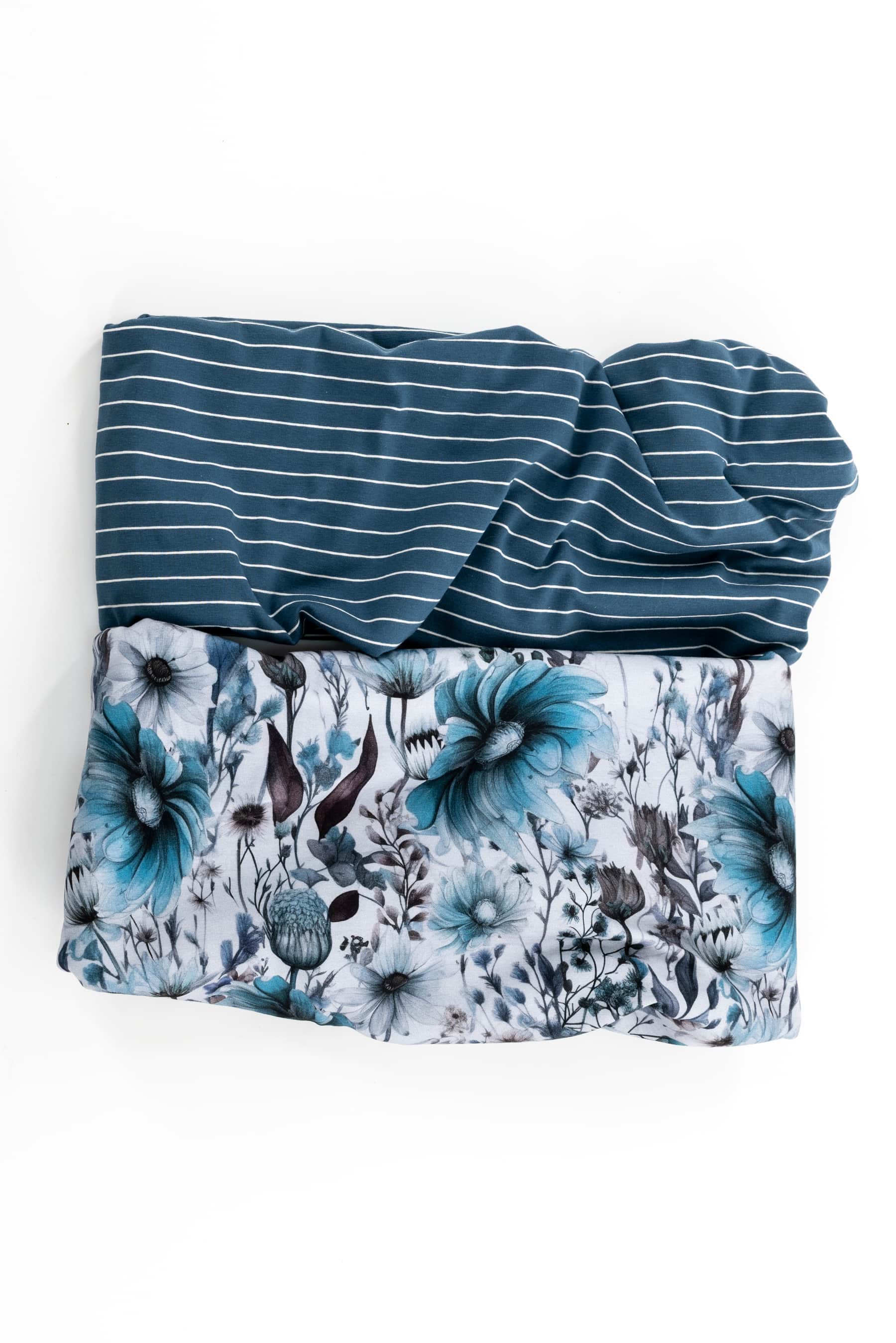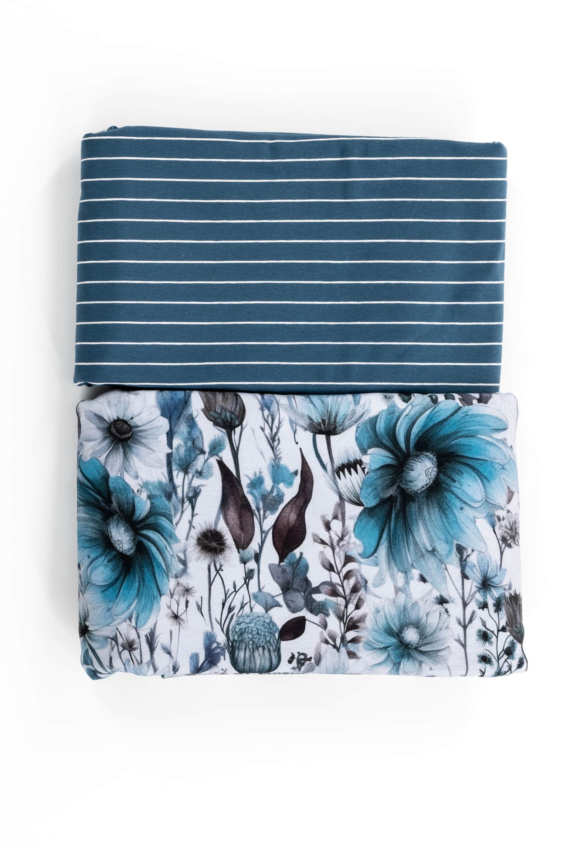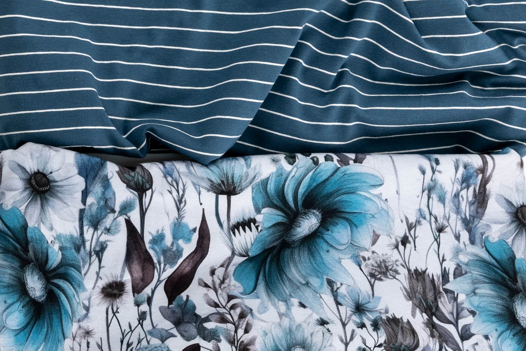 The RIVOLI combo combines two harmonious knits; a study in blues, a floral European digital cotton/spandex knit that combines well with a blue and white cotton/spandex stripe. The two fabrics harmonize and blend beautifully together. Buttery soft with a liquid drape, four-way stretch and just a touch of rolling at the cut edge. The light/mid-weight is right for a top, t-shirt, tunic, cardi, hoodie, dress or skirt.