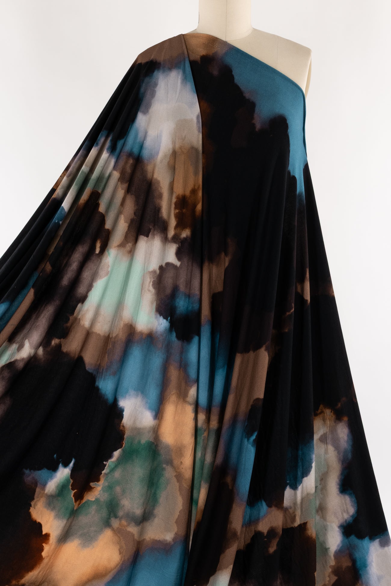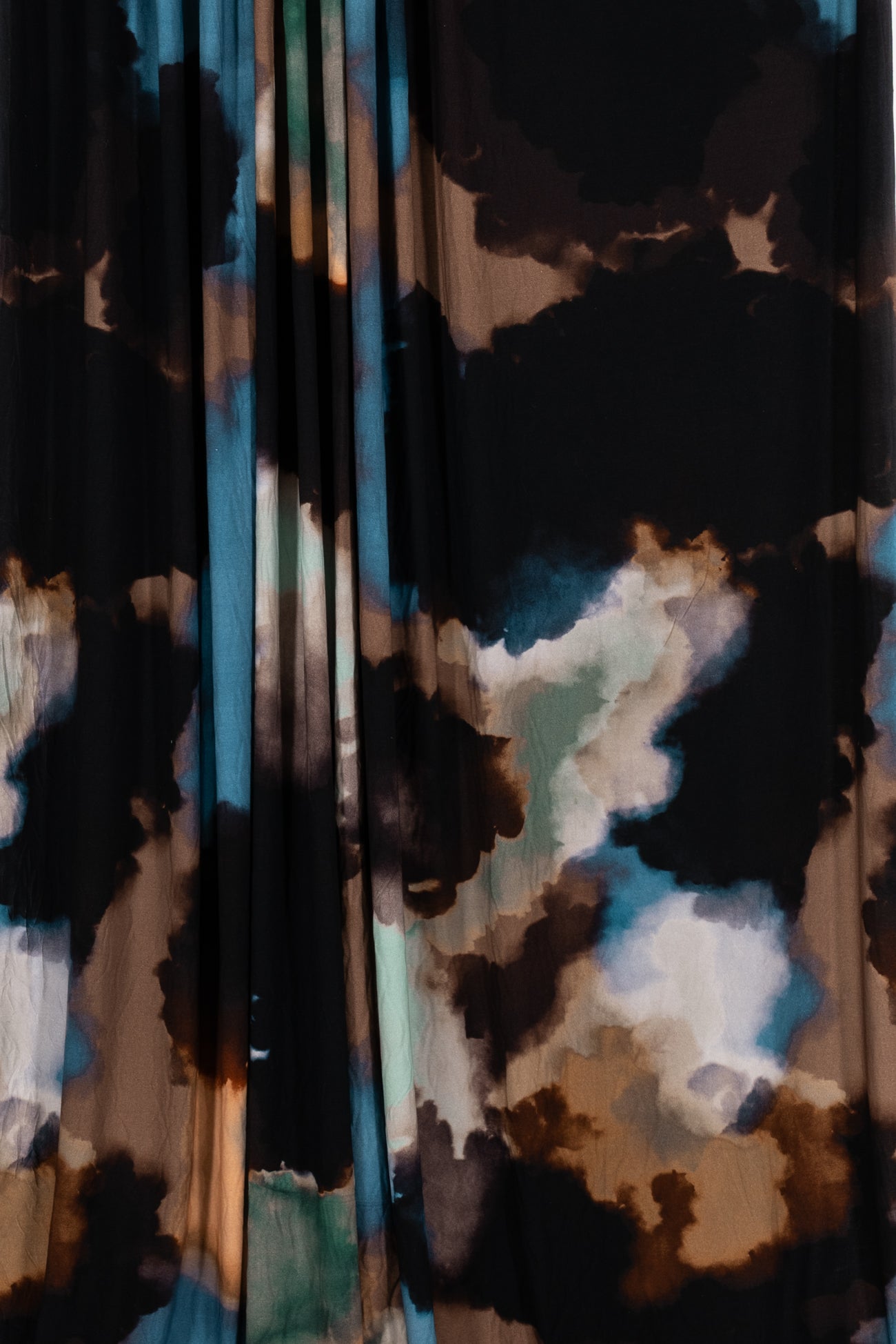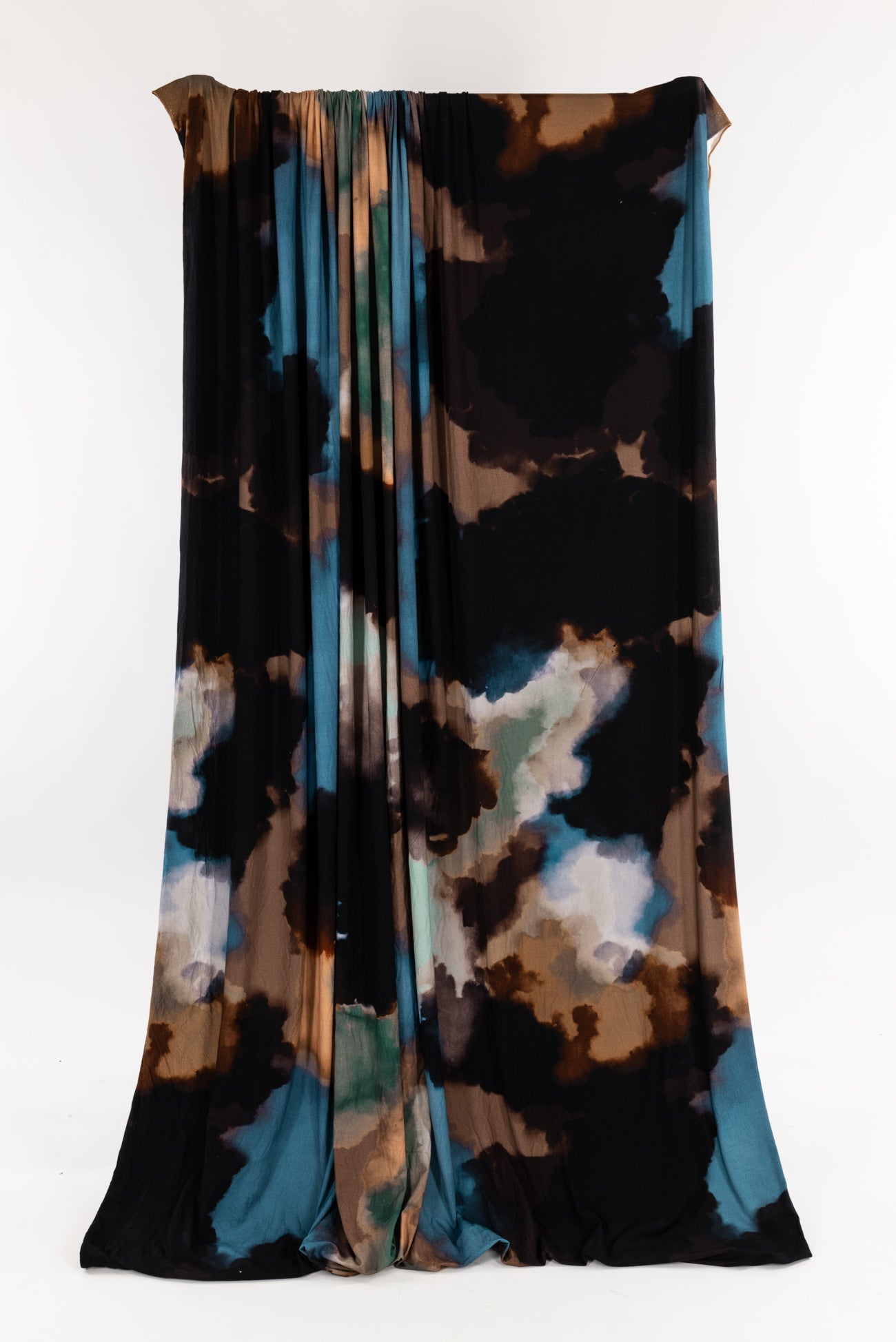 Dramatic hand-painted abstract in black, brown, and blue on a beautiful rayon/lycra knit. Fine quality deadstock from LA designer Spirithouse. Lightweight, stable, opaque with 4-way stretch, a smooth hand, 50" repeat, and some rolling at the cut edge. Right for a top, t-shirt, tunic, dress, loungewear, caftan, or men's. Limited quantity available.