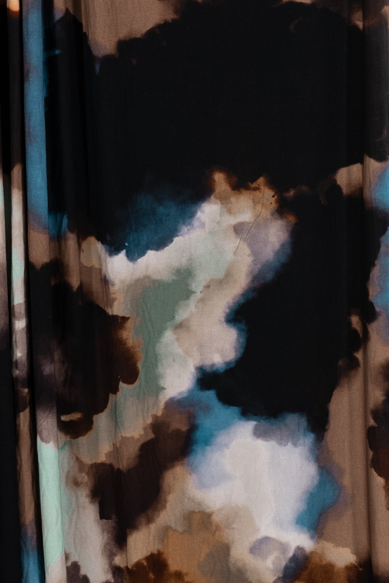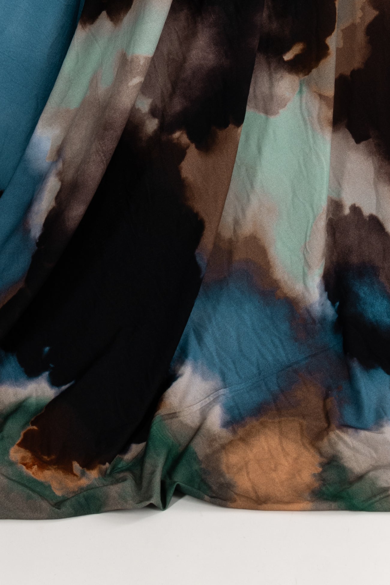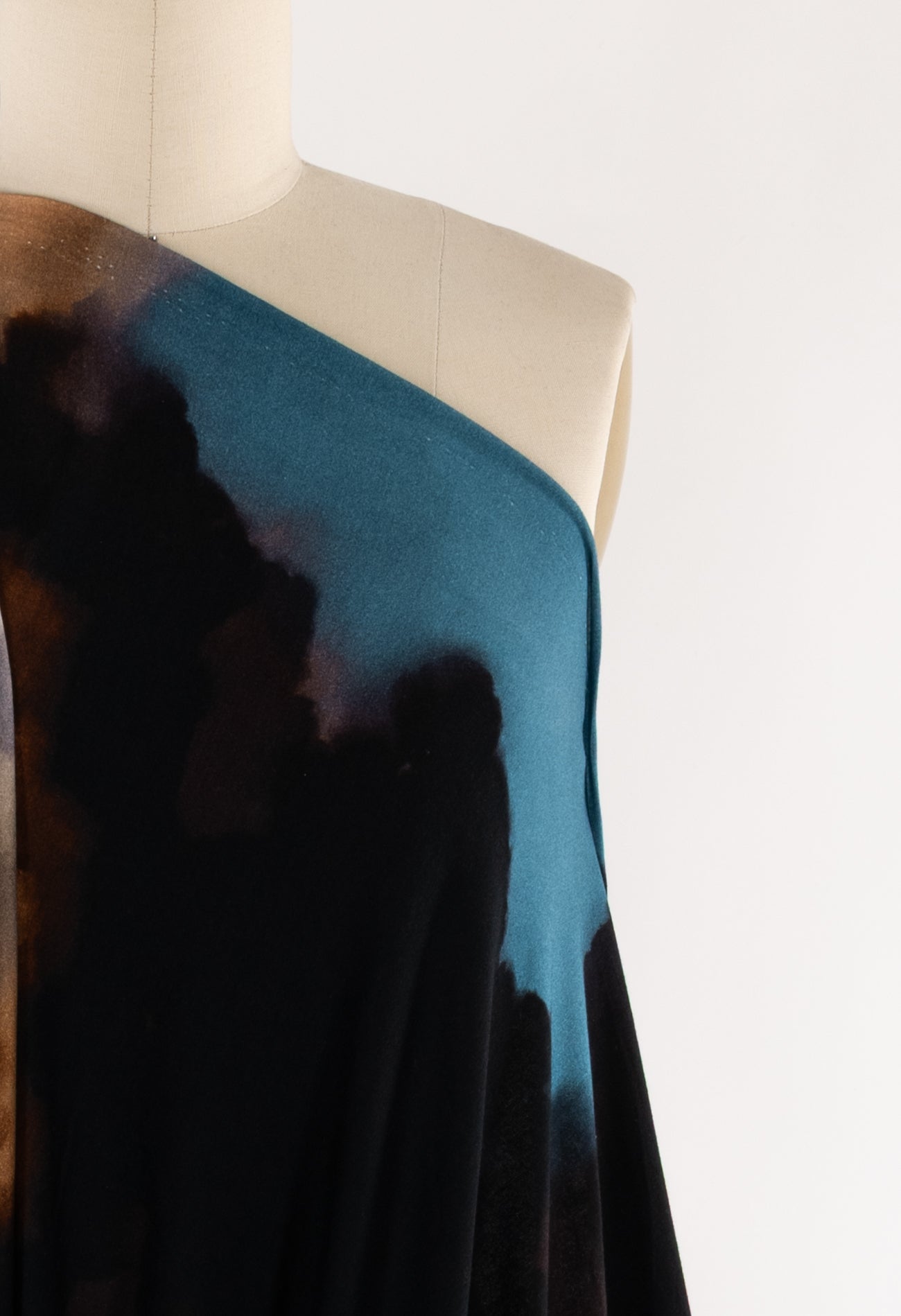 Dramatic hand-painted abstract in black, brown, and blue on a beautiful rayon/lycra knit. Fine quality deadstock from LA designer Spirithouse. Lightweight, stable, opaque with 4-way stretch, a smooth hand, 50" repeat, and some rolling at the cut edge. Right for a top, t-shirt, tunic, dress, loungewear, caftan, or men's. Limited quantity available.